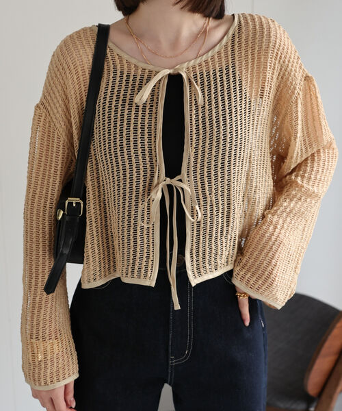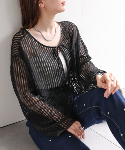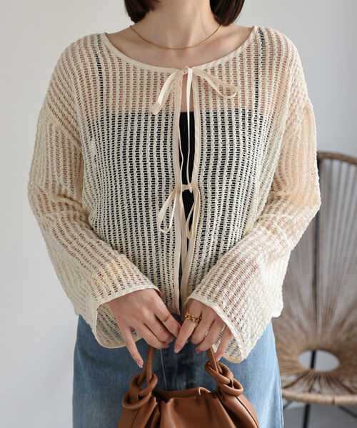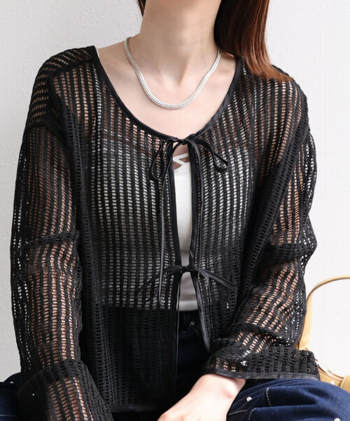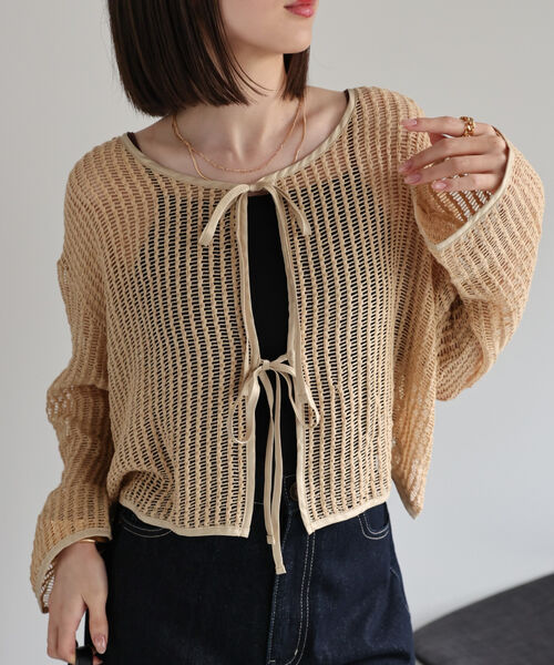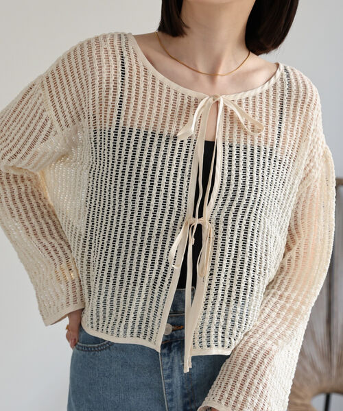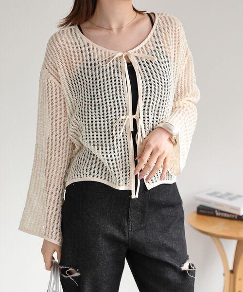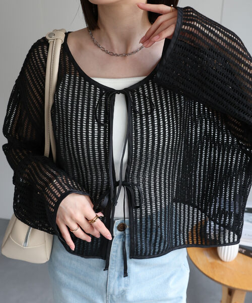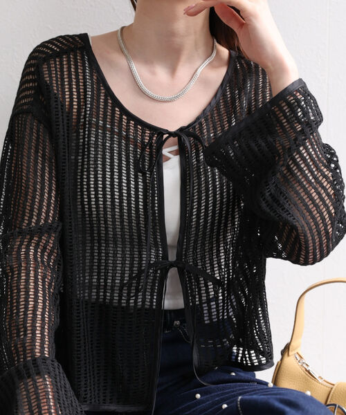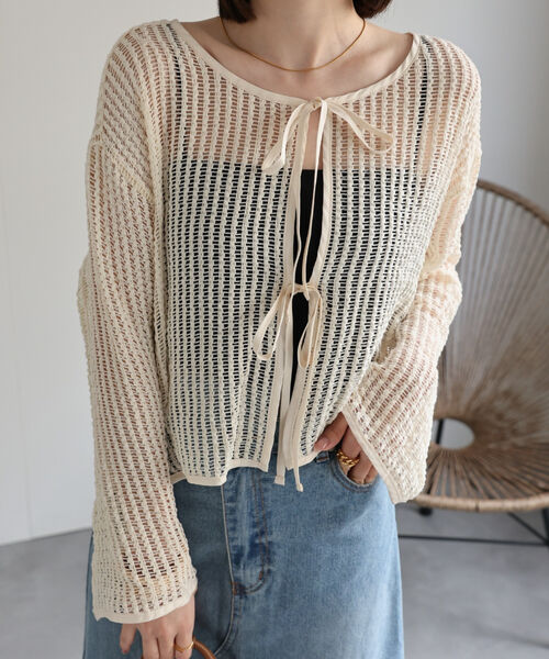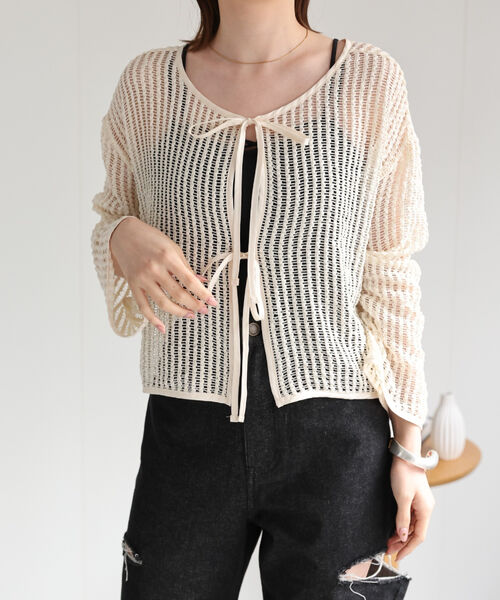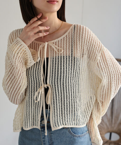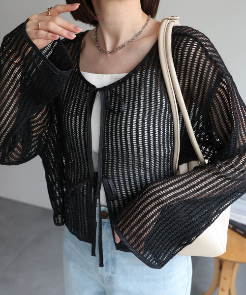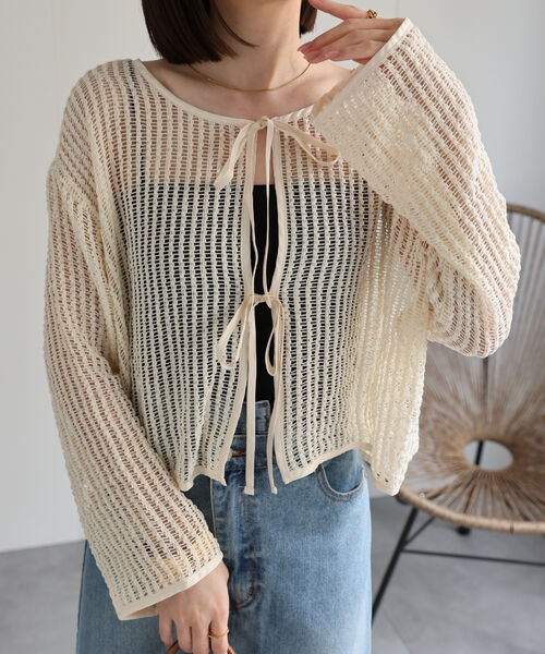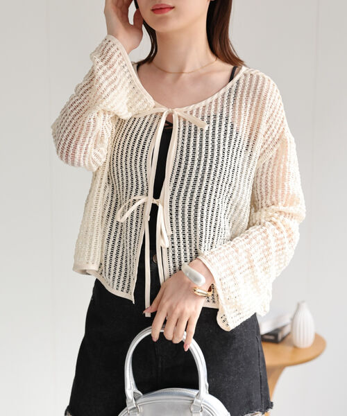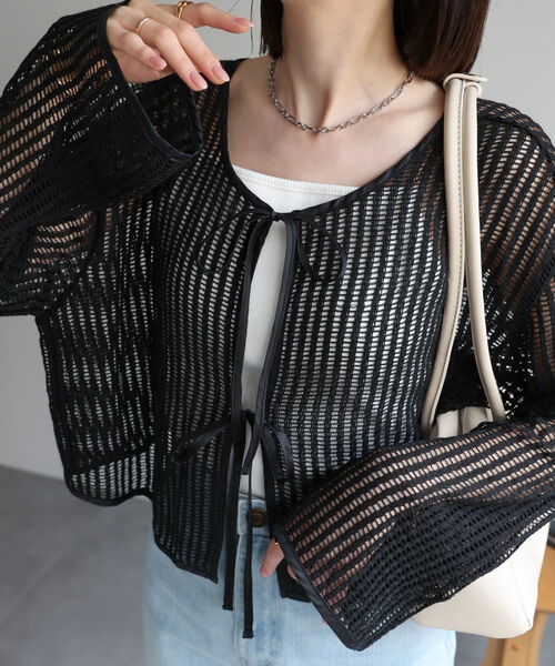 【前後2WAY】透かし/メッシュレース リボン付き ショートカーディガン