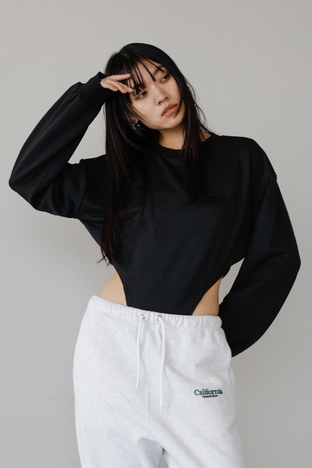 ボディ部分が一体化した仕様で、着用中のずれを防ぎ美しいシルエットをキープできる優秀アイテム。 裾にはスナップボタンを採用し、着脱しやすい実用的なデザイン。 程よい厚みのスウェット生地は、なめらかなタッチで肌あたりも快適。