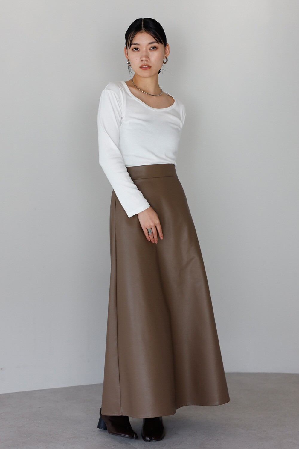 程よい光沢感のある素材が、シンプルな中に上品さを添えます。 ウエスト位置を高く見せるシルエットで、縦ラインをすっきりと強調。 左脇ファスナー仕様により、見た目を損なわず着脱しやすい仕上がりです。