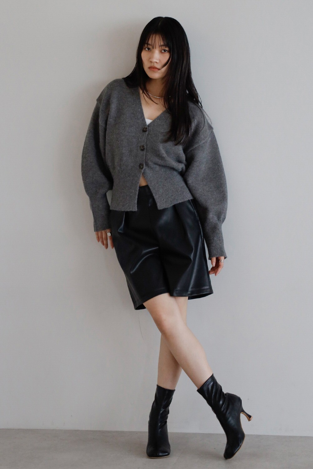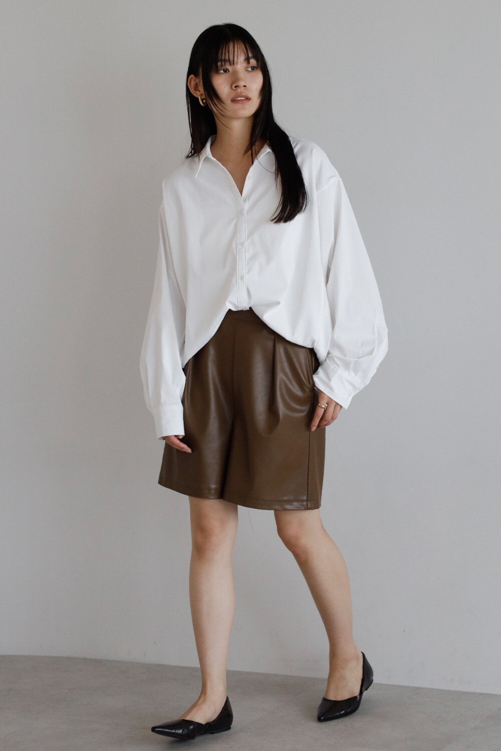 ほどよい艶を持つフェイクレザー素材が、シーズンスタイルに上品なアクセントをプラス。フロントタックの生む立体的なシルエットで、脚のラインをすっきりと見せます。ウエスト後ろはゴム仕様にし、快適なフィット感と着脱のしやすさを両立。