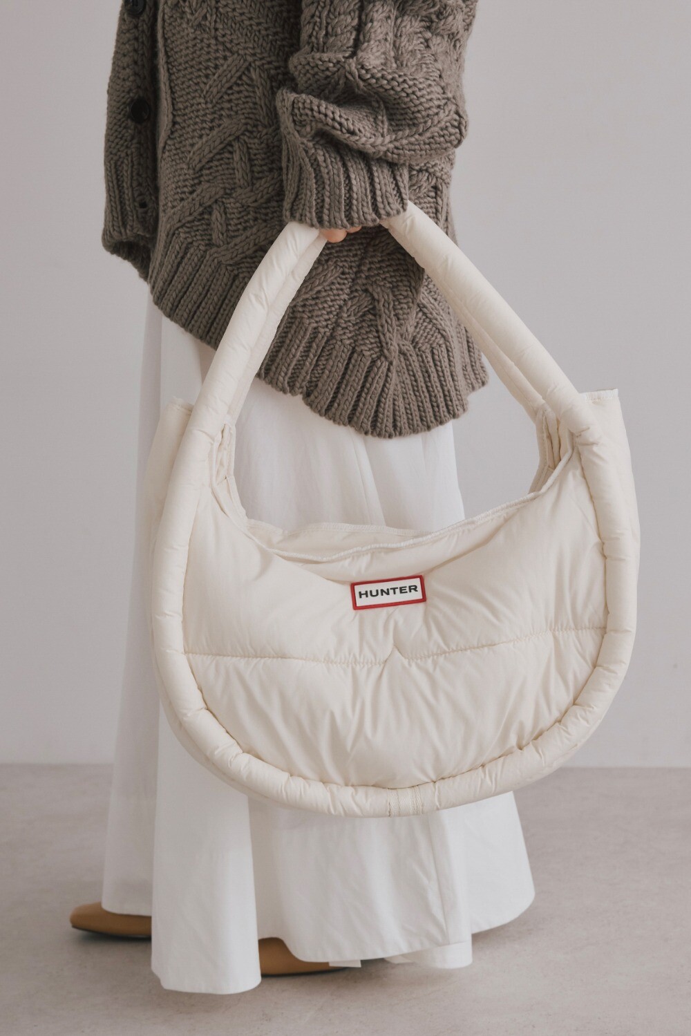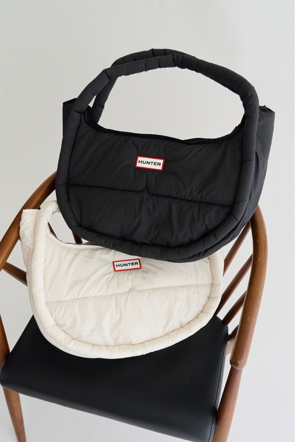 丸みのあるホーボーシルエットで、腕に沿う柔らかなフィット感。 中綿入りの軽やかなパファー素材が、心地よいボリュームを生み、シーズンらしい表情に。 フロントにはHUNTERのラバーロゴを配し、シンプルな中に存在感をプラス。
