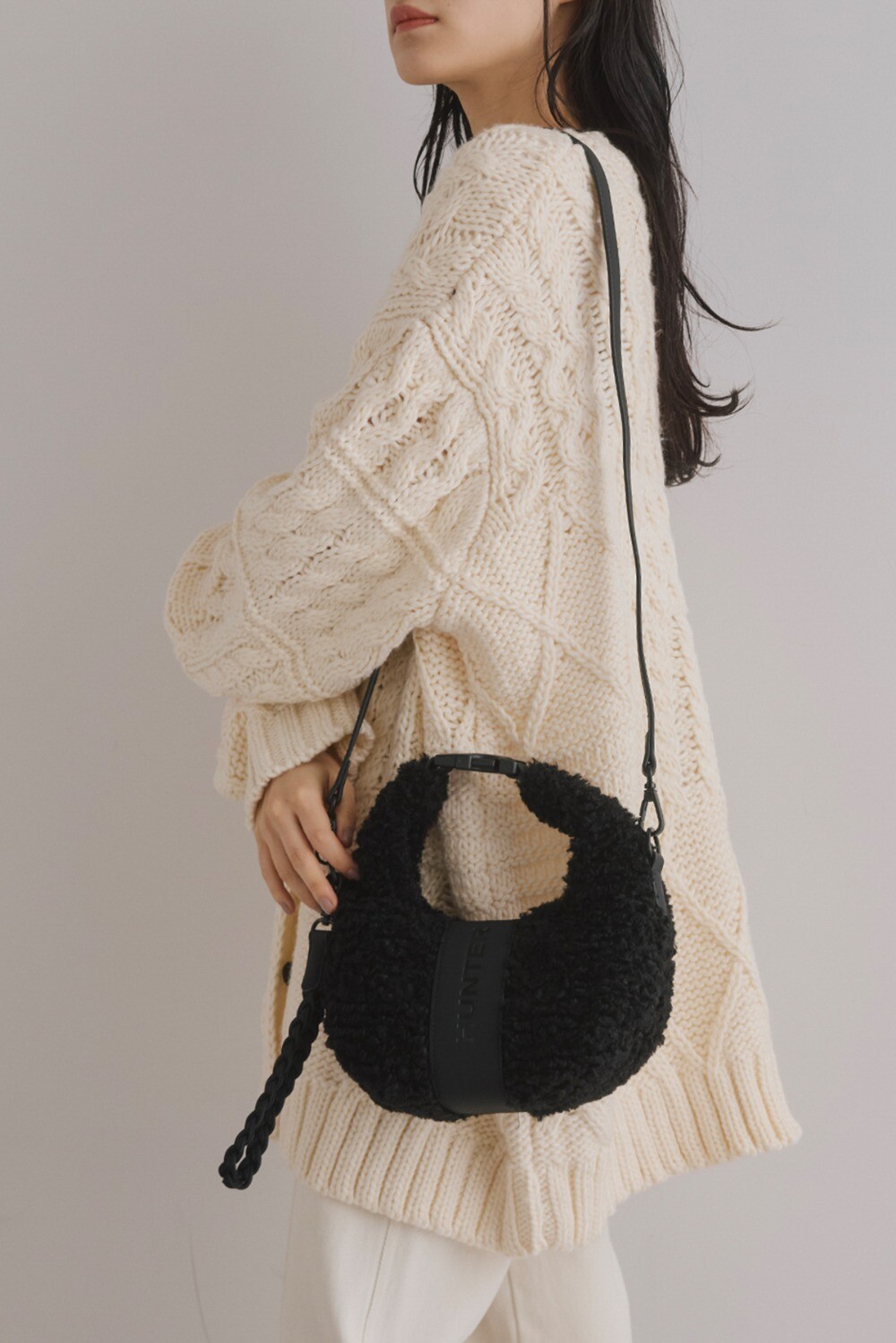 表面はもこもこのブークレ素材で、柔らかなタッチと軽さが魅力のバッグ。 中央のラバーロゴバンドが、シンプルな形にモードなアクセントをプラスします。 バックル式のハンドルで開閉しやすく、扱いもスムーズ。長さ調整可能なショルダーストラップ付きの2WAY仕様。