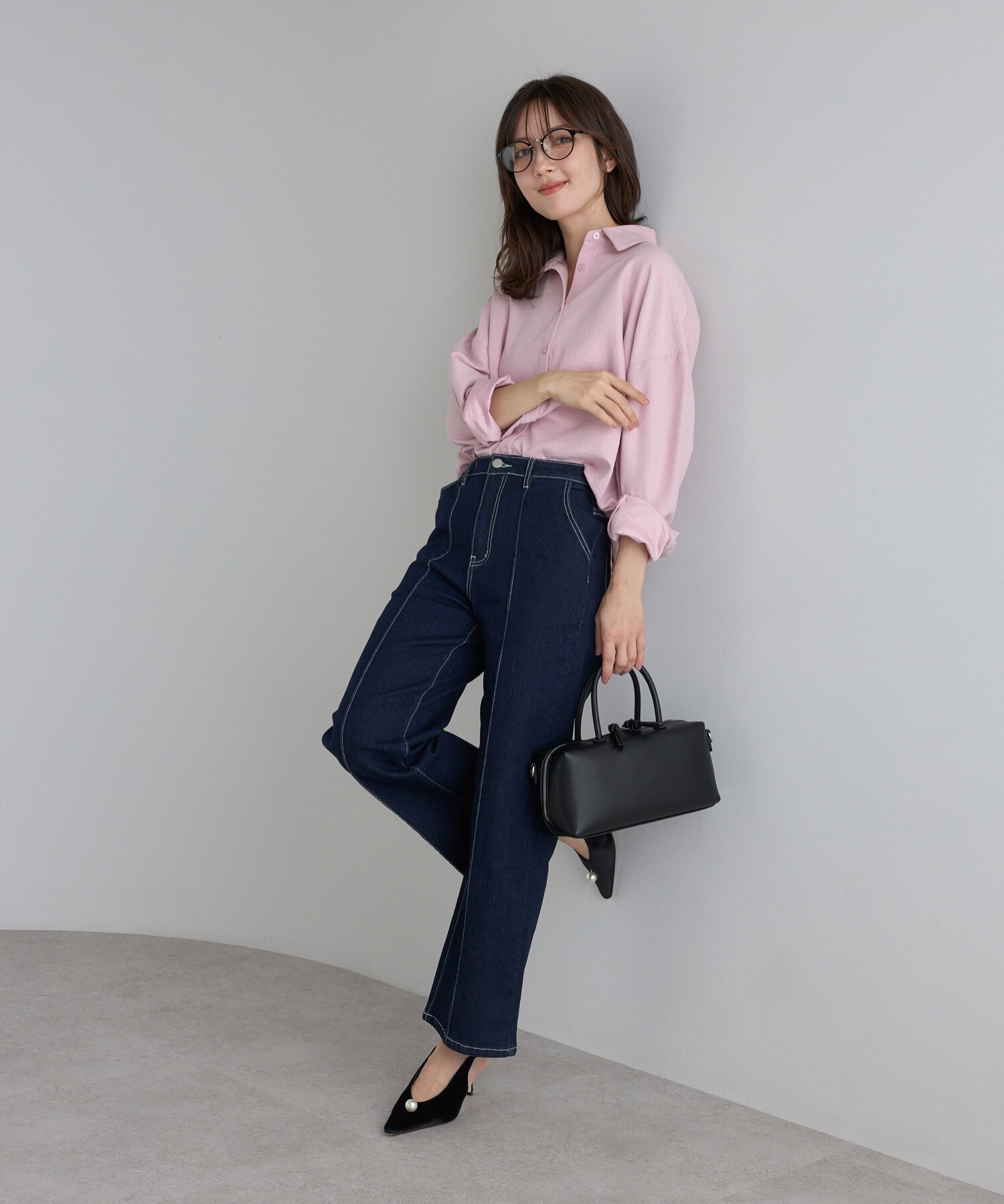 シャツ合わせで「きれいめカジュアル」にシャツは前だけインで腰位置を高くし袖はラフにまくって抜け感をプラス。小物は黒でまとめて、全体を引き締め通勤にも寄せたい人におすすめなコーデ