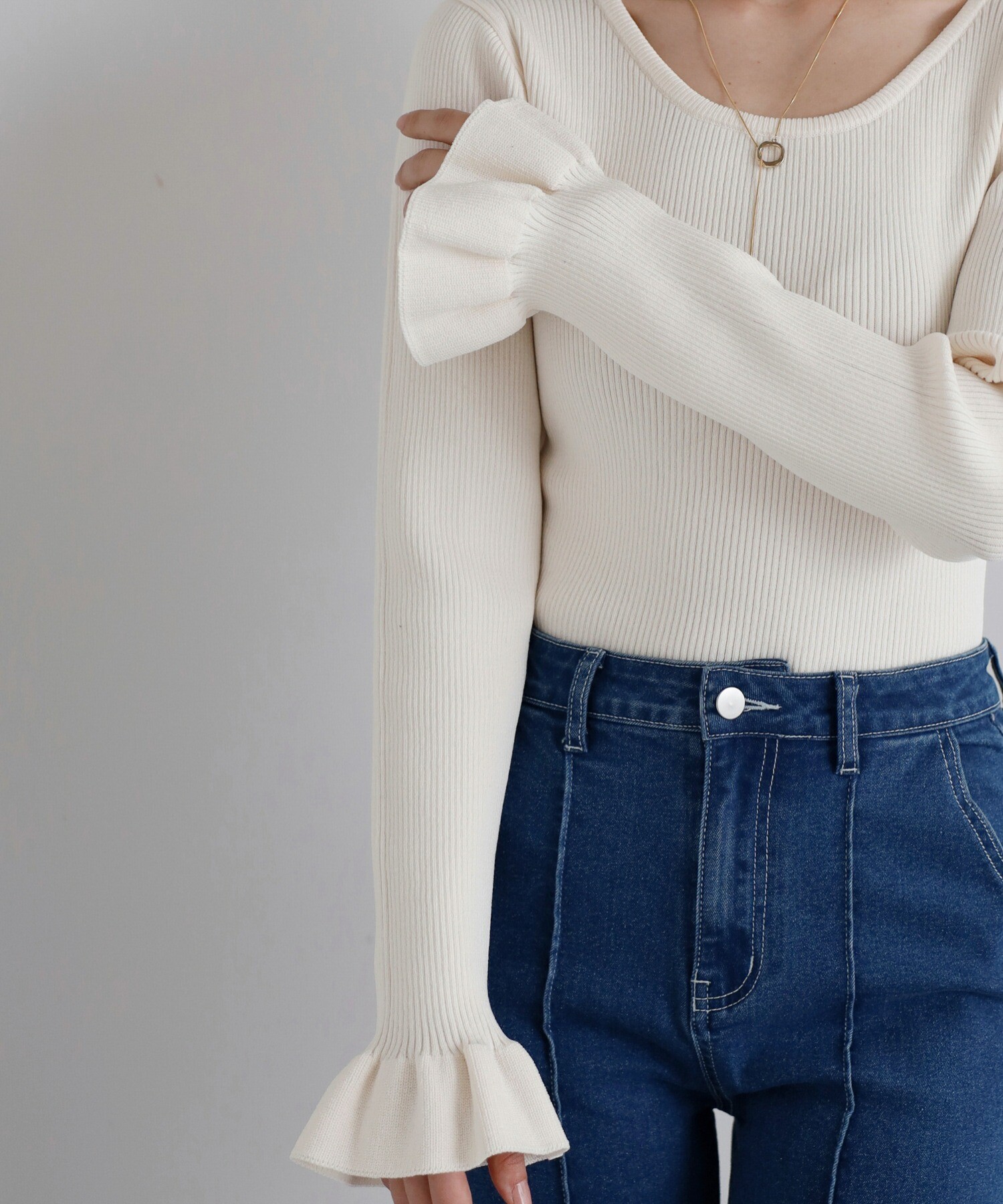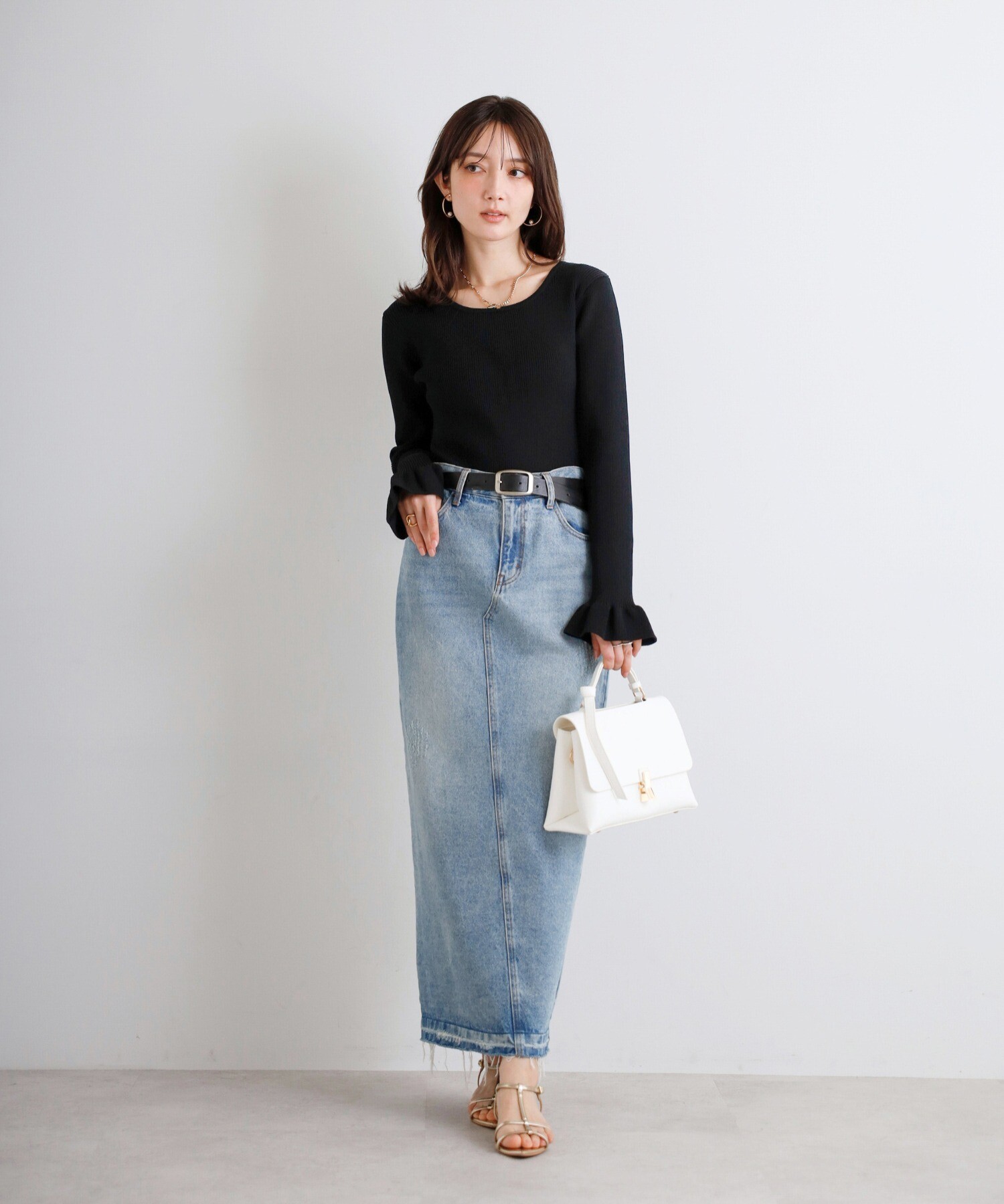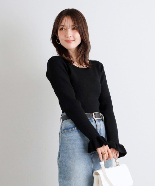 ストレートデニムと合わせることでトップスのウエストラインが引き立ちスタイルアップ効果も。袖フリルがアクセントになりシンプルなデニムコーデも女性らしく仕上がります。Styling Point