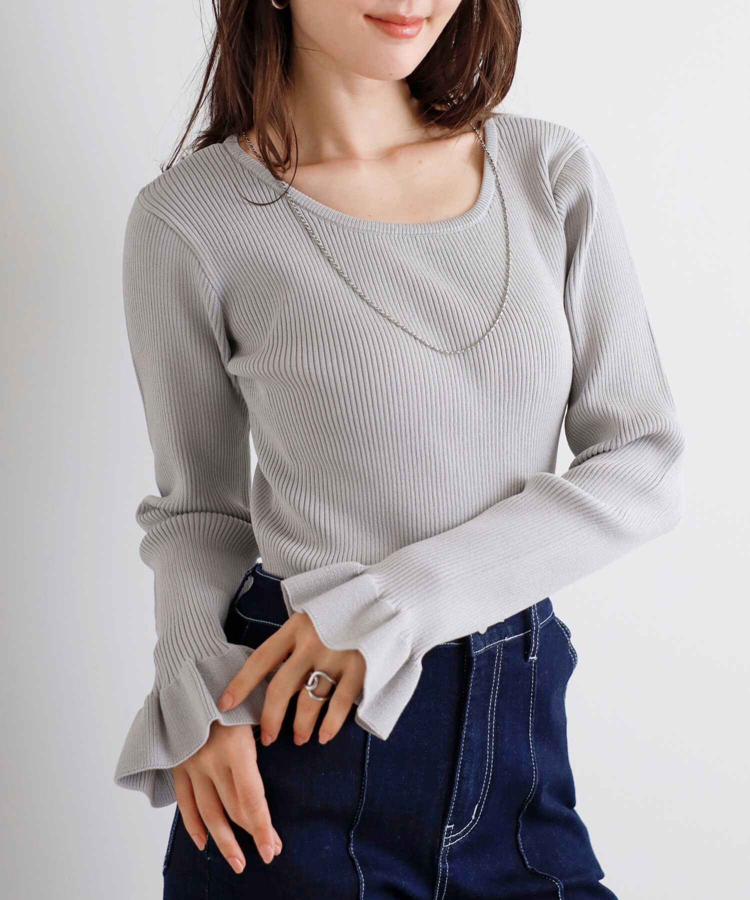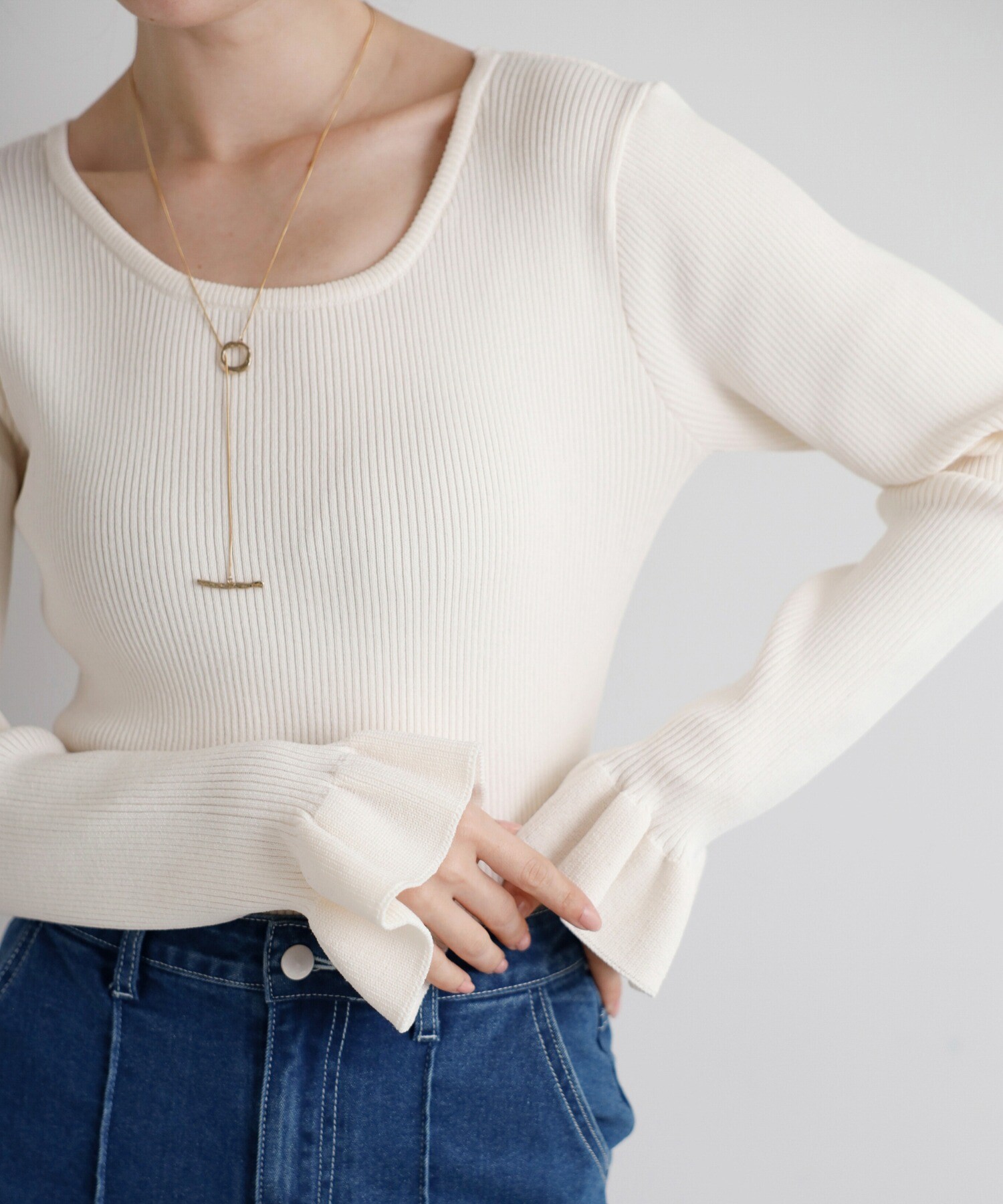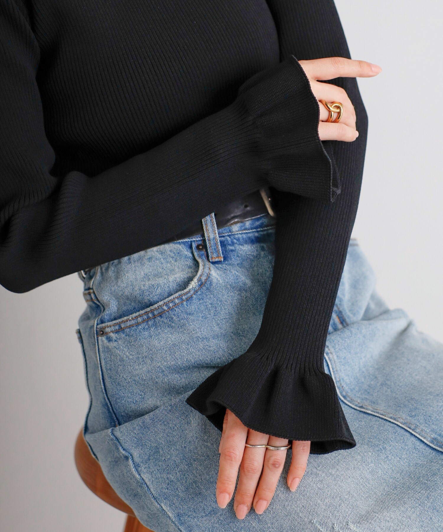 ストレートデニムと合わせることでトップスのウエストラインが引き立ちスタイルアップ効果も。袖フリルがアクセントになりシンプルなデニムコーデも女性らしく仕上がります。Styling Point