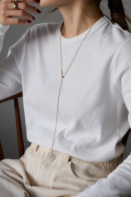細かな球体を連ねたボールチェーンが、控えめながら上品な輝きを放つネックレス。ミニマルなルックスでコーデに取り入れやすく、軽やかなメタルアクセとして幅広いスタイルに馴染みます。チェーン中央のY字パーツでスライド調節ができ、好みのバランスにフィット。