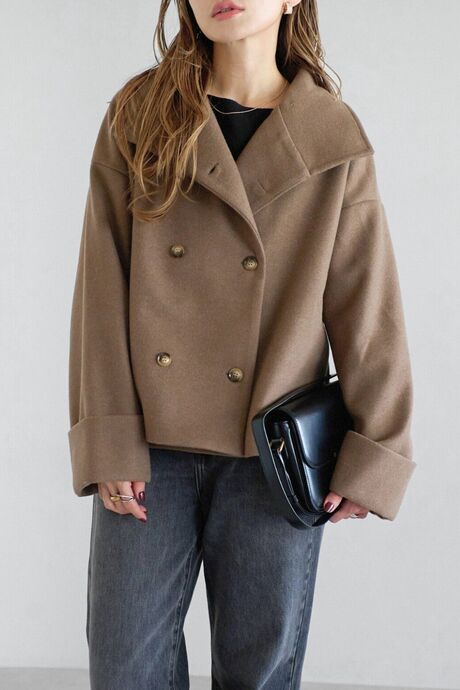 上品なウールタッチ素材で、軽やかさと暖かさを兼ね備えたショートコート。衿元はオープンカラーとスタンドネックの2WAY仕様で、気分に合わせて表情を変えられます。ダブルボタンと広めの衿がアクセントになり、コンパクトながら存在感のある仕上がり。