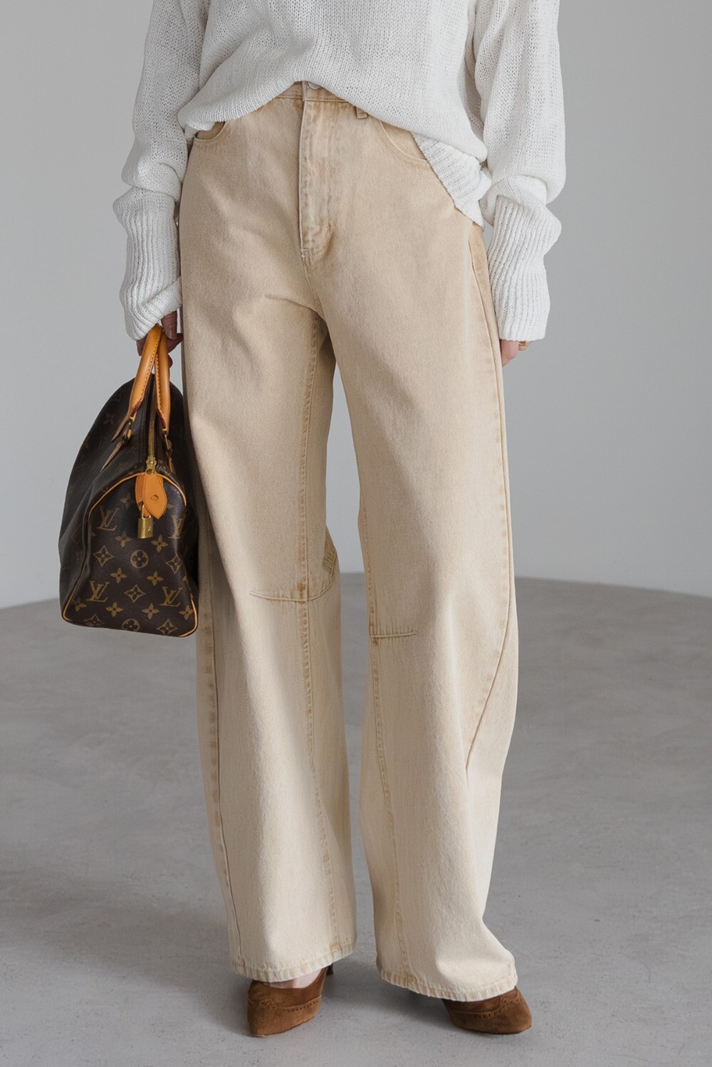 脚のラインに沿って丸みを持たせた、バレルレッグならではの立体的なシルエット。 膝下にかけて自然なカーブを描き、デニムに柔らかな印象を与えます。 イエローベージュとグレーは綿100%で、程よいハリとデニムらしさをキープ。