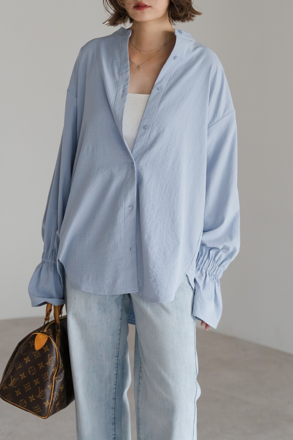 袖口ゴムでギャザーを施したキャンディスリーブが、柔らかな表情を演出。 身頃はシンプルに仕上げ、袖のディテールがバランスよく引き立ちます。 軽やかな素材で、重ね着しやすい一枚。