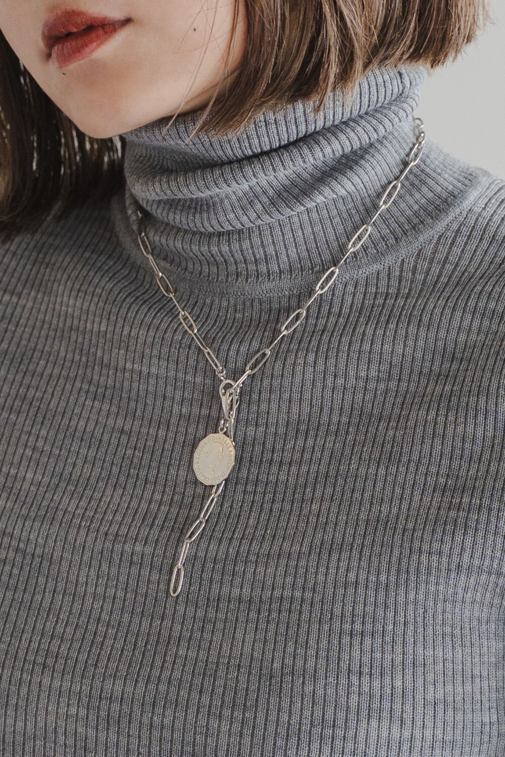 ミニコインモチーフが目を惹くクラシックなデザインのネックレス。トレンドのY字シルエットで首元に抜け感を演出します。程よい存在感のあるメタルチェーンが上品な印象に。