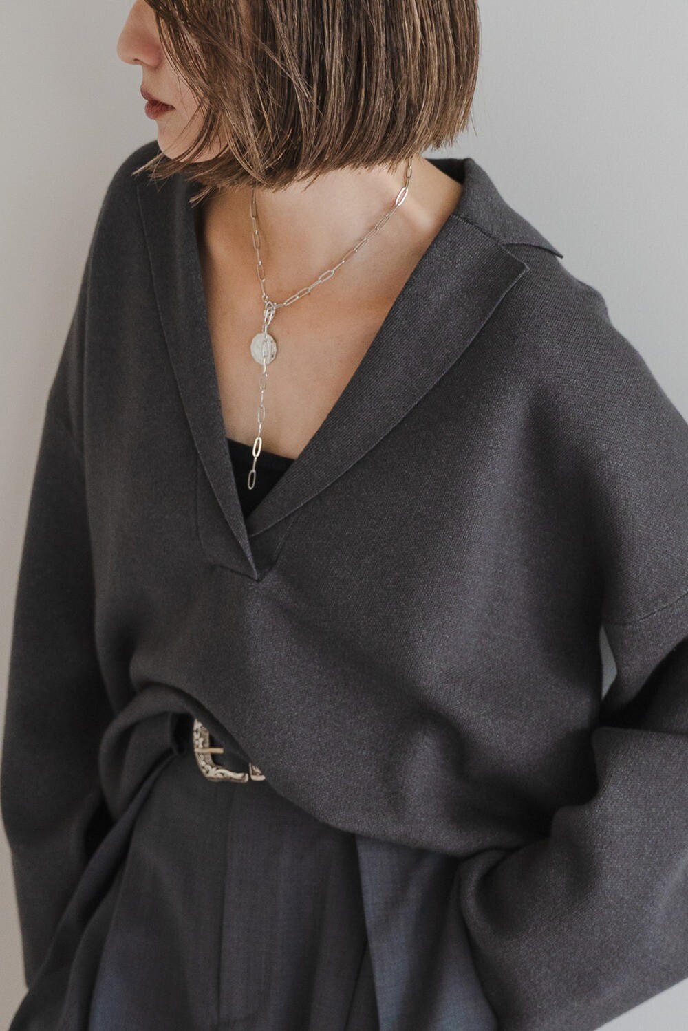 ジャケットのような襟元デザインがポイントで、顔まわりにほどよいシャープさを添える一着。ニットならではの柔らかいタッチで、軽やかな着心地を叶えながらきれいめな印象に仕上げました。フロントの深めVラインが縦のラインを強調し、すっきりとした表情に。