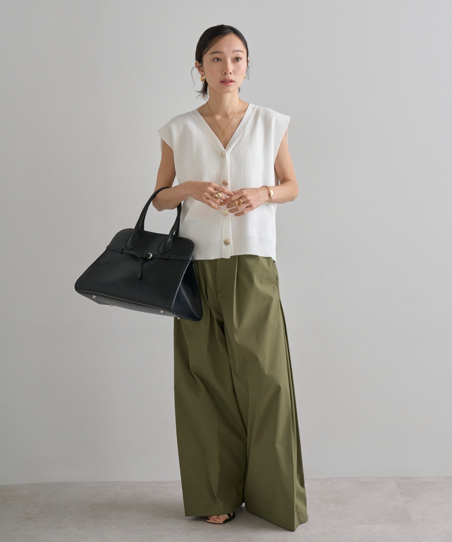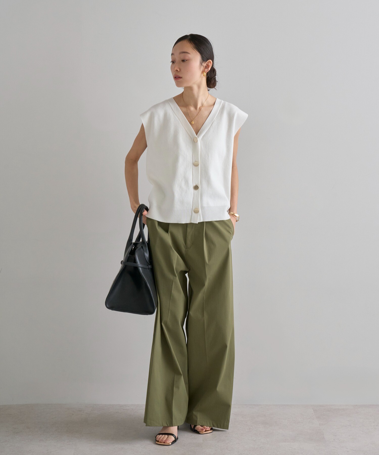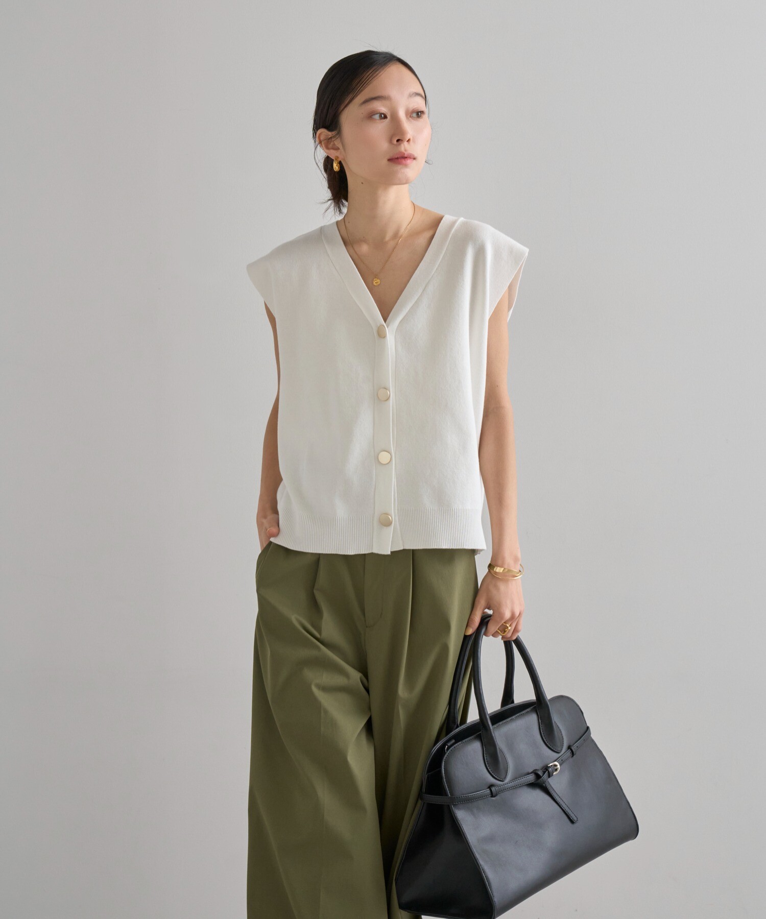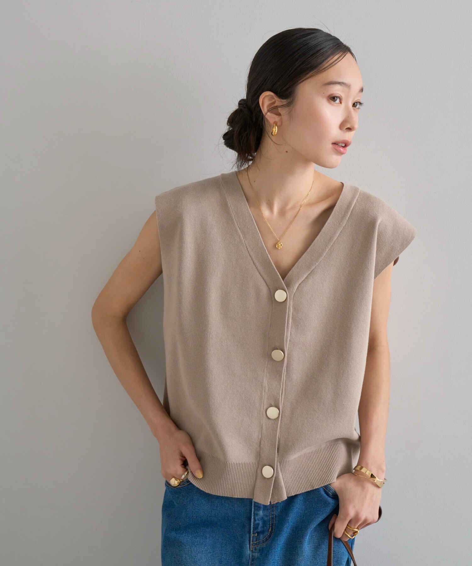 程よい開きのVネックでヘルシーな大人スタイルに。ゴールドボタンベスト