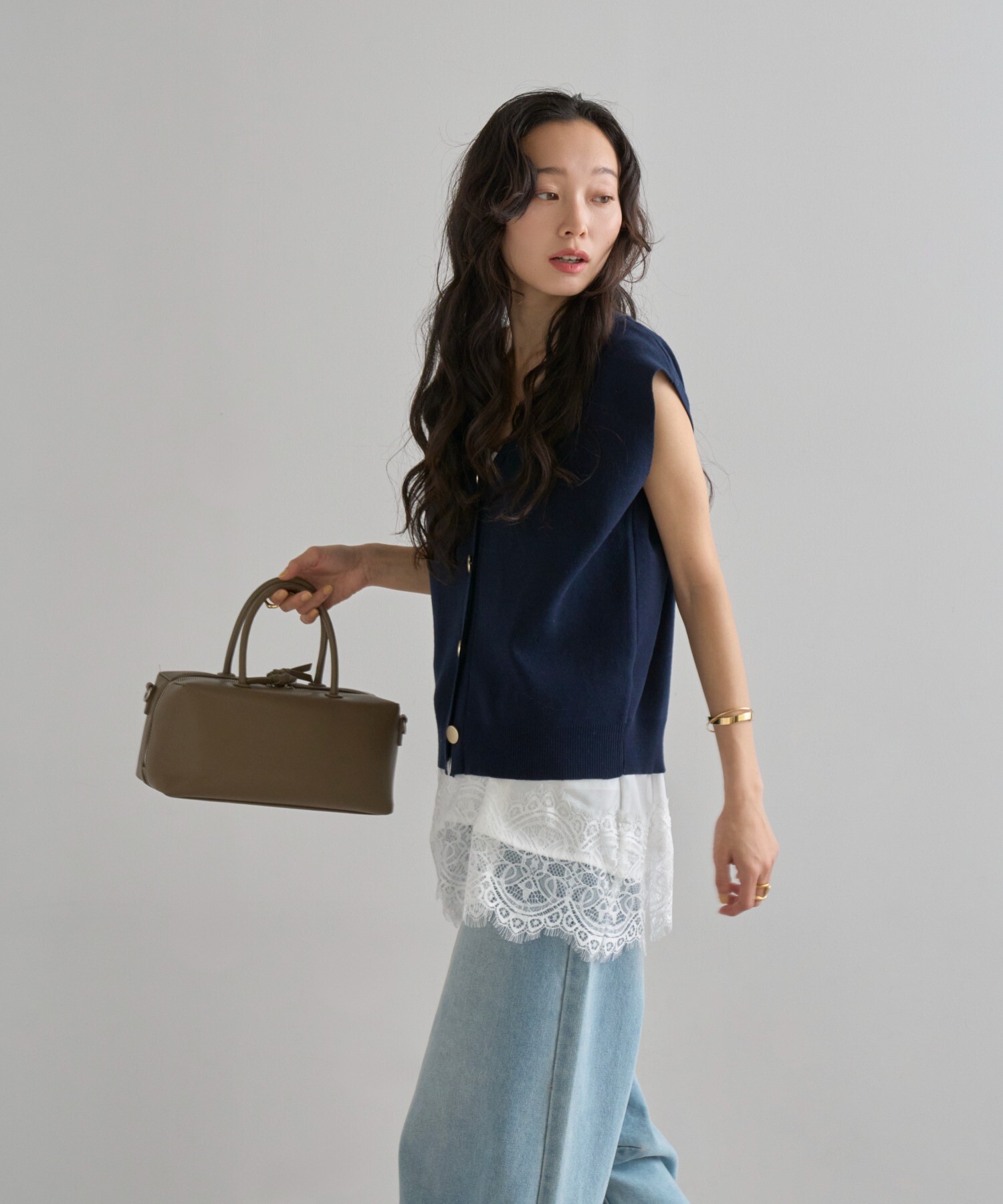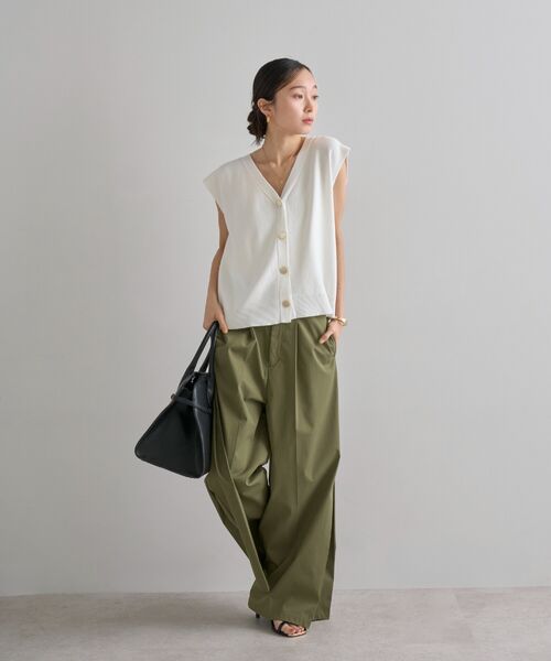 釦を開けて羽織るのはもちろん、釦を閉じてトップスとしてスタイリングするのがおすすめ。