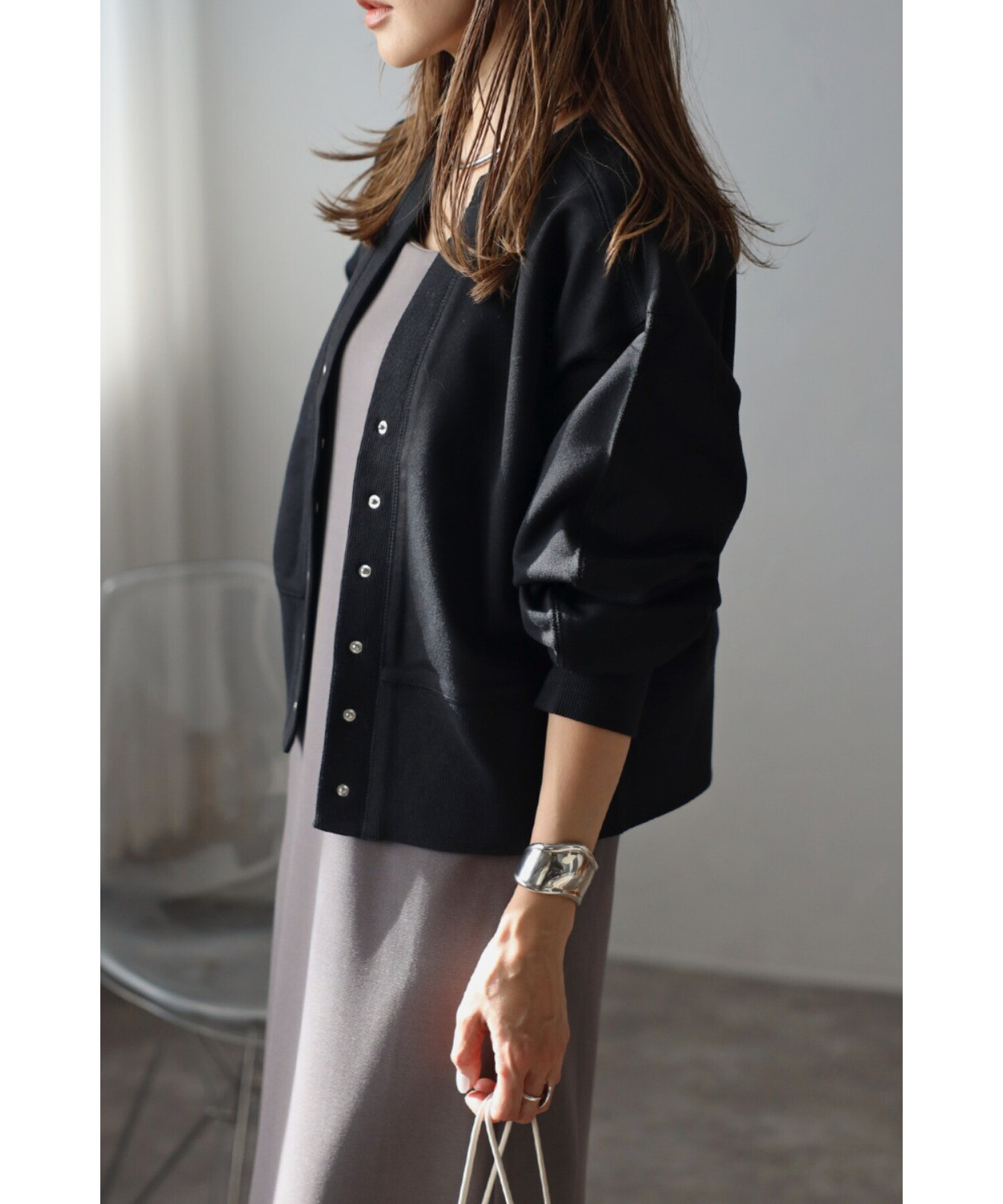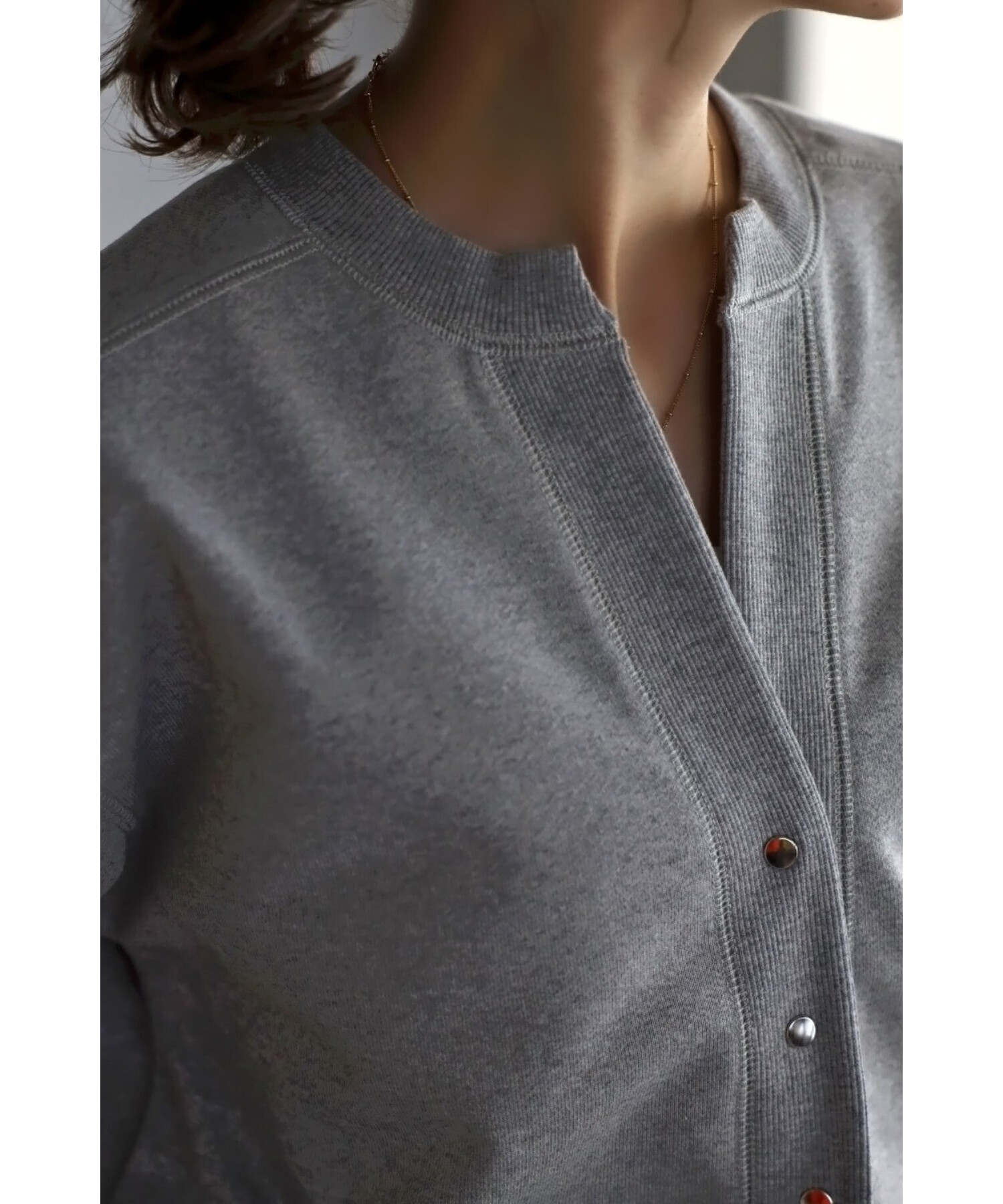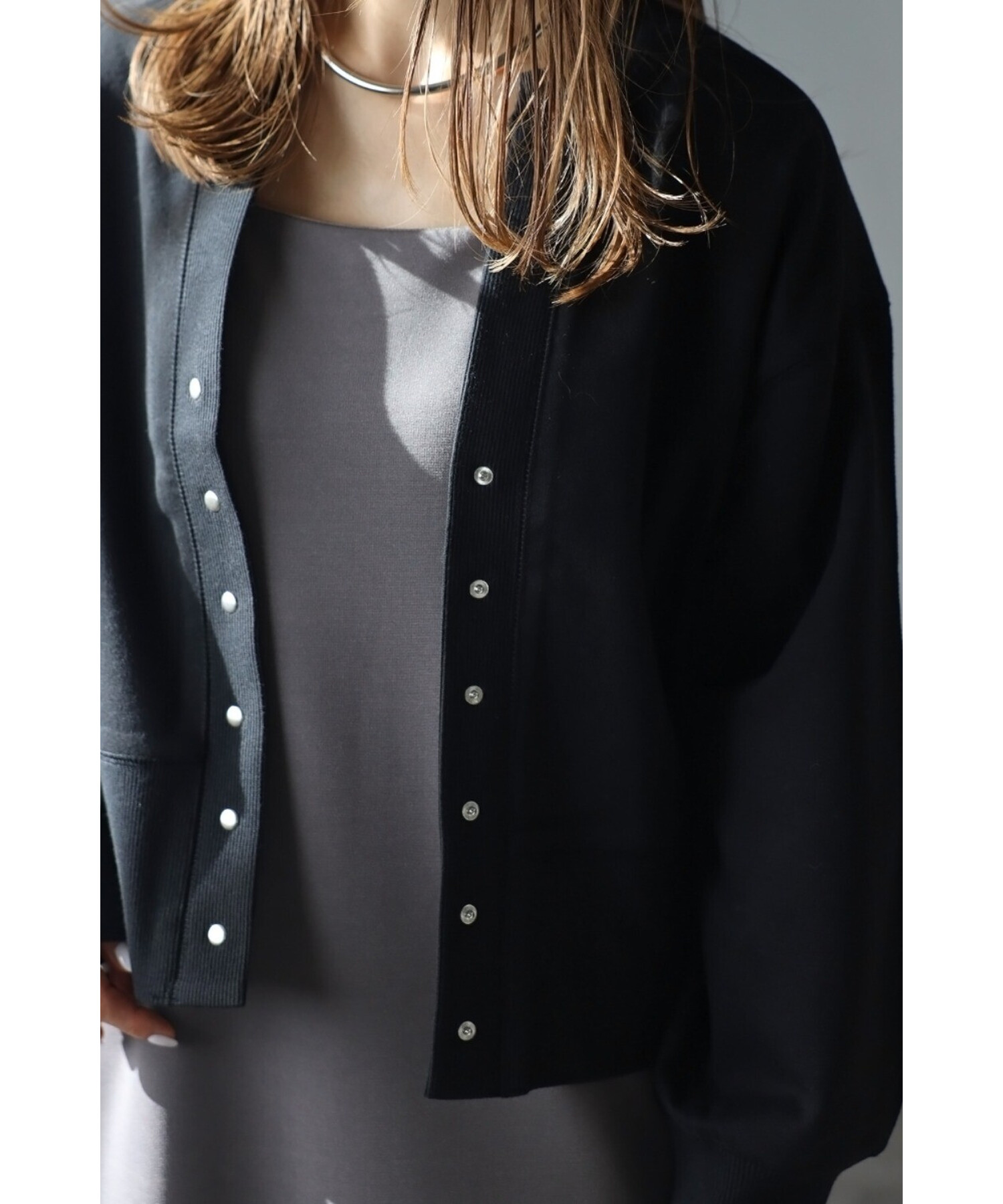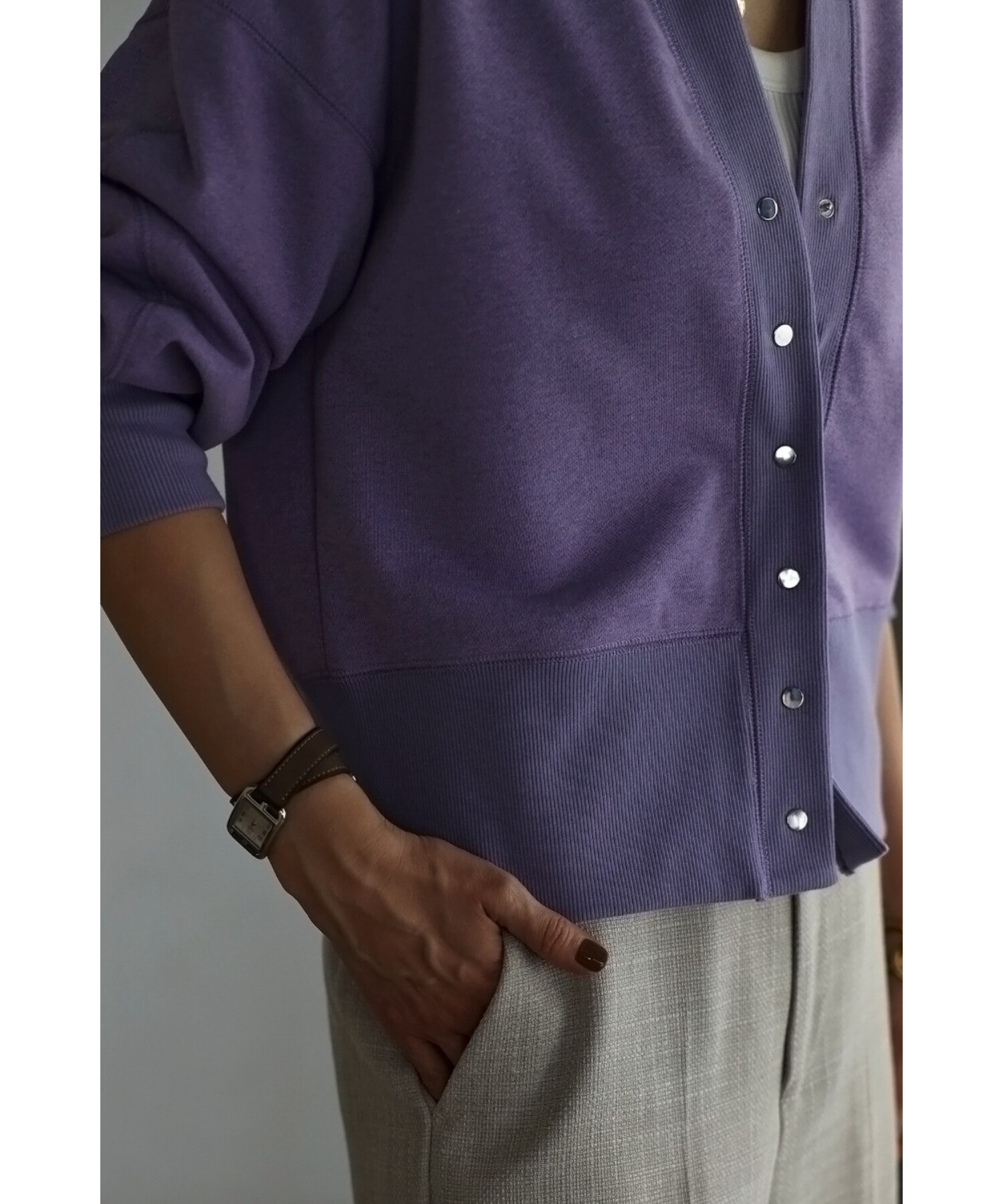 ※生地の特性上色味に個体差がございます。キーネック×スナップボタンが特徴のコンパクトカーディガン。
