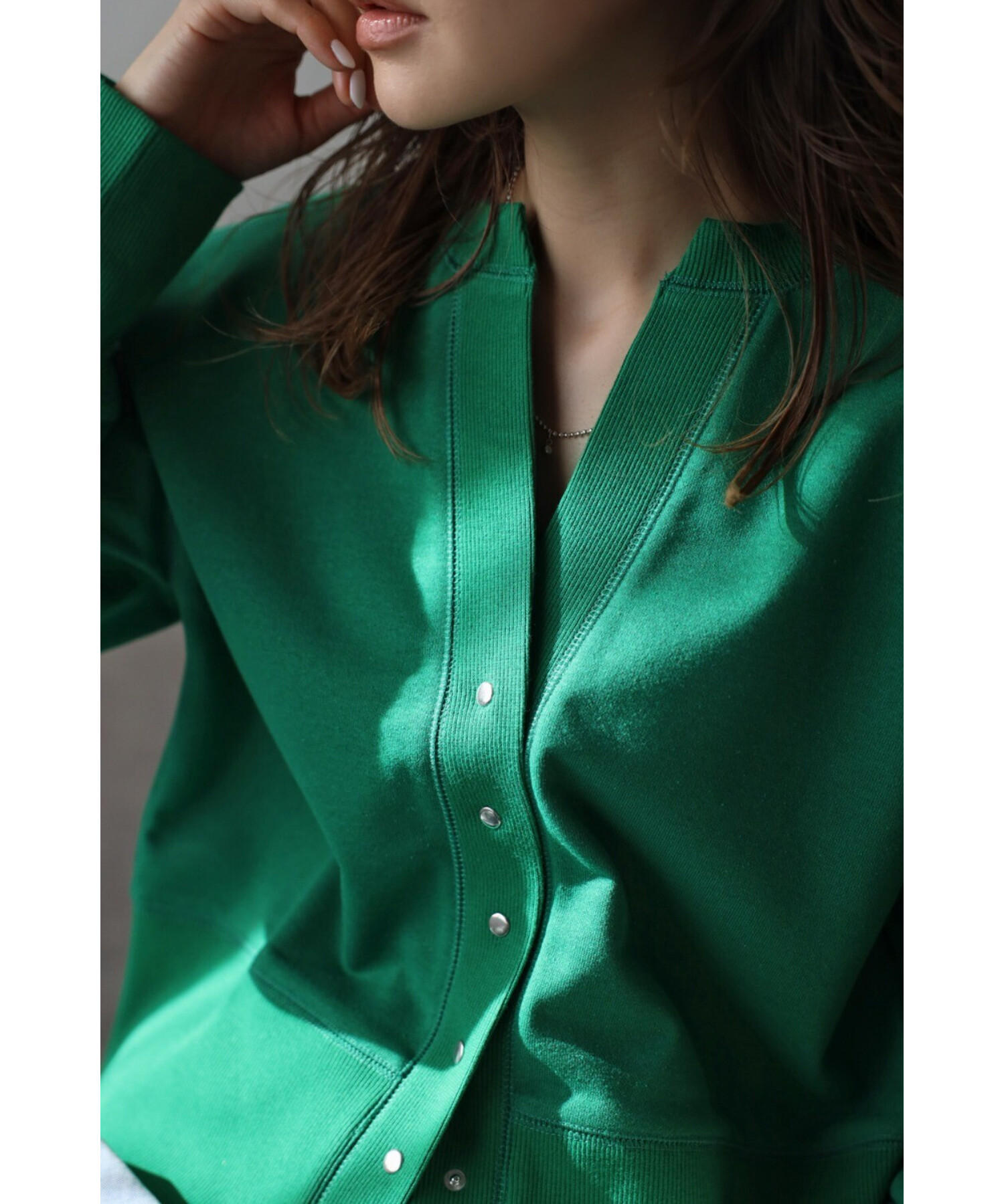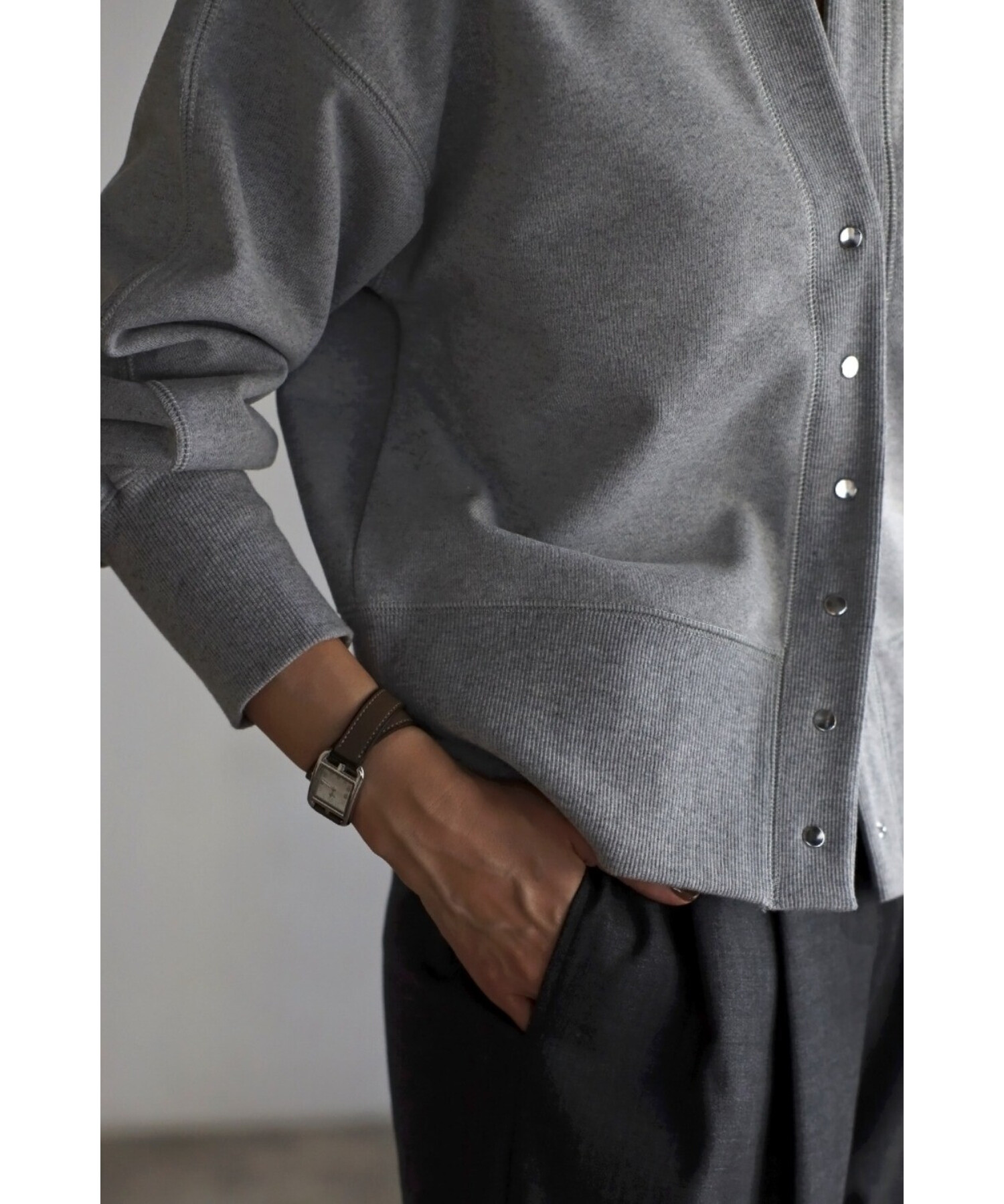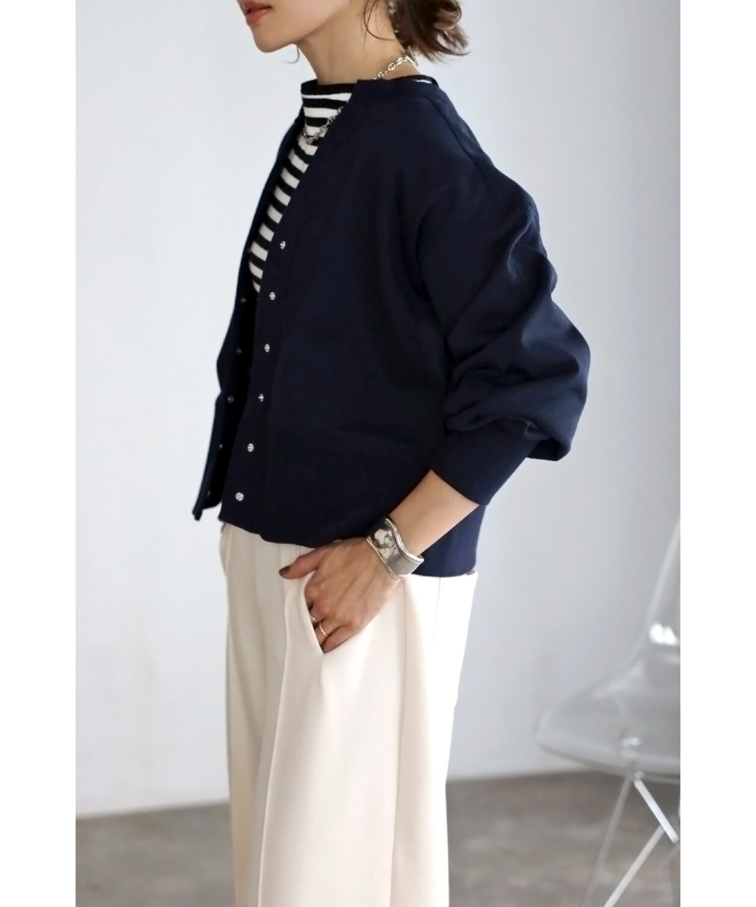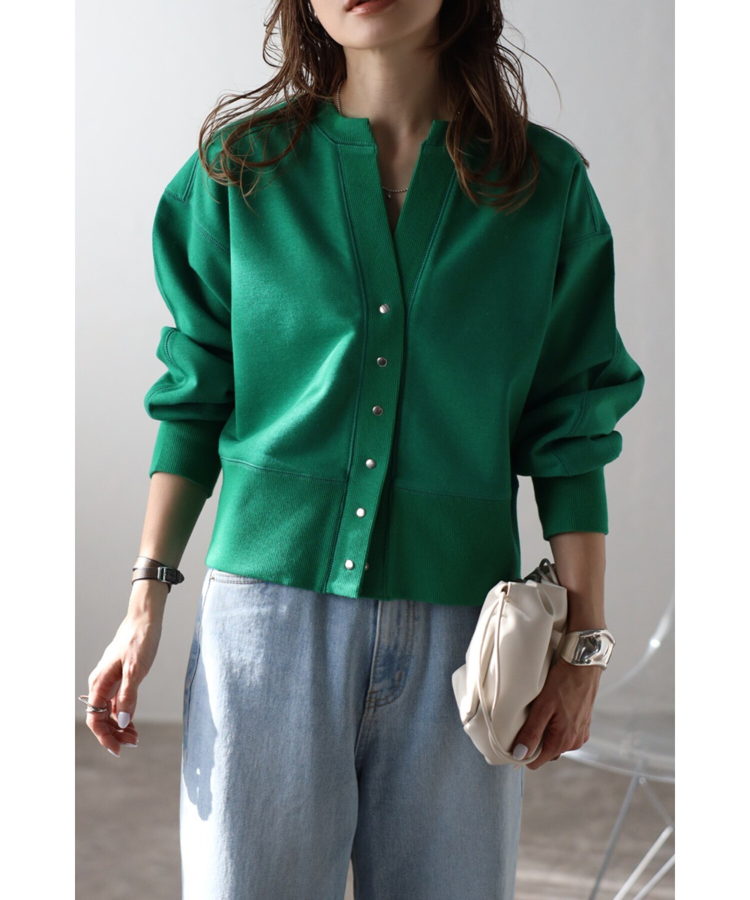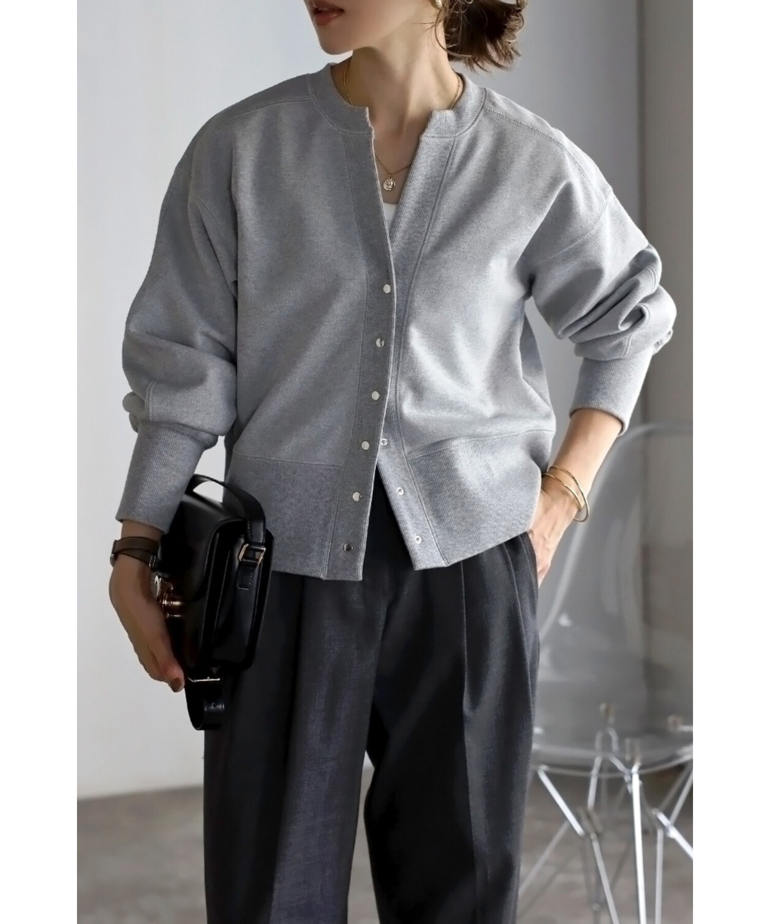 ※生地の特性上色味に個体差がございます。キーネック×スナップボタンが特徴のコンパクトカーディガン。