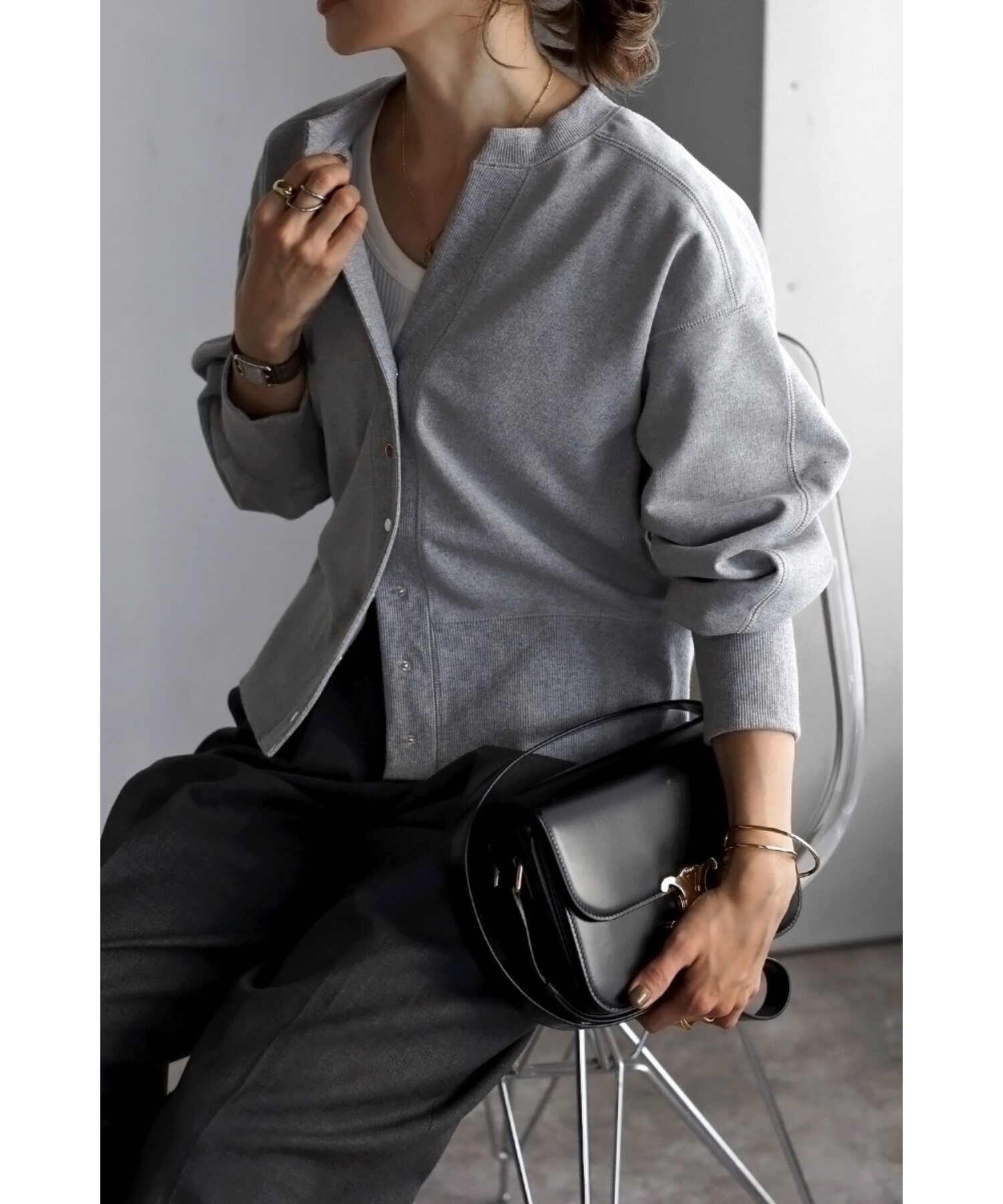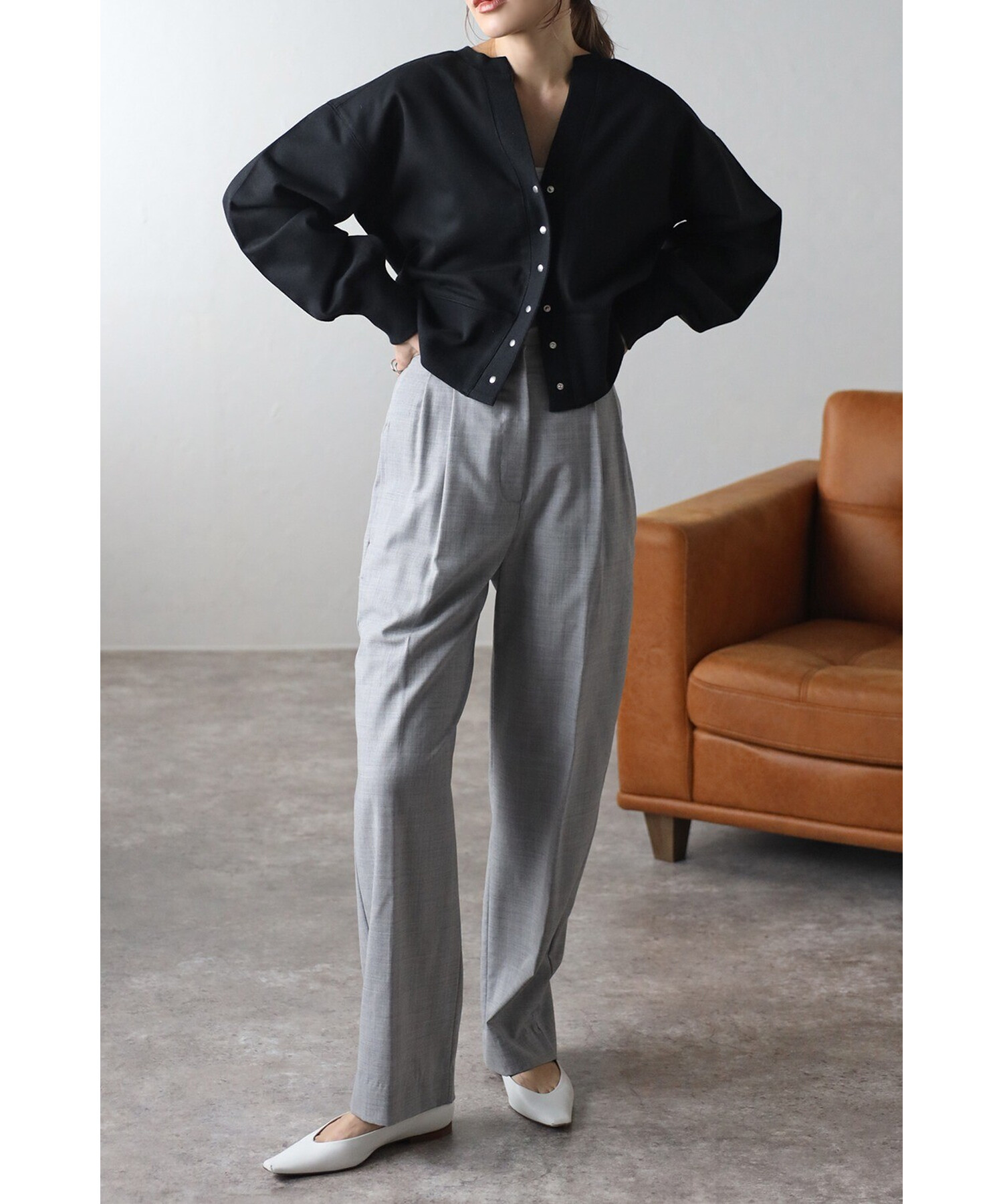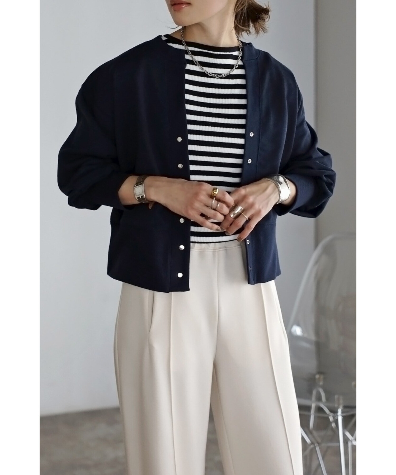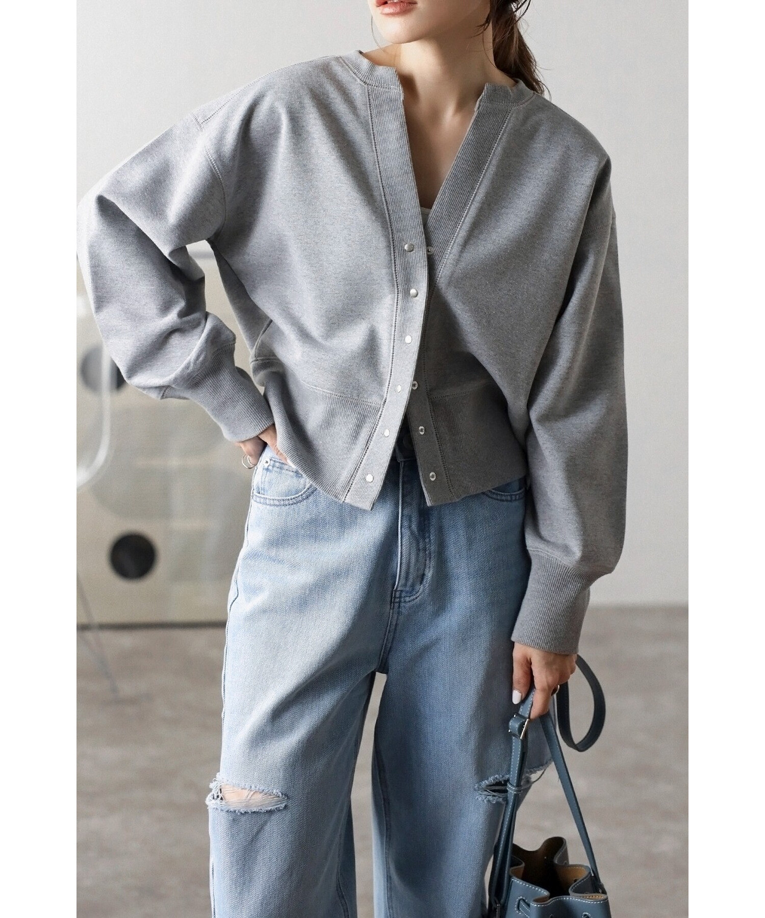 ※生地の特性上色味に個体差がございます。キーネック×スナップボタンが特徴のコンパクトカーディガン。