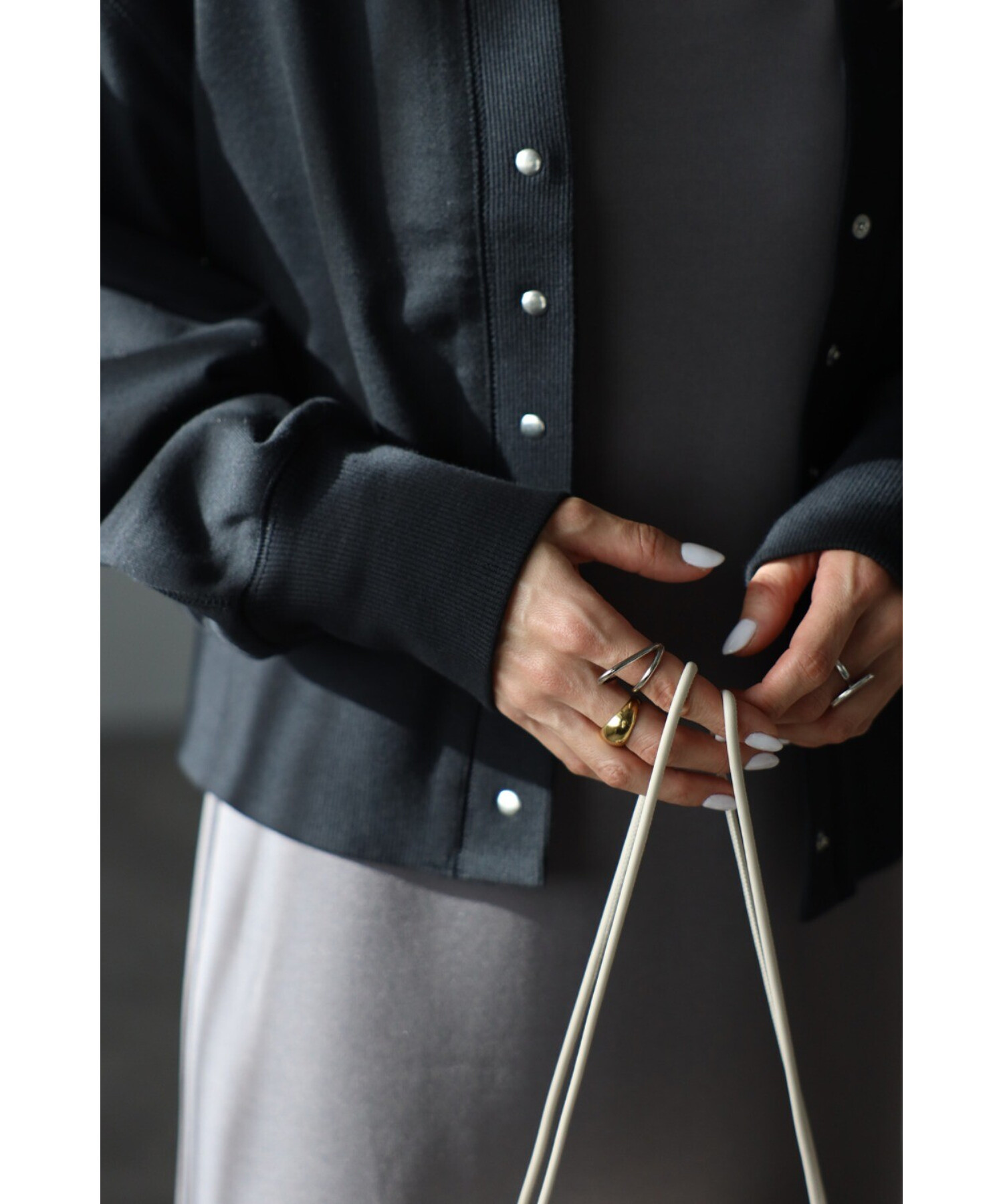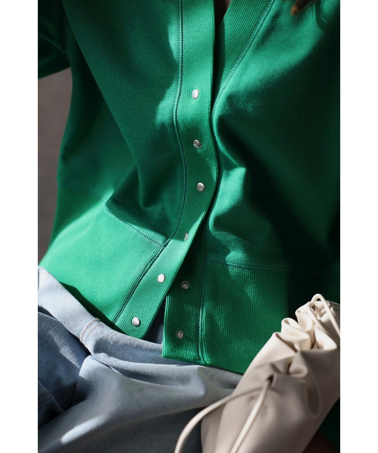 光沢のあるシルバーのスナップボタンは、小さめでカジュアルになりすぎないデザイン。