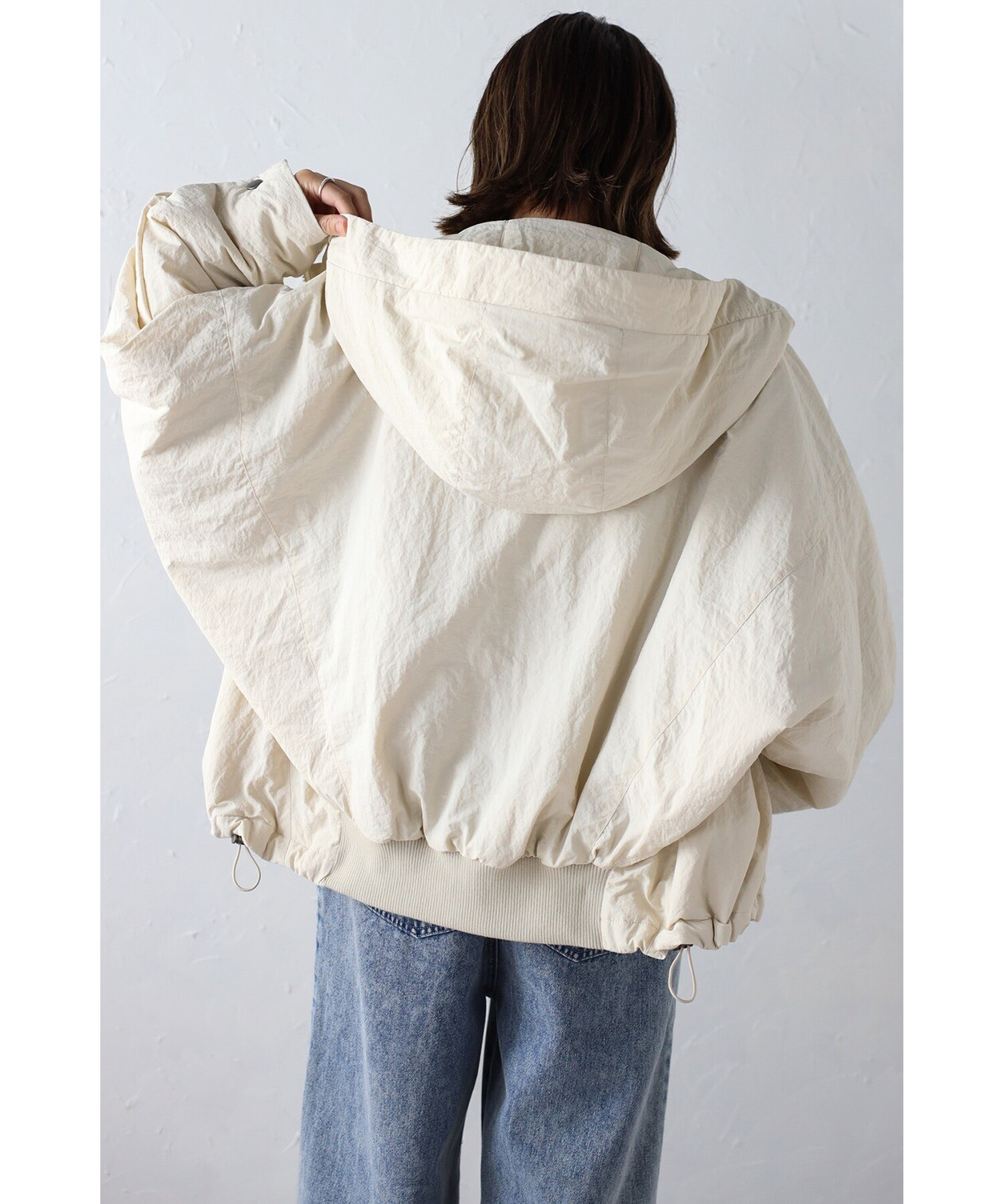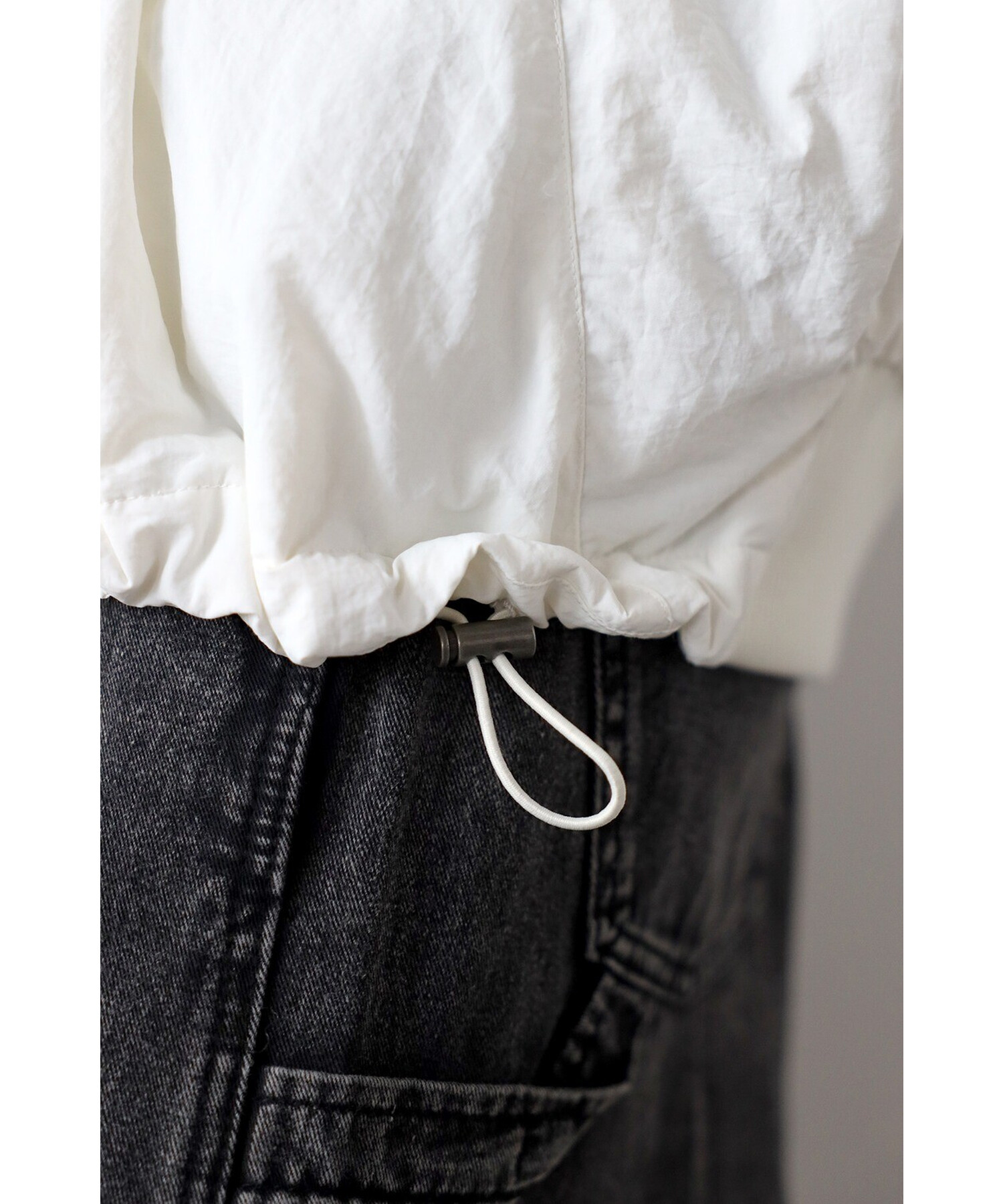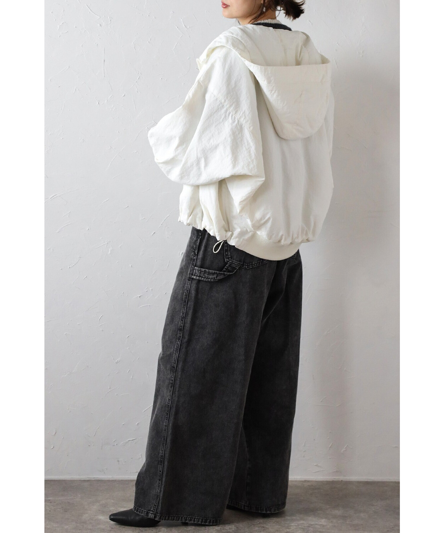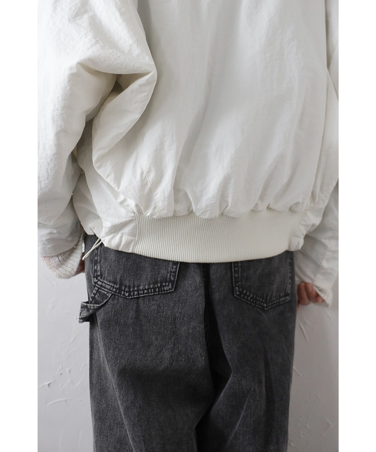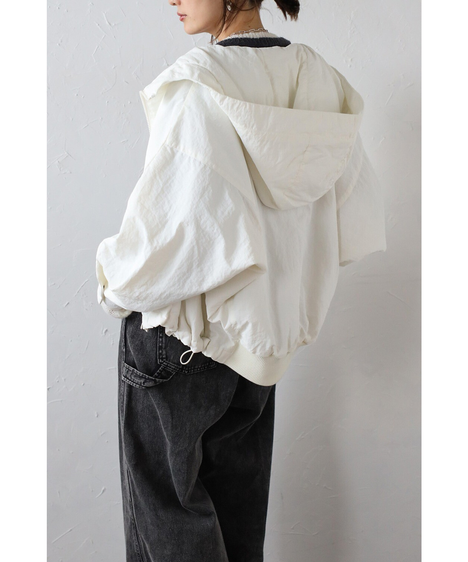 裾はバックリブ仕様でフィット感があり、ドローストリングでシルエットのアレンジも可能。