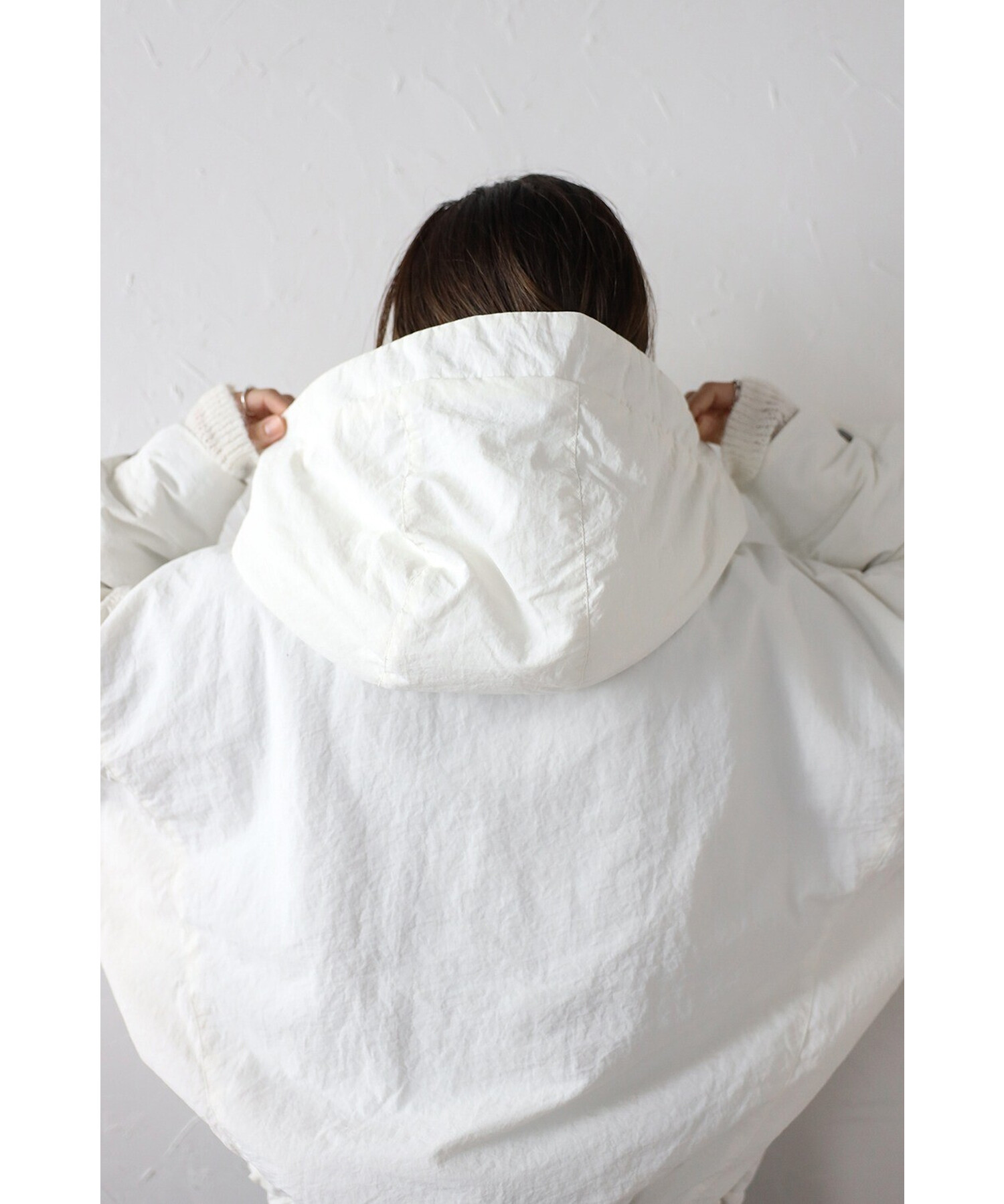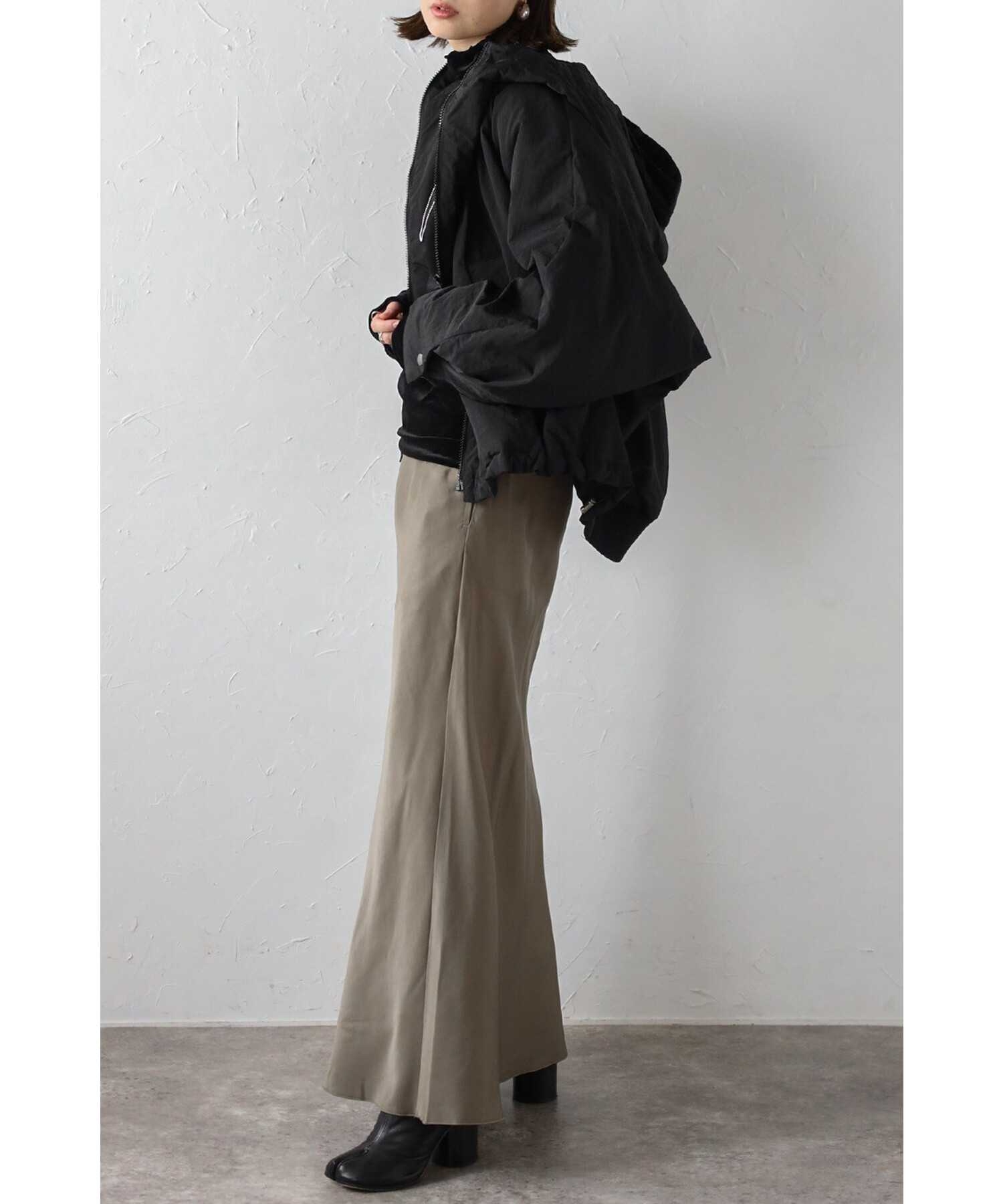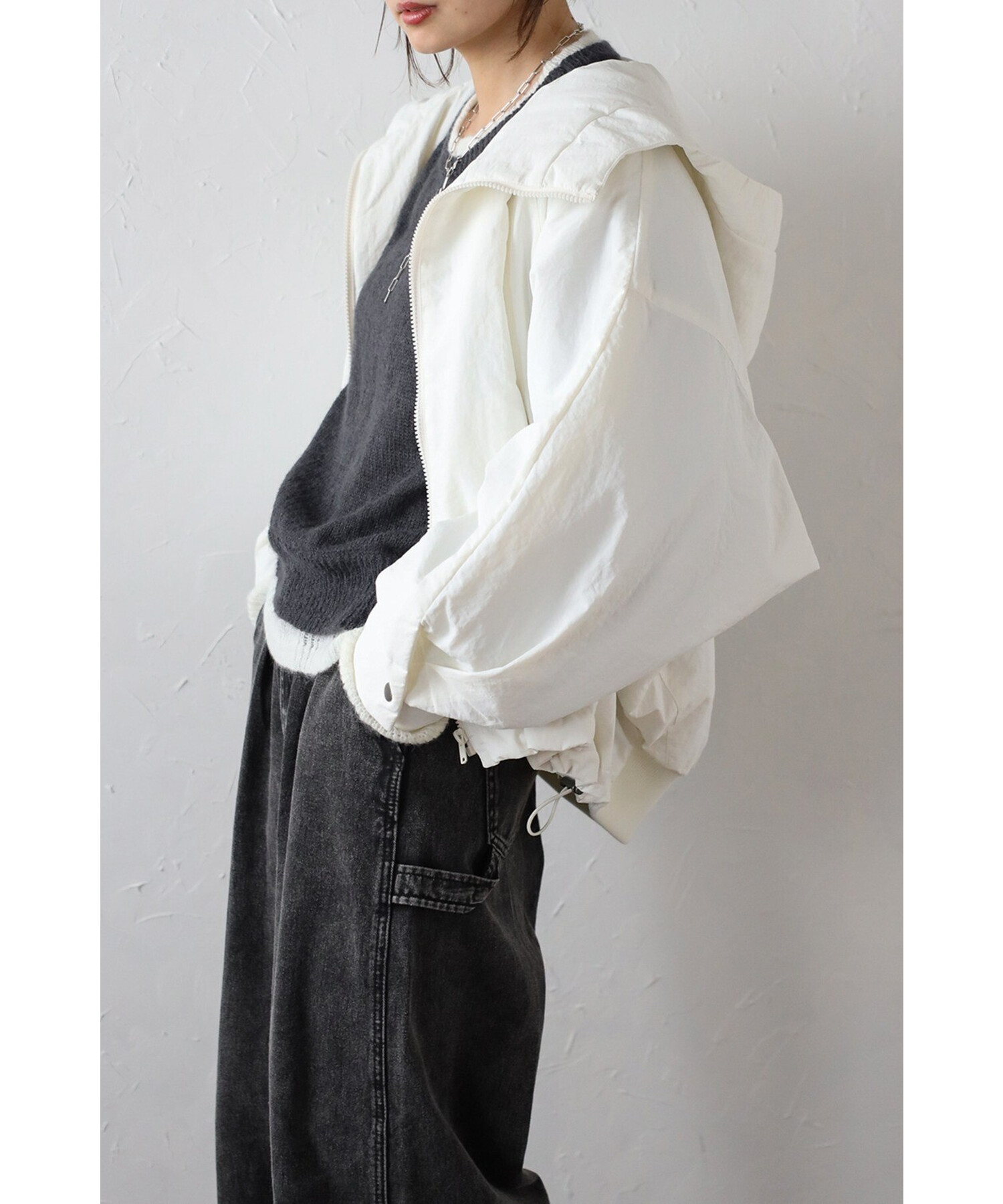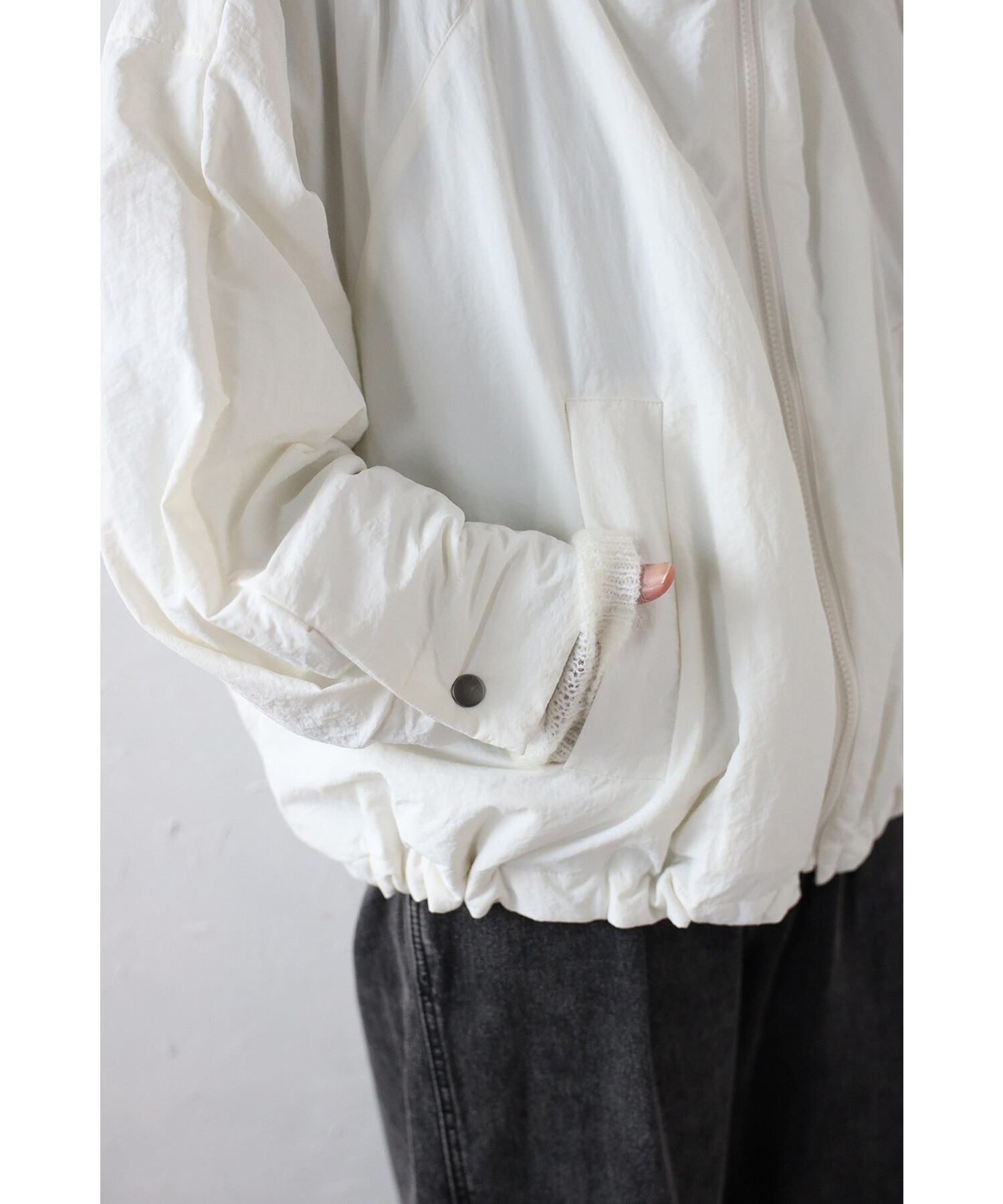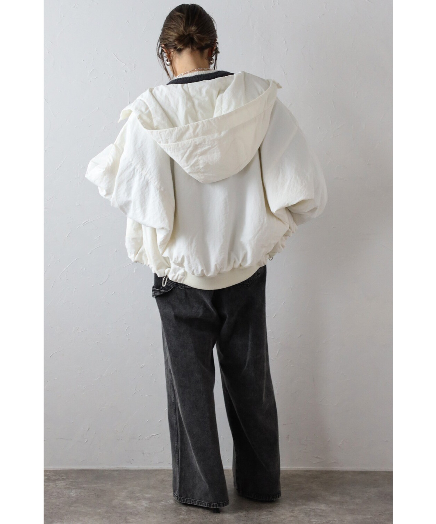 裾はバックリブ仕様でフィット感があり、ドローストリングでシルエットのアレンジも可能。
