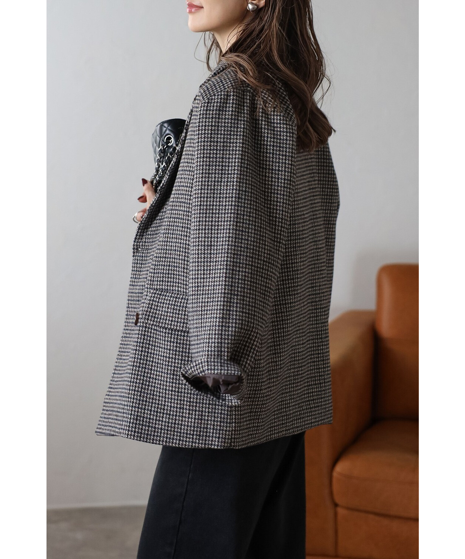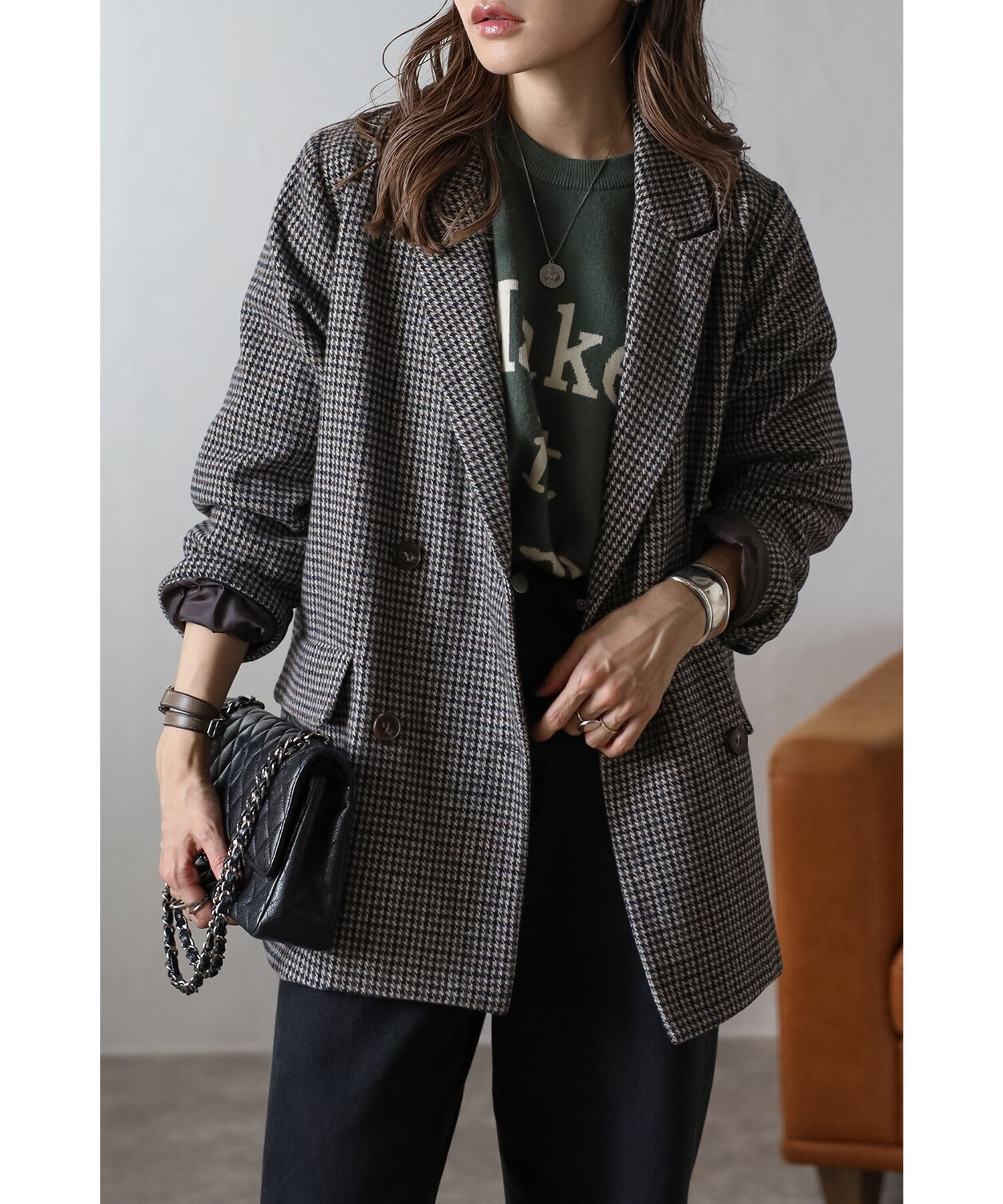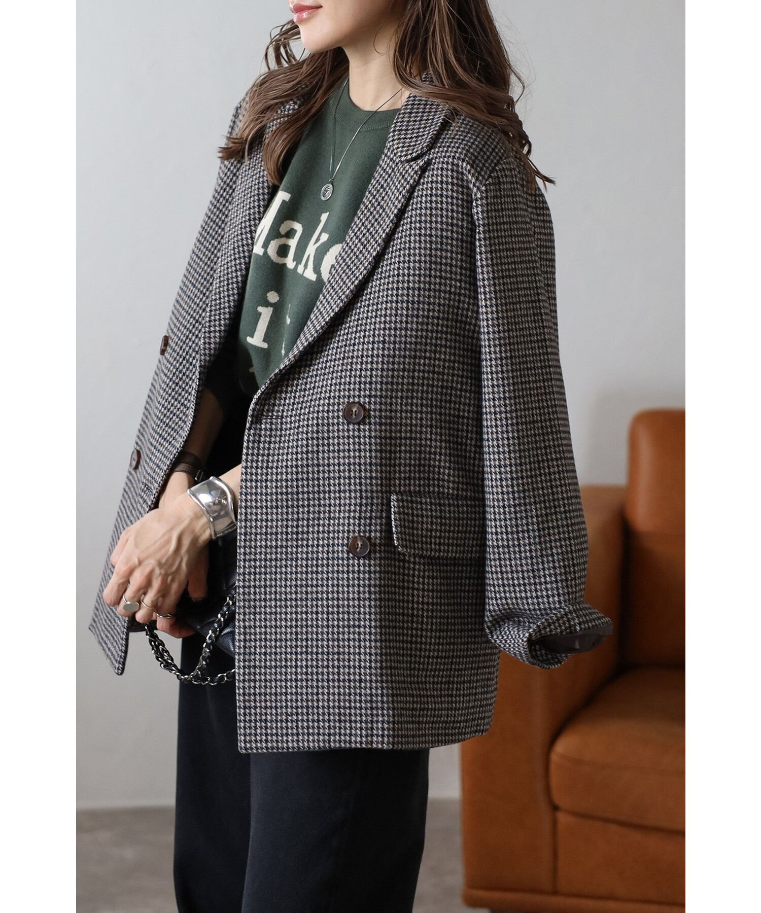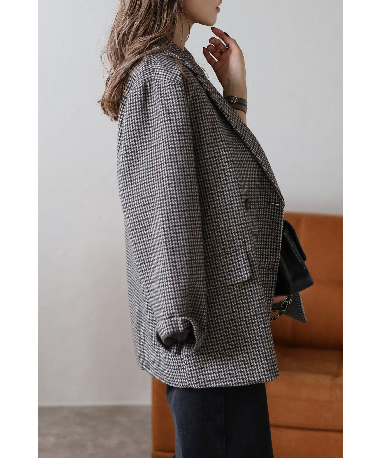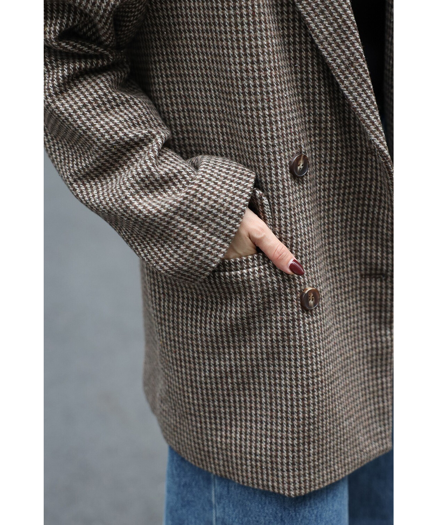 クラシックなガンクラブチェックが上品な印象を与えるダブルブレストジャケット。