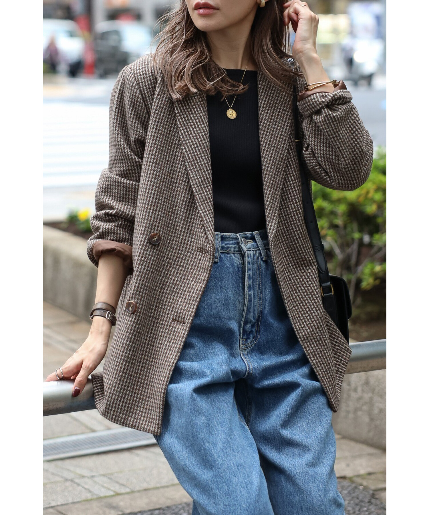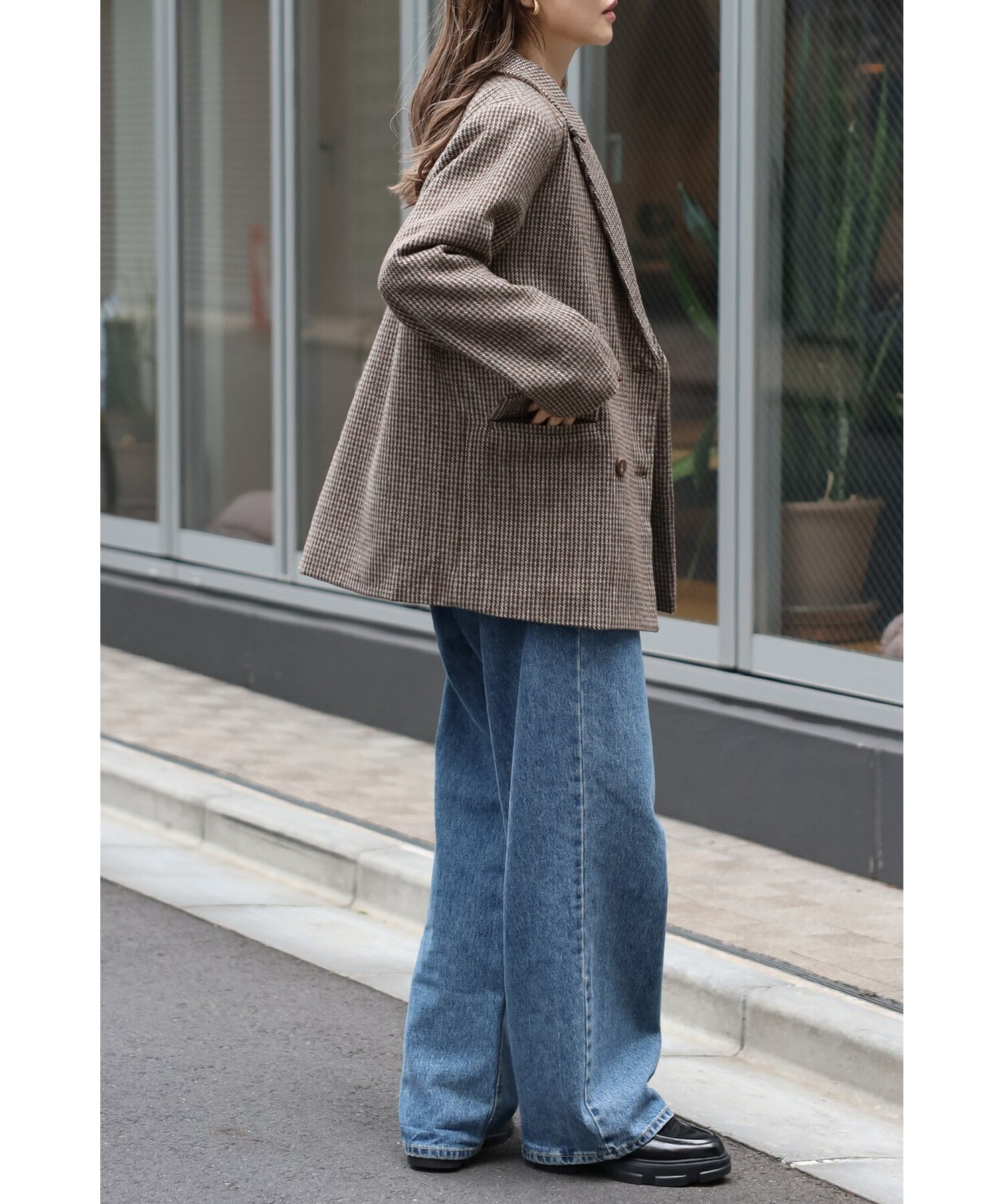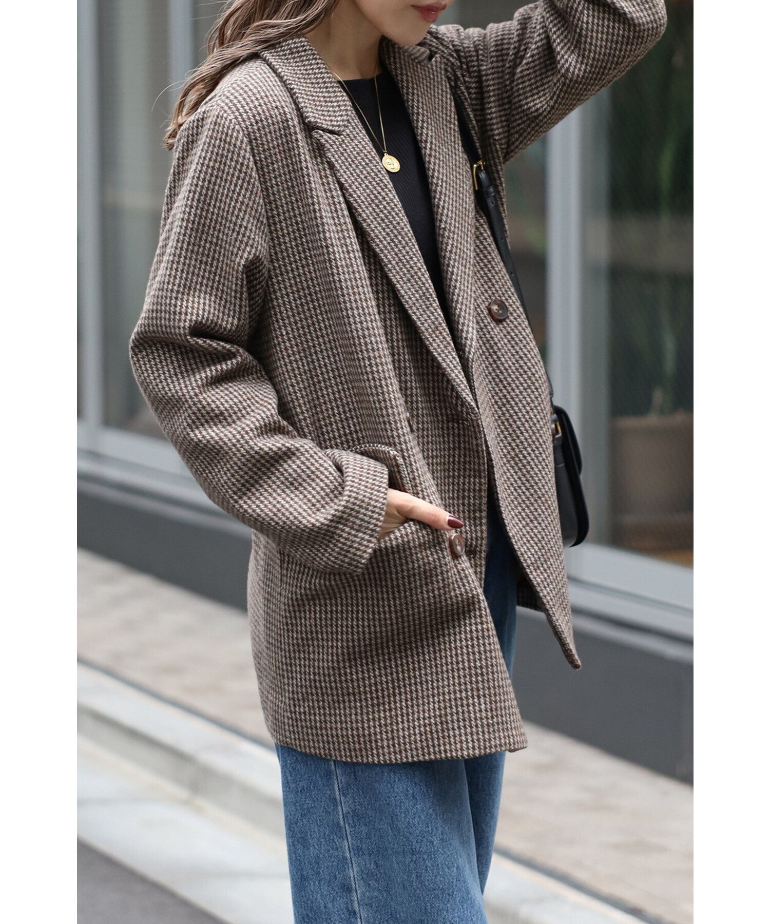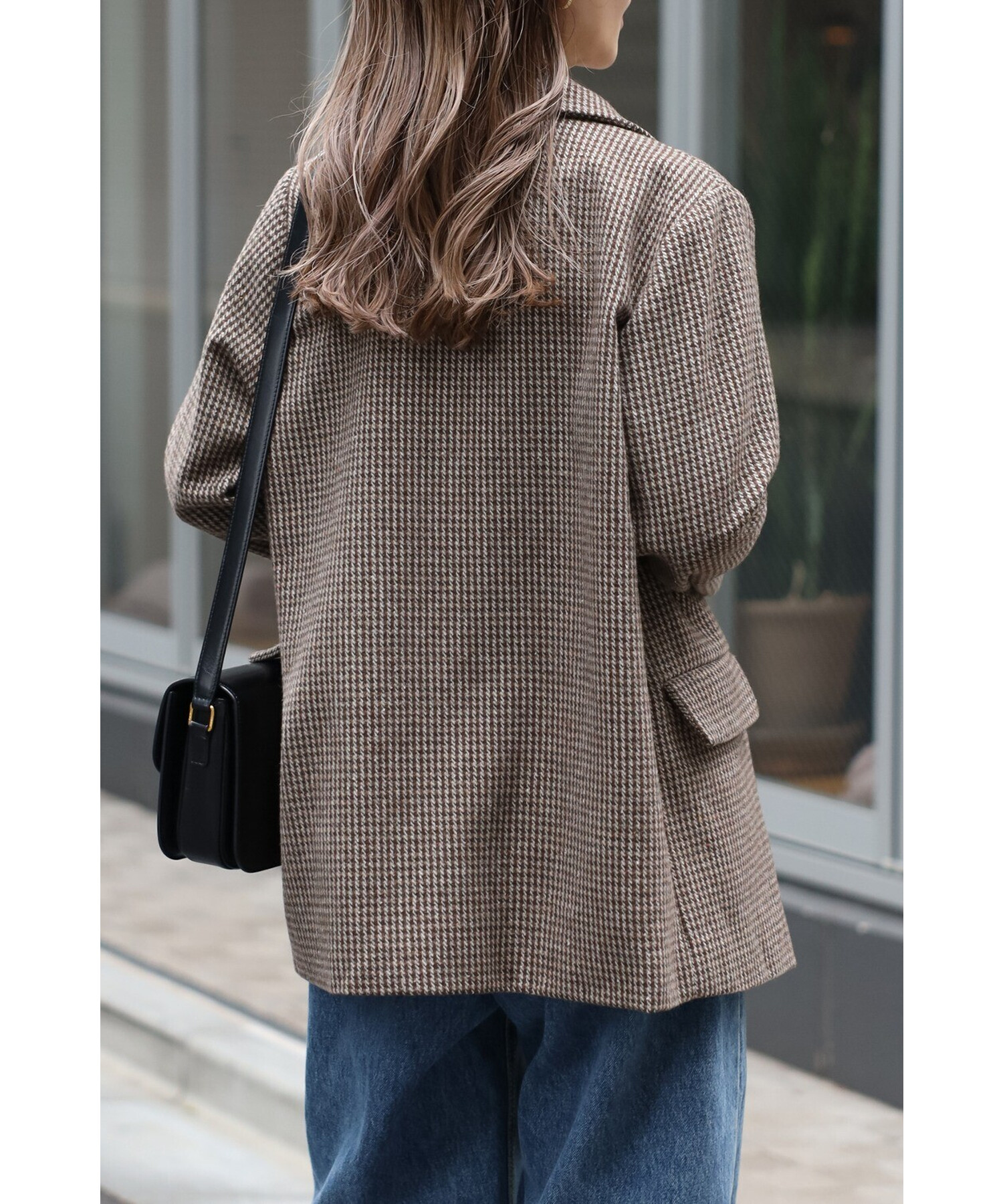 クラシックなガンクラブチェックが上品な印象を与えるダブルブレストジャケット。