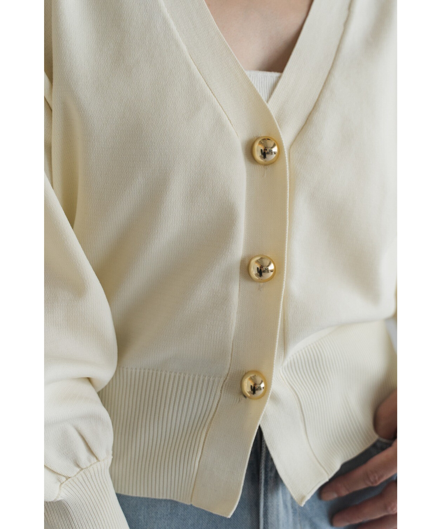 ※同デザインの七分袖タイプゴールドボタンパフスリーブVネックニットカーディガンもございます。