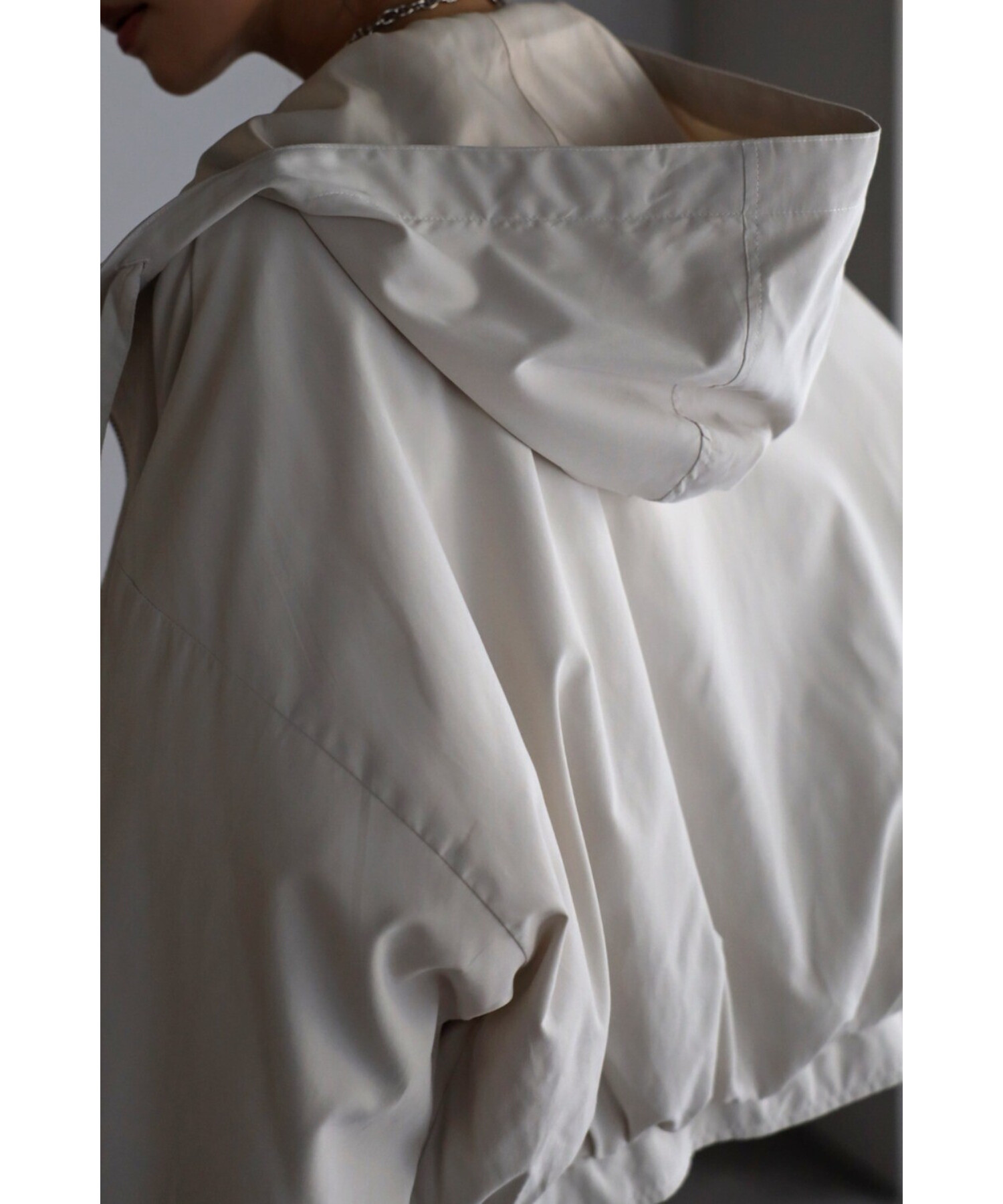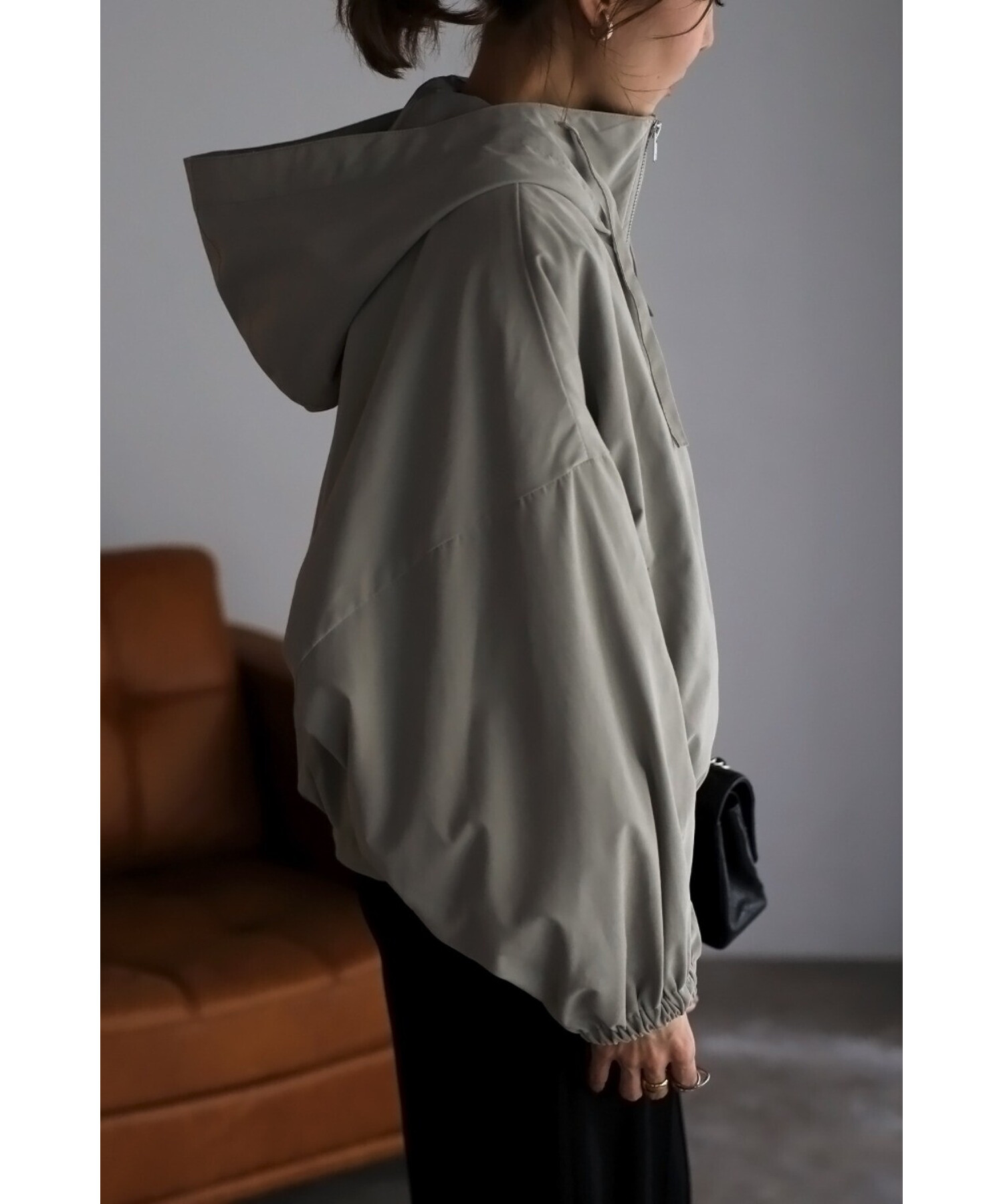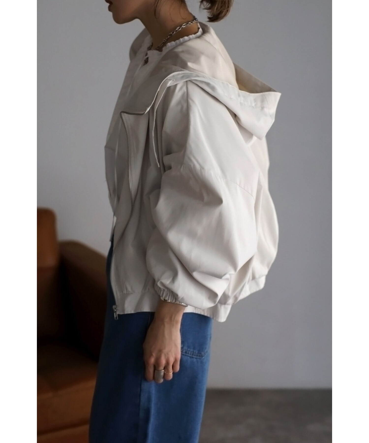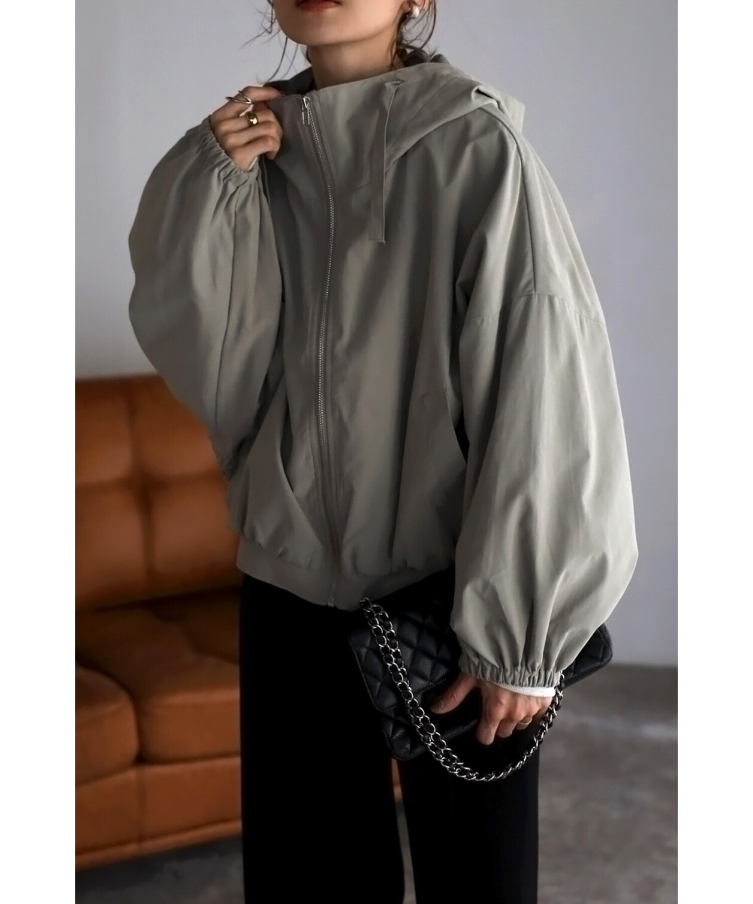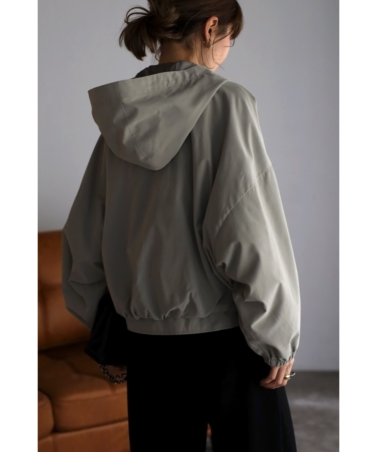 ショート丈の羽織りやすいサイズ感で、コクーンシルエットとギャザースリーブが可愛い印象。