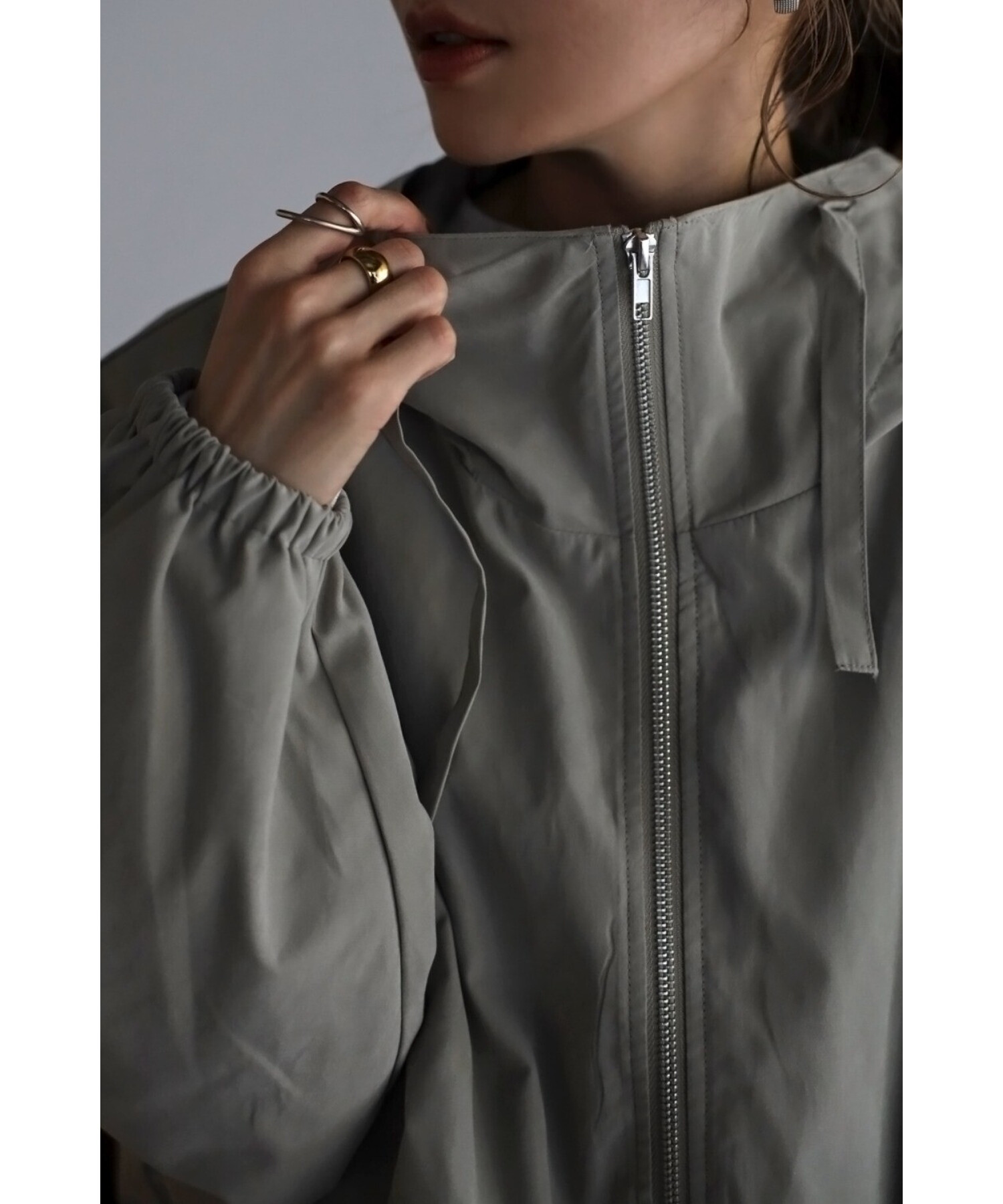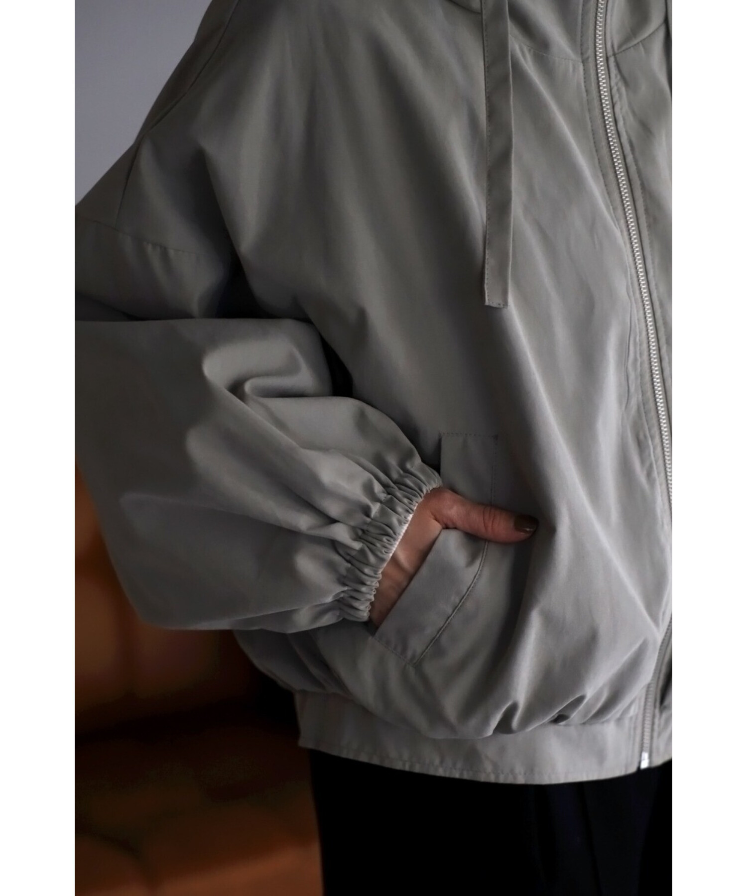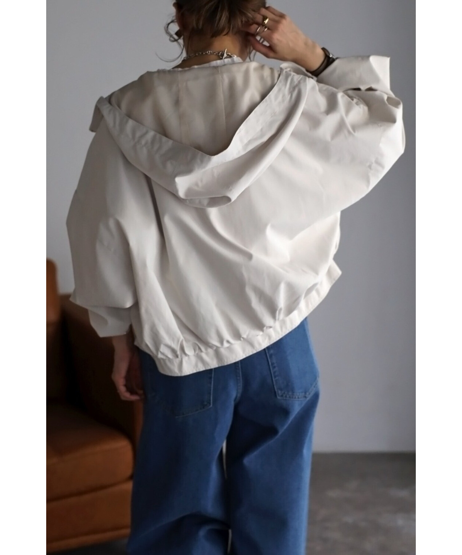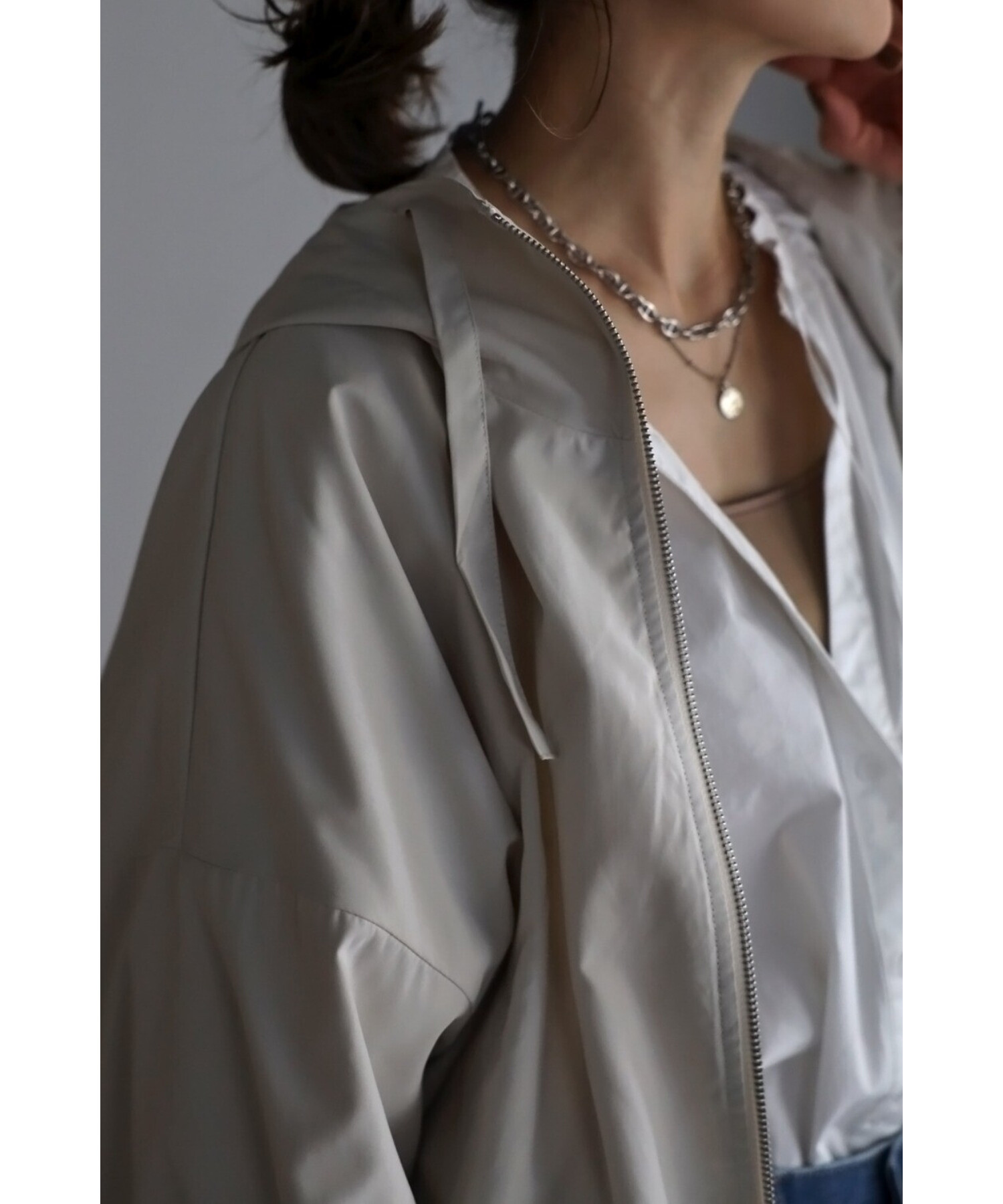 ショート丈の羽織りやすいサイズ感で、コクーンシルエットとギャザースリーブが可愛い印象。