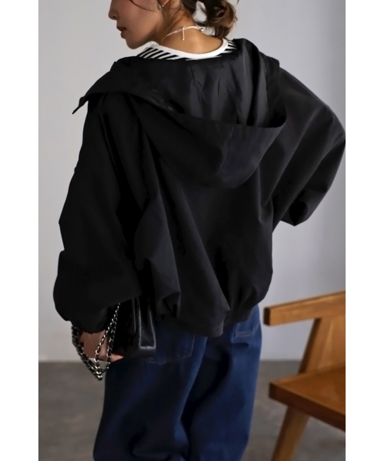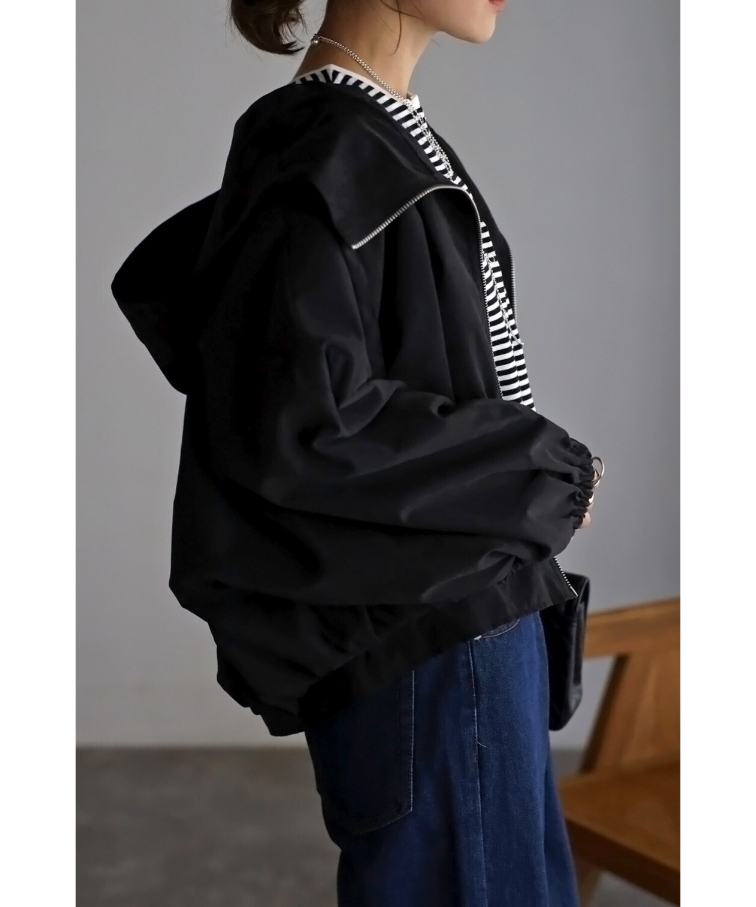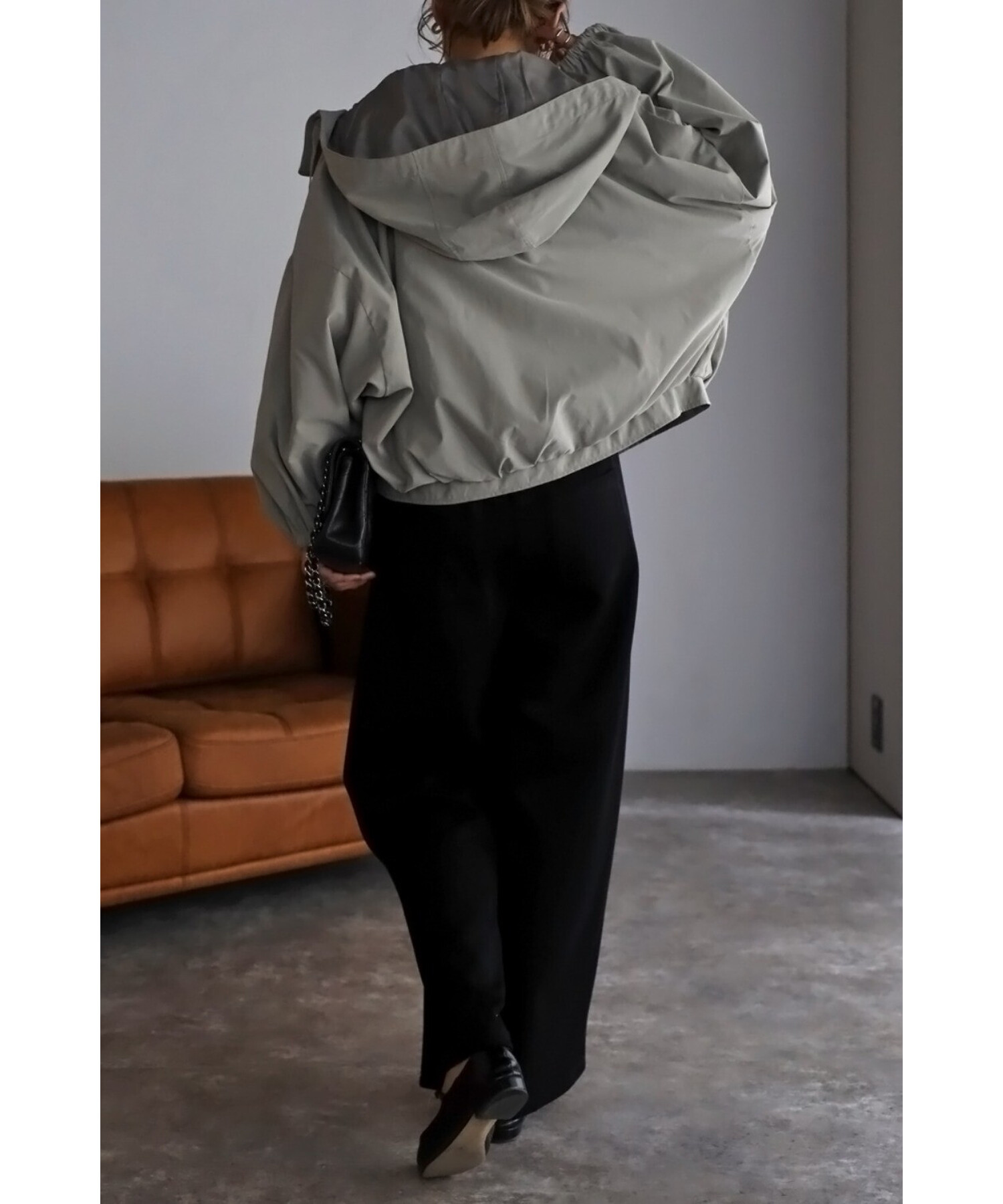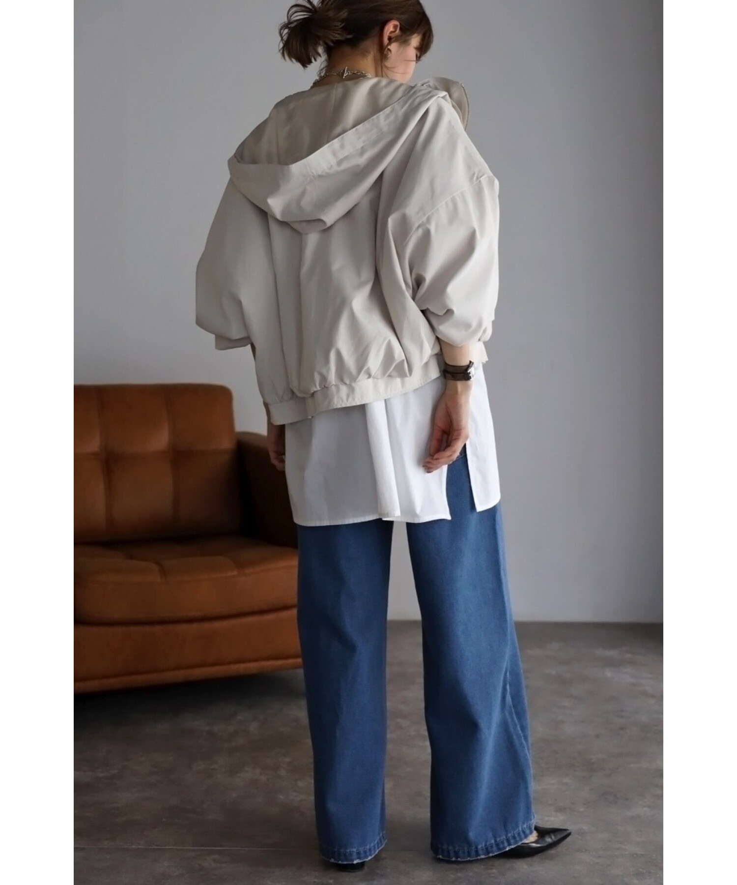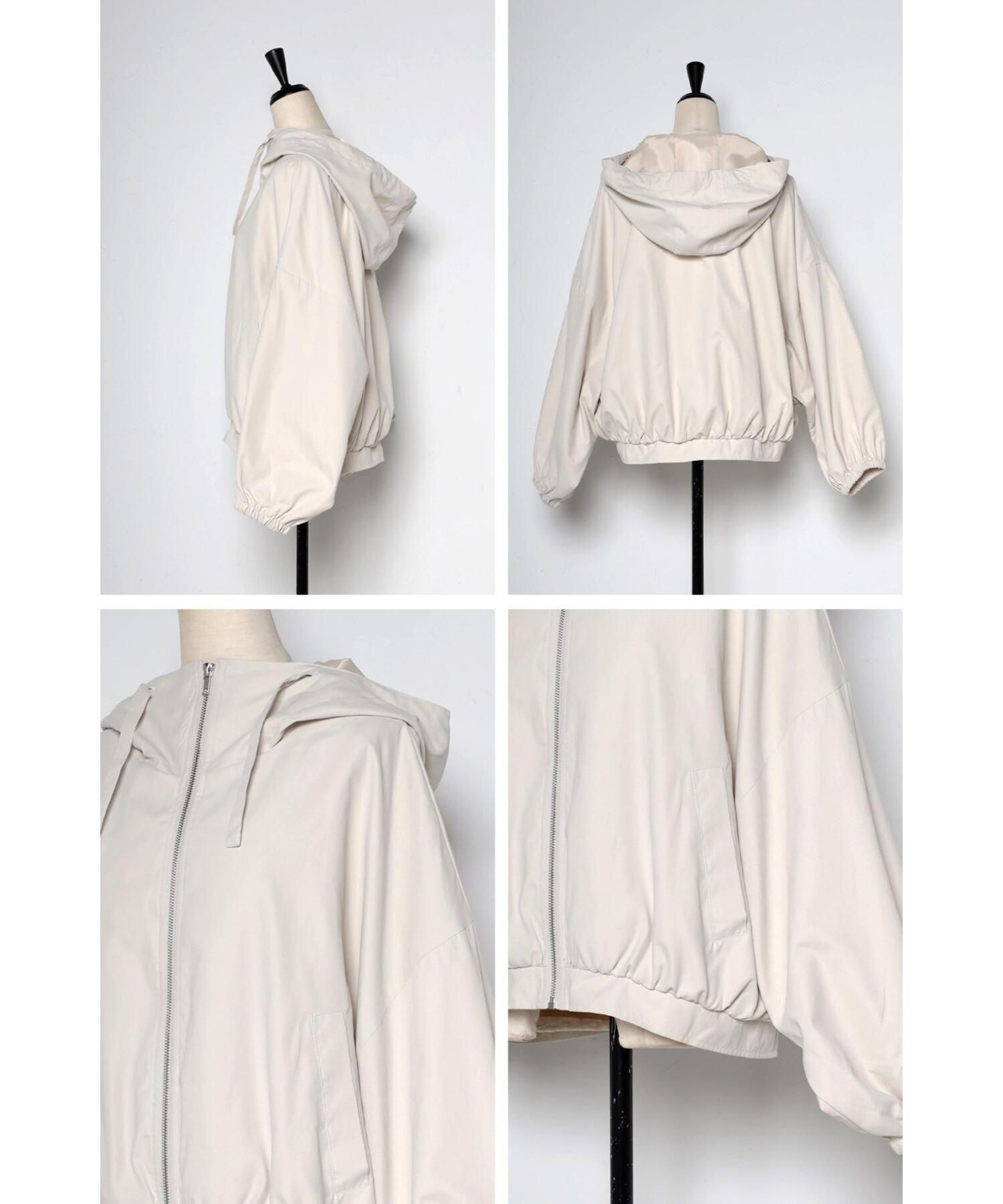 ショート丈の羽織りやすいサイズ感で、コクーンシルエットとギャザースリーブが可愛い印象。