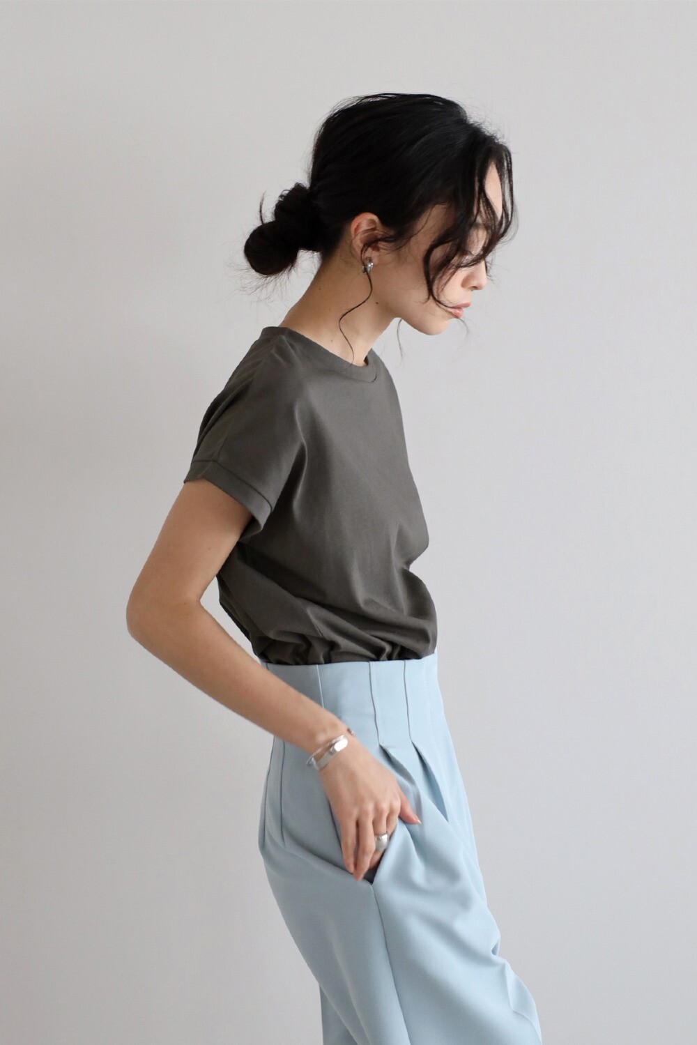 フレンチスリーブの程よい肩の落ち感で、自然な華奢見えシルエットを演出。