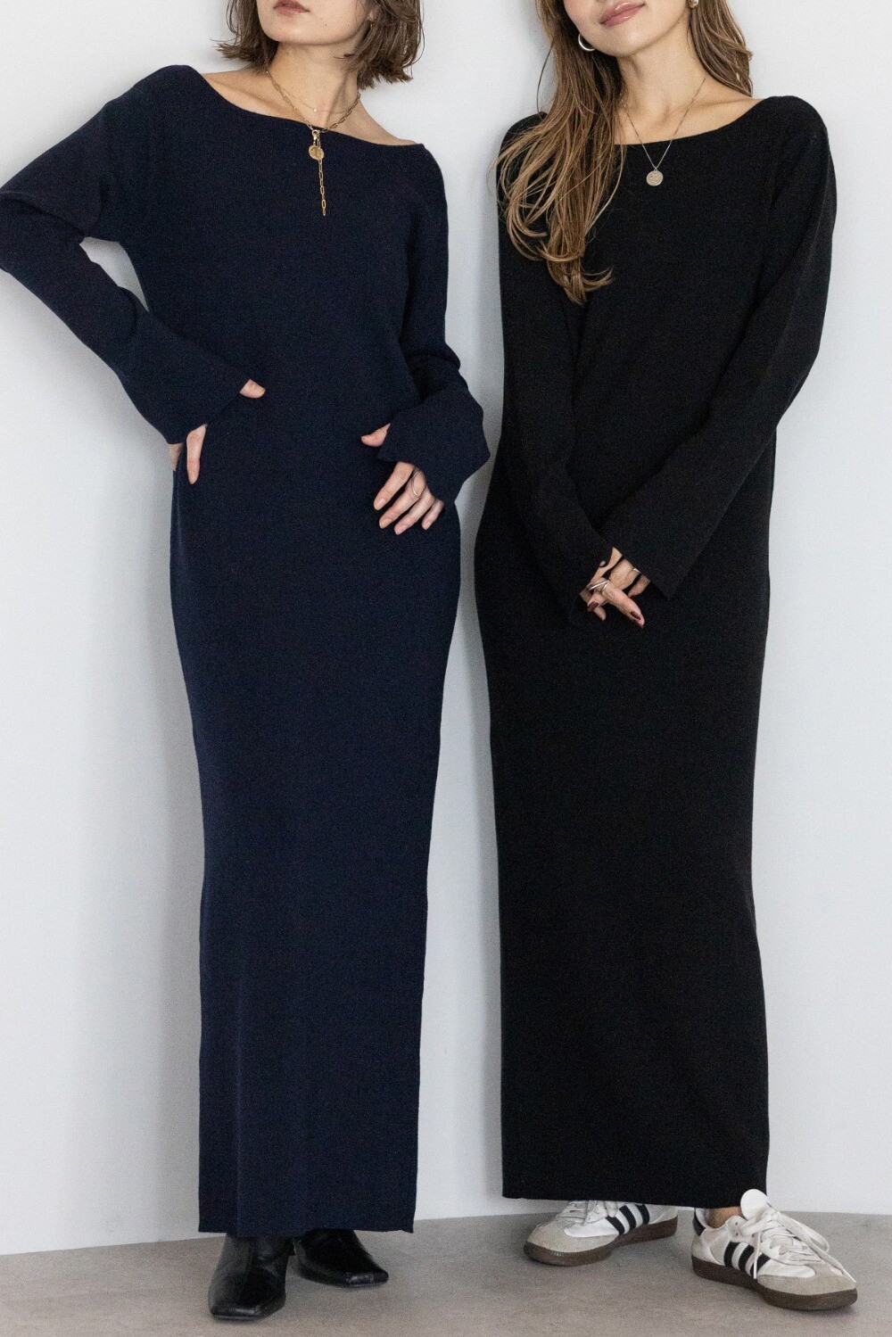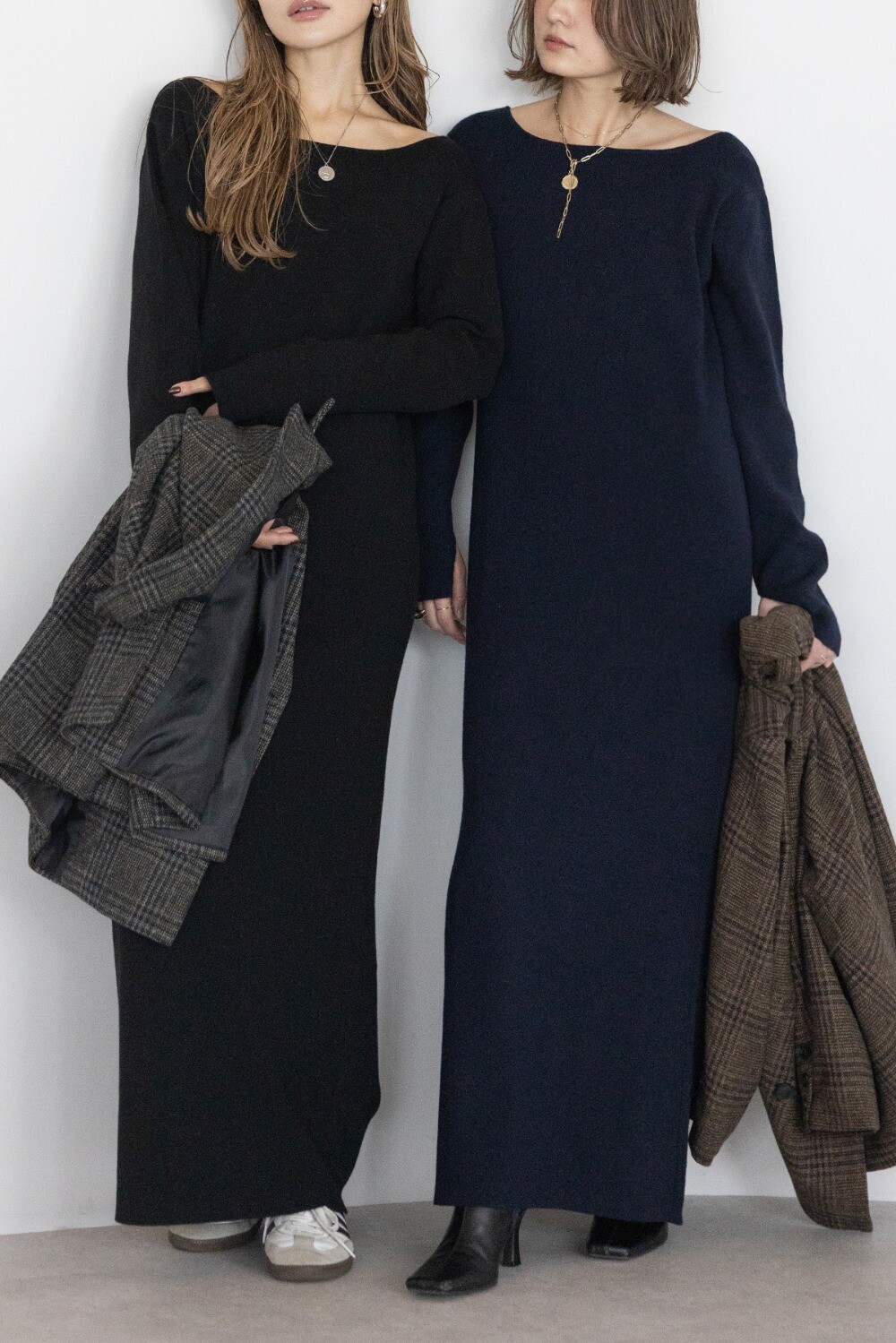 ネックラインの異なるバランスを楽しめるロングワンピースです。