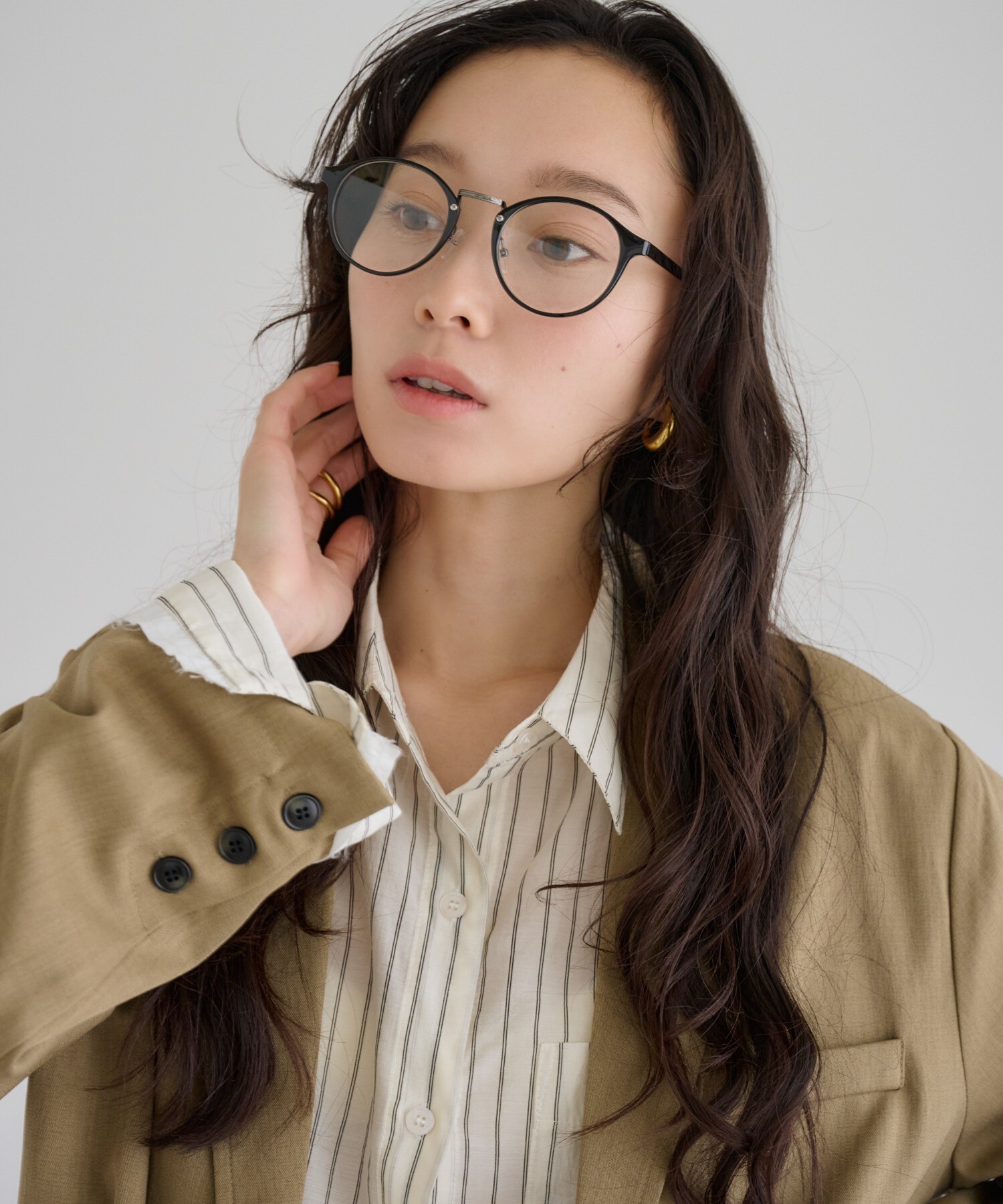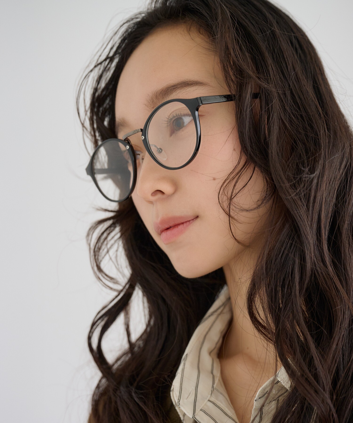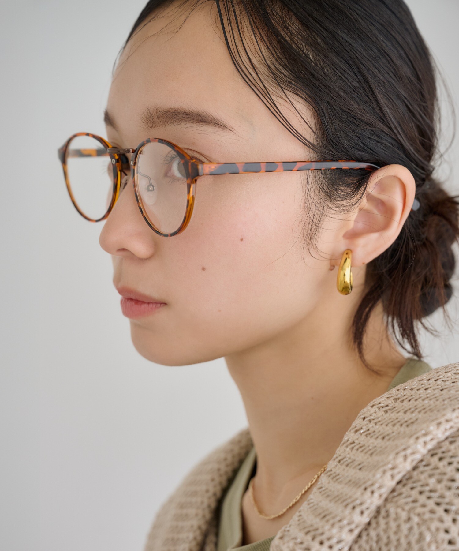 丸みのあるフォルムがやわらかな印象を与えながら、顔まわりを知的に引き締めます。