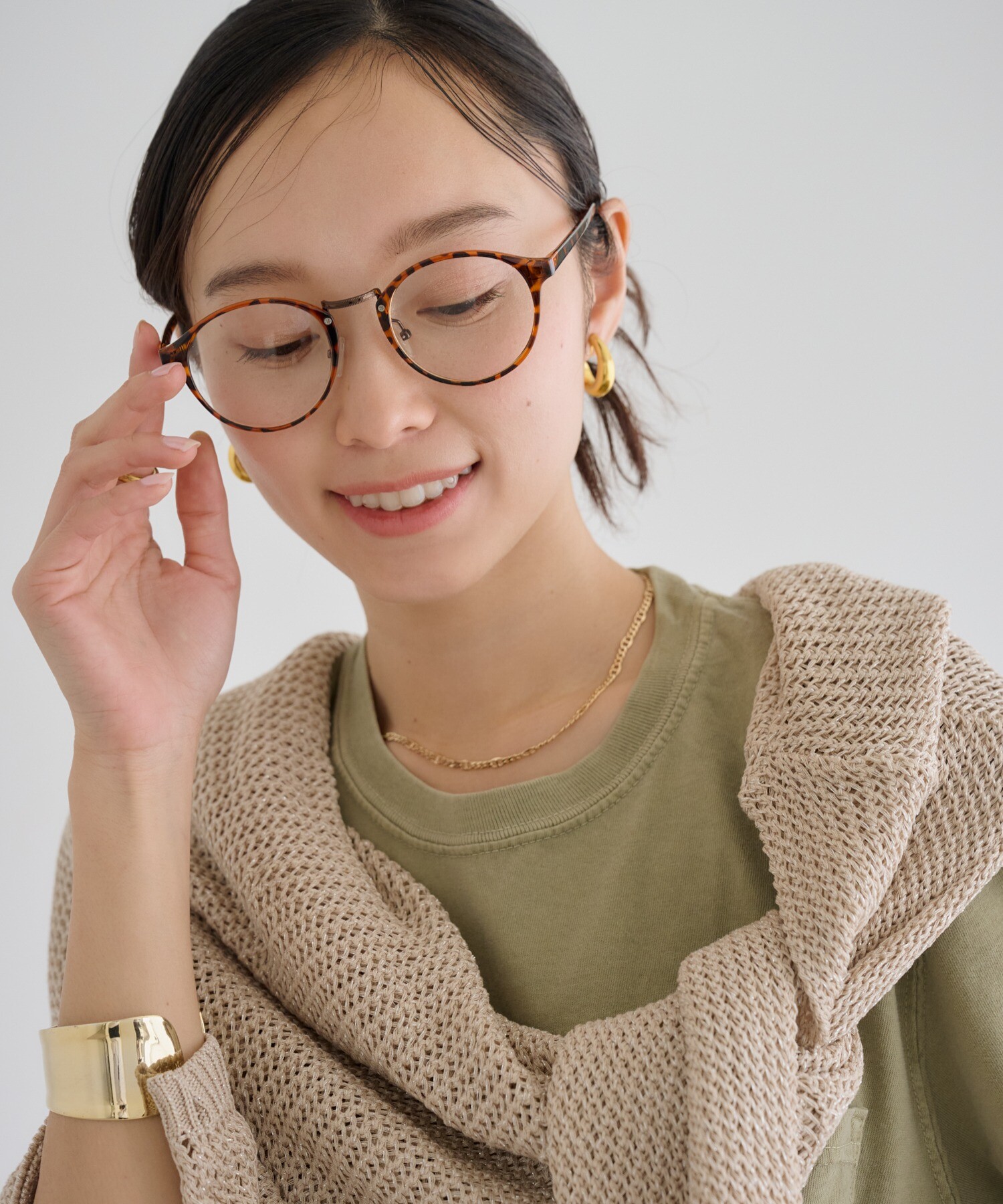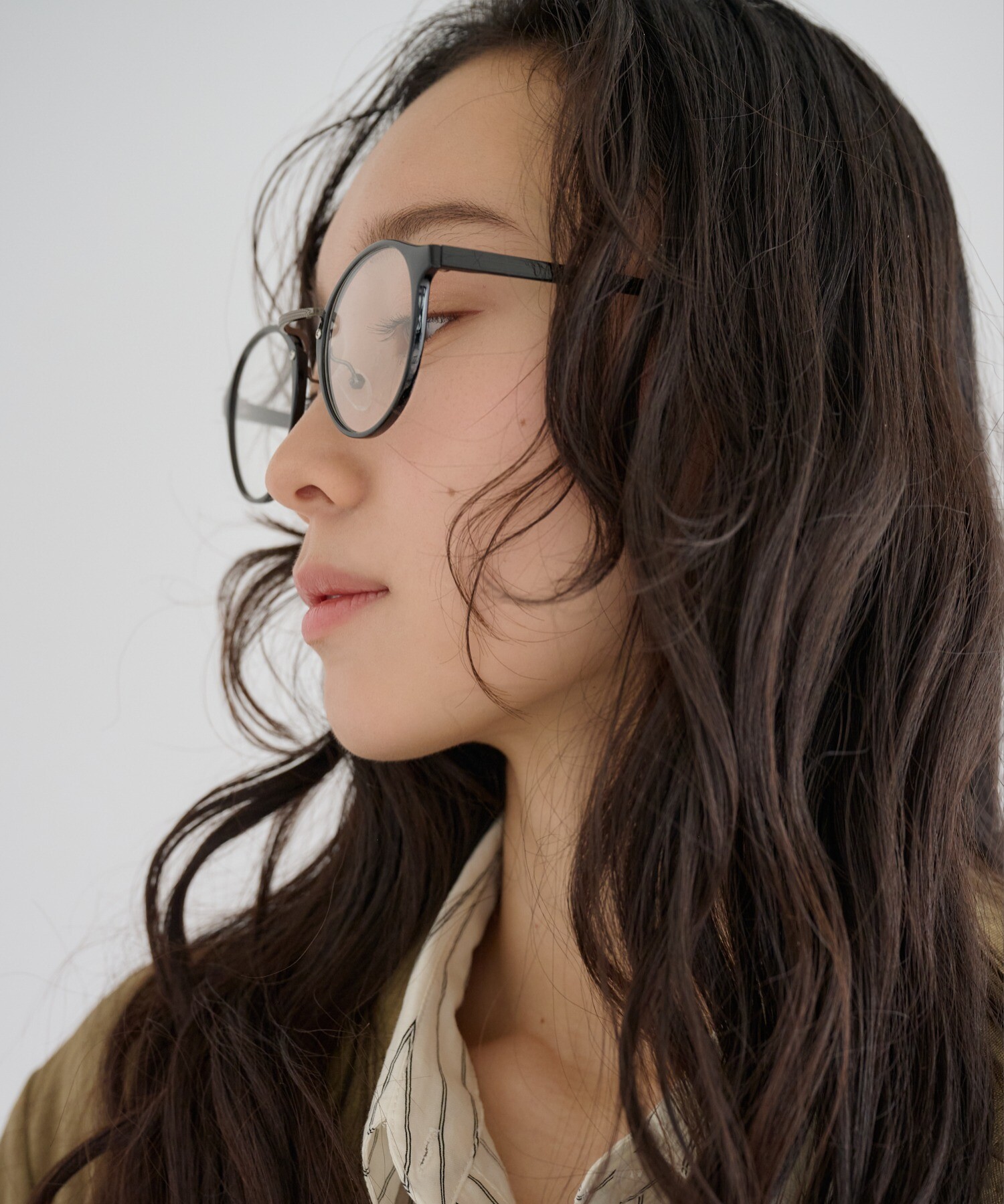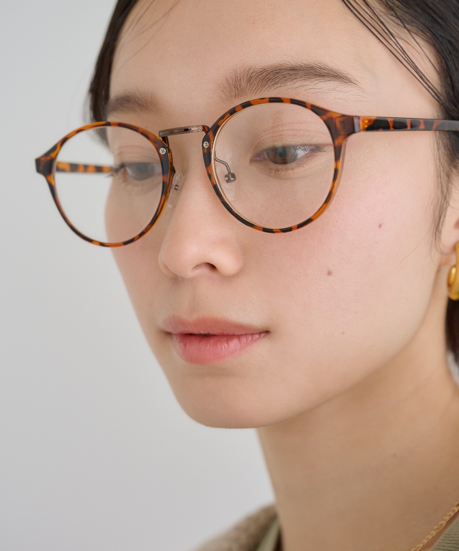 丸みのあるフォルムがやわらかな印象を与えながら、顔まわりを知的に引き締めます。