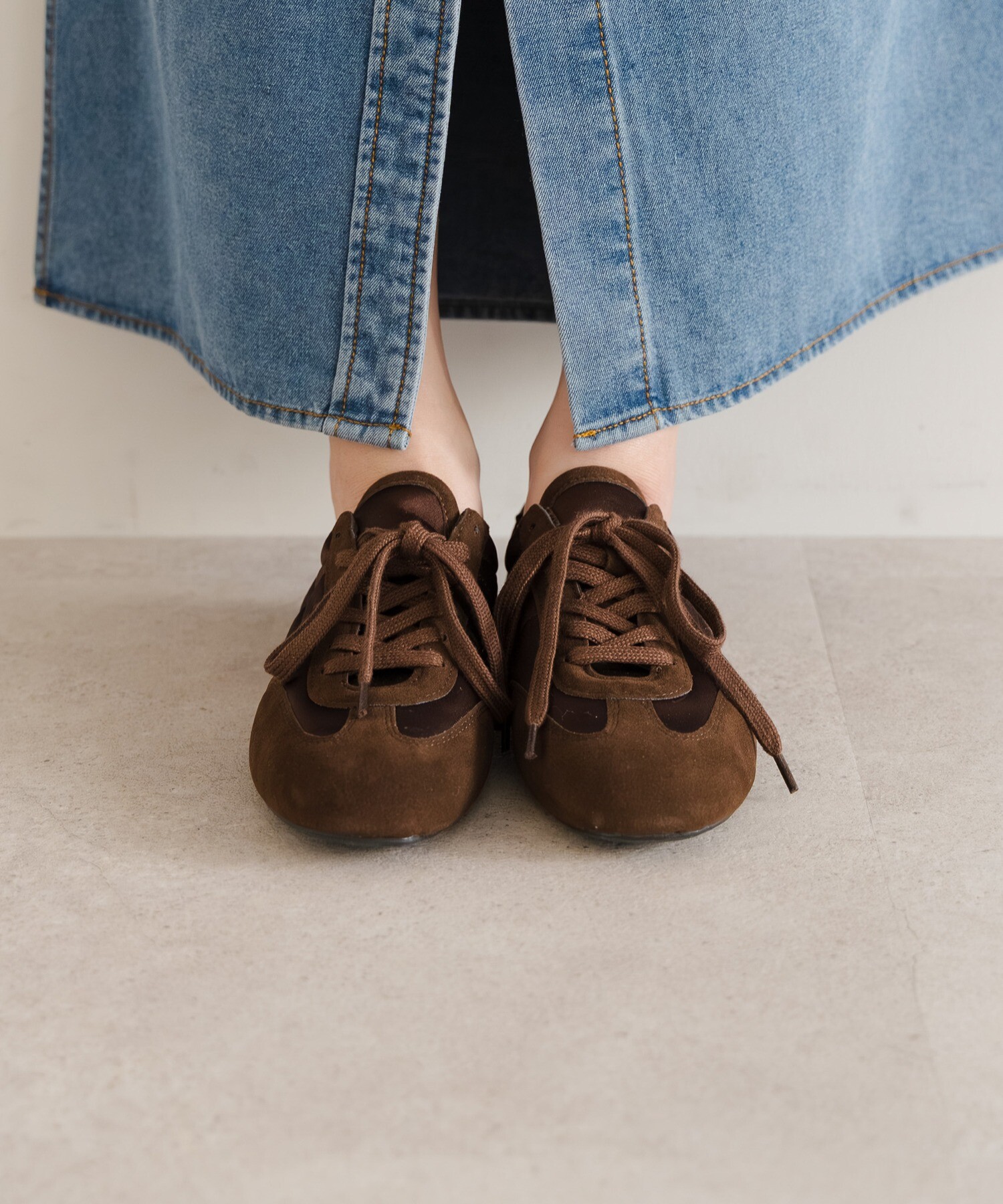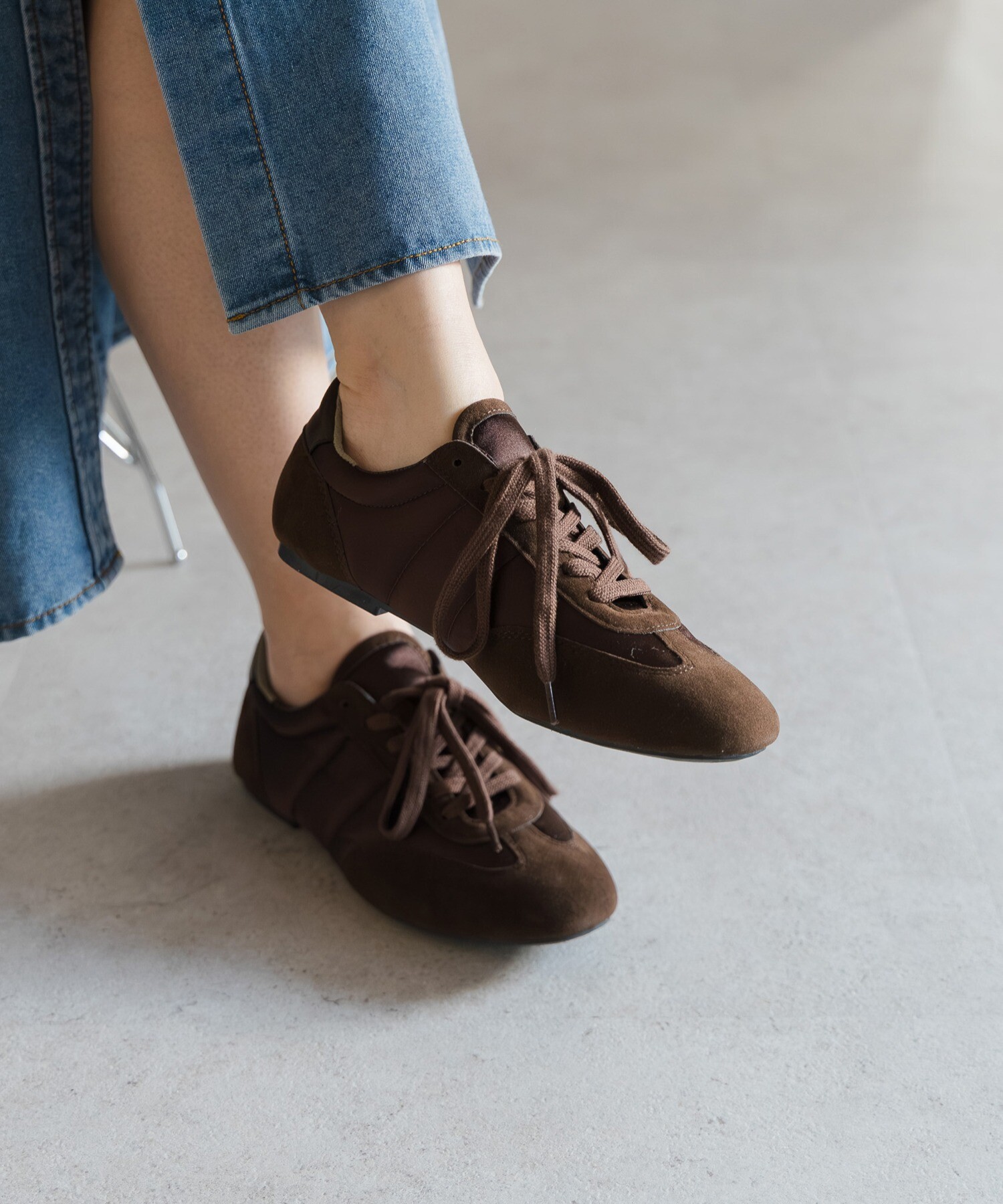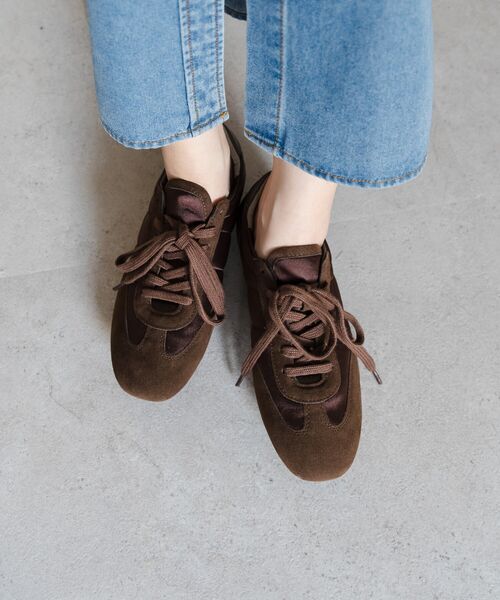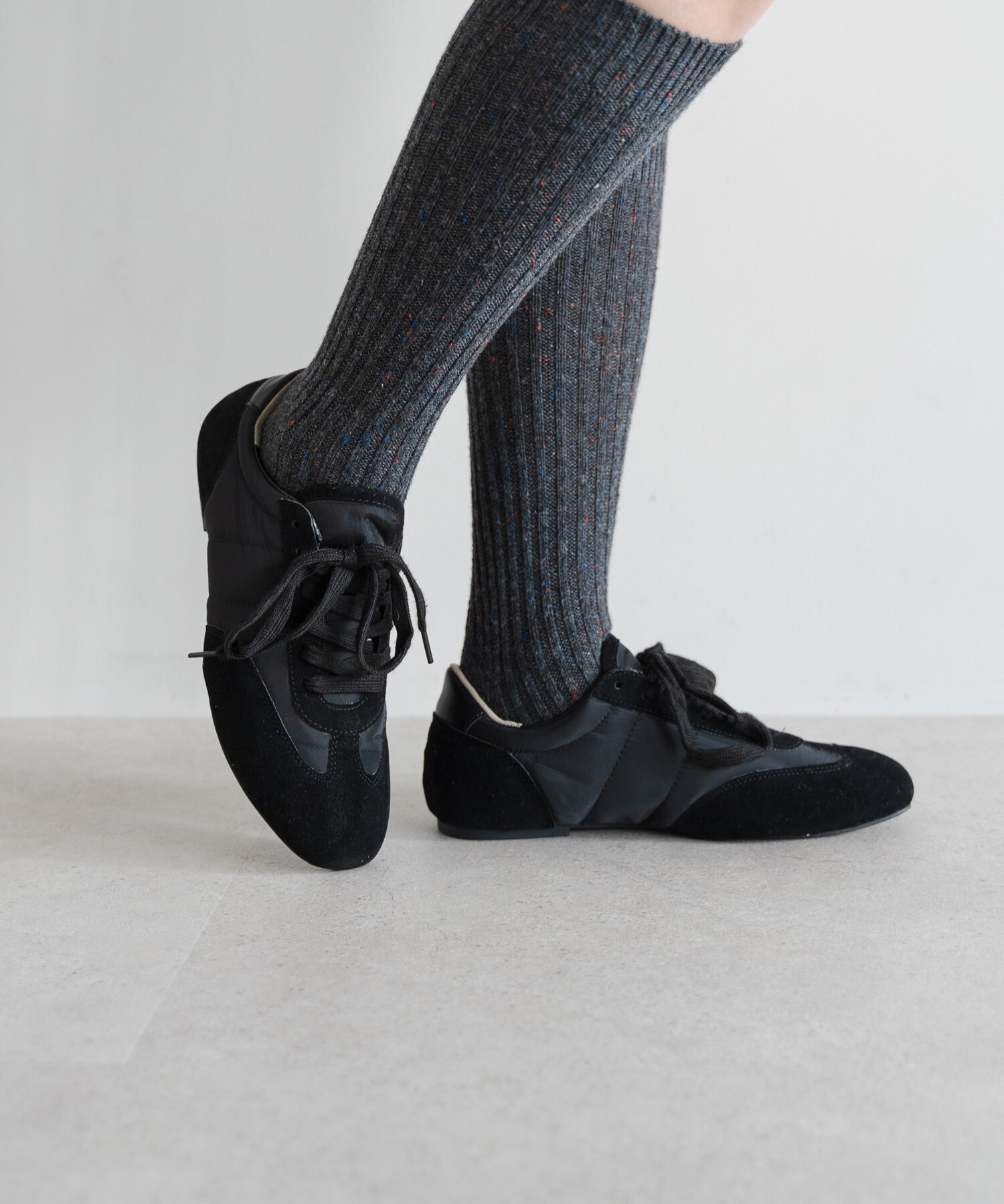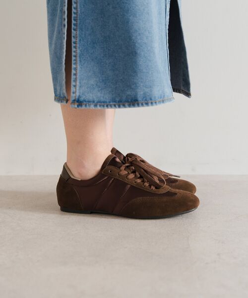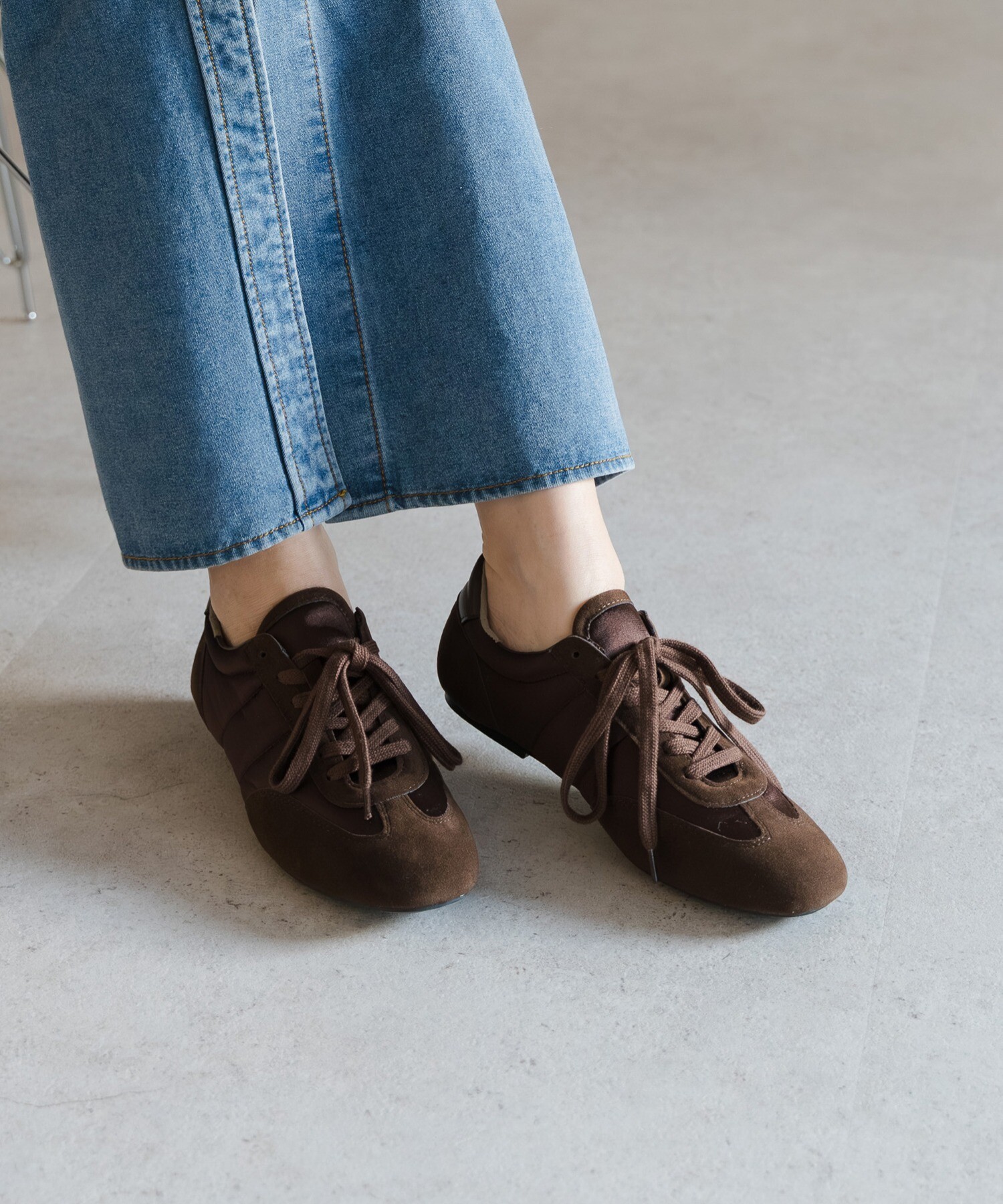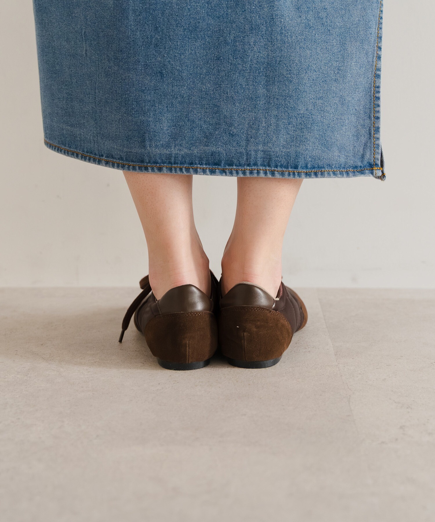 薄底ソールが軽やかなバランスを生み、旬のシルエットに。