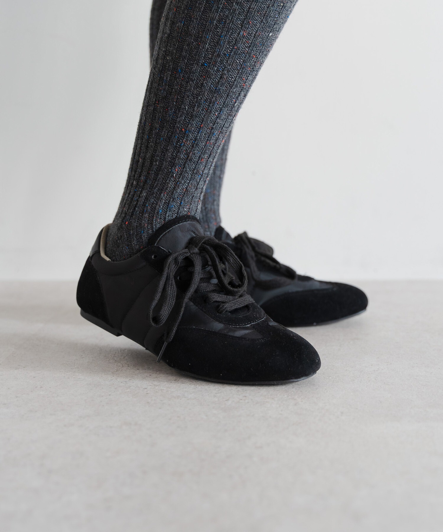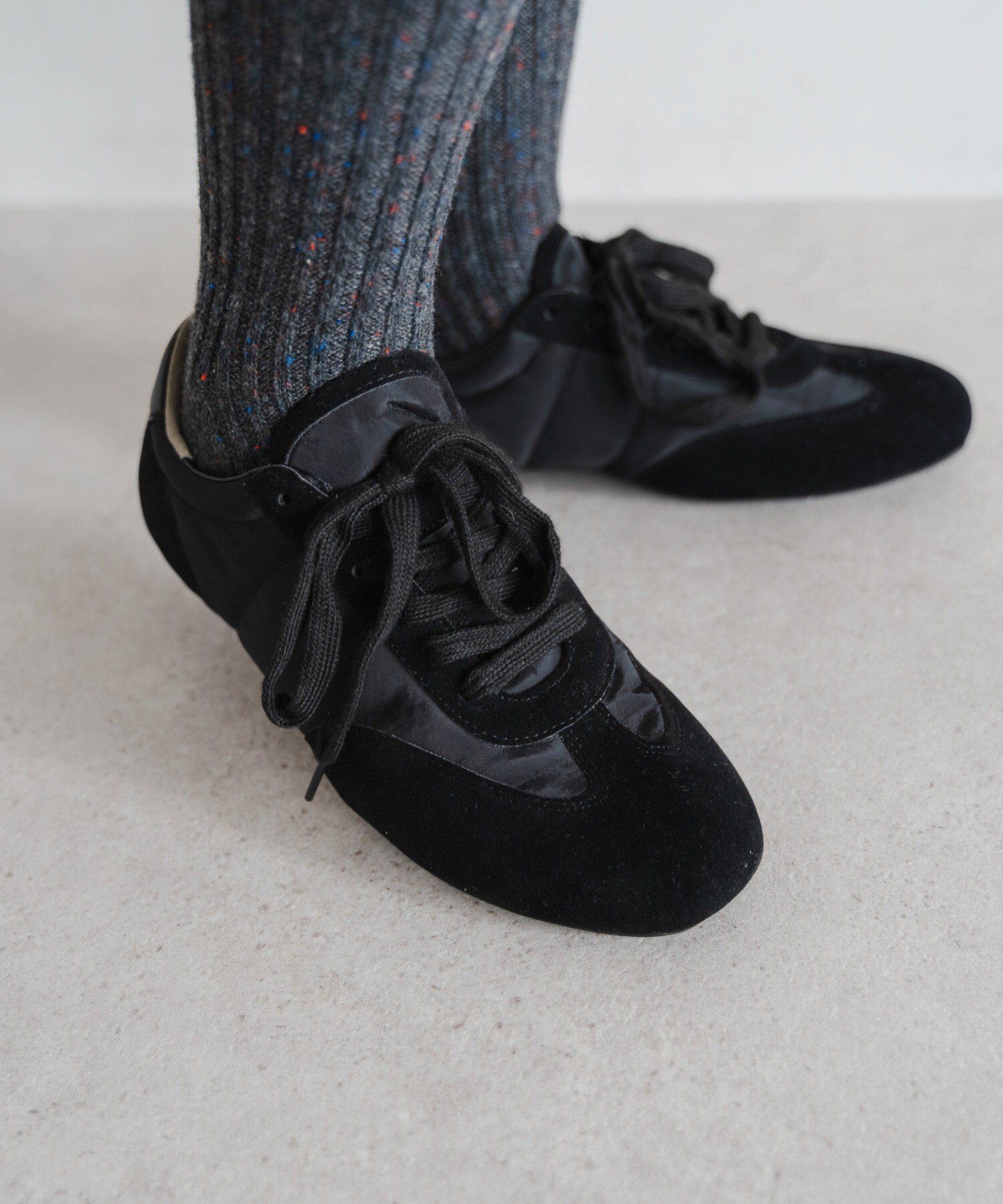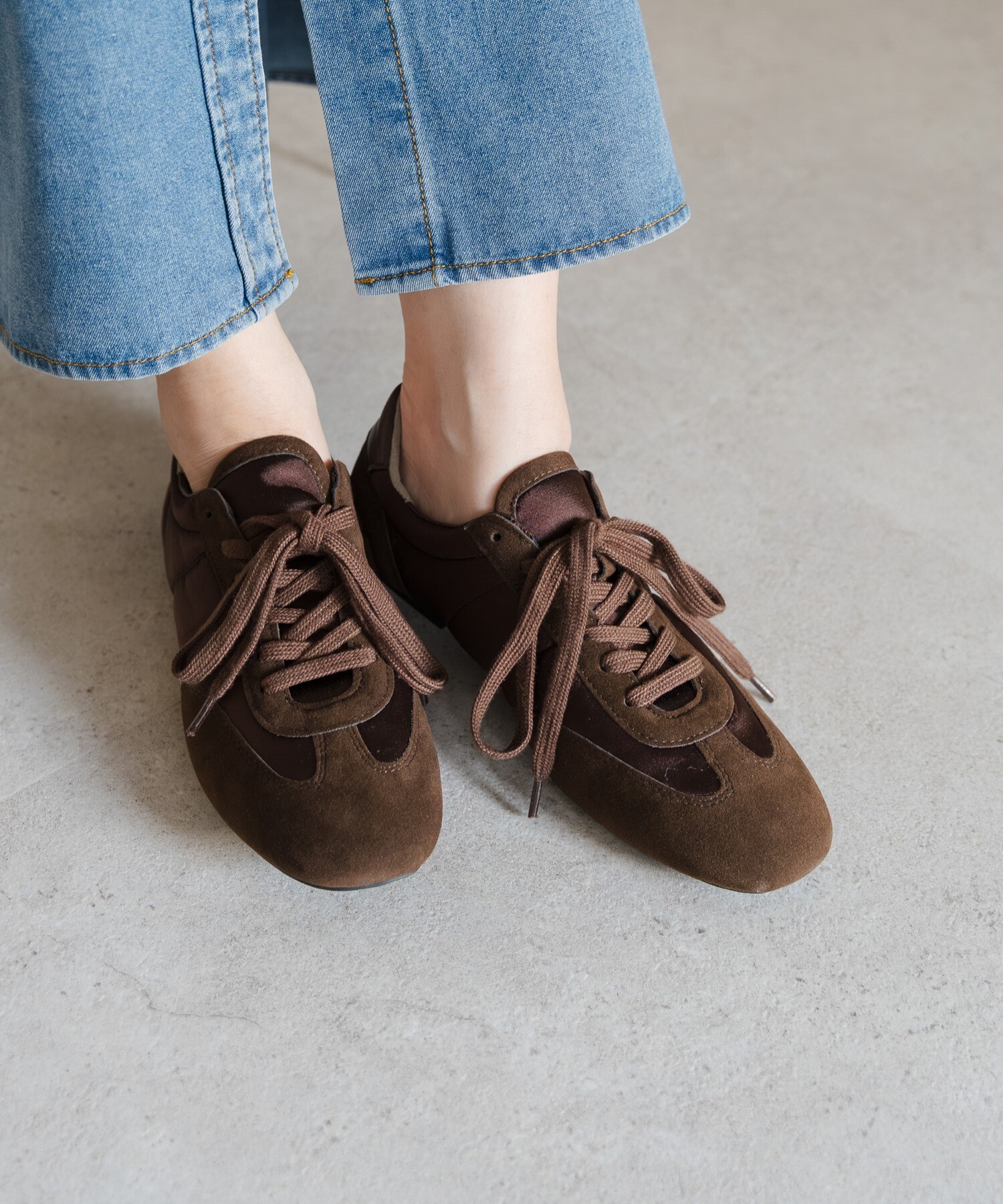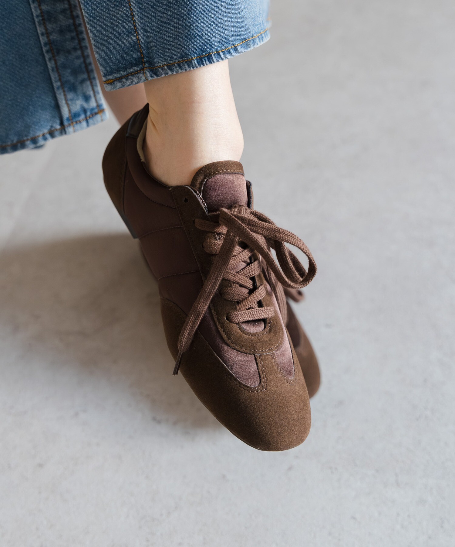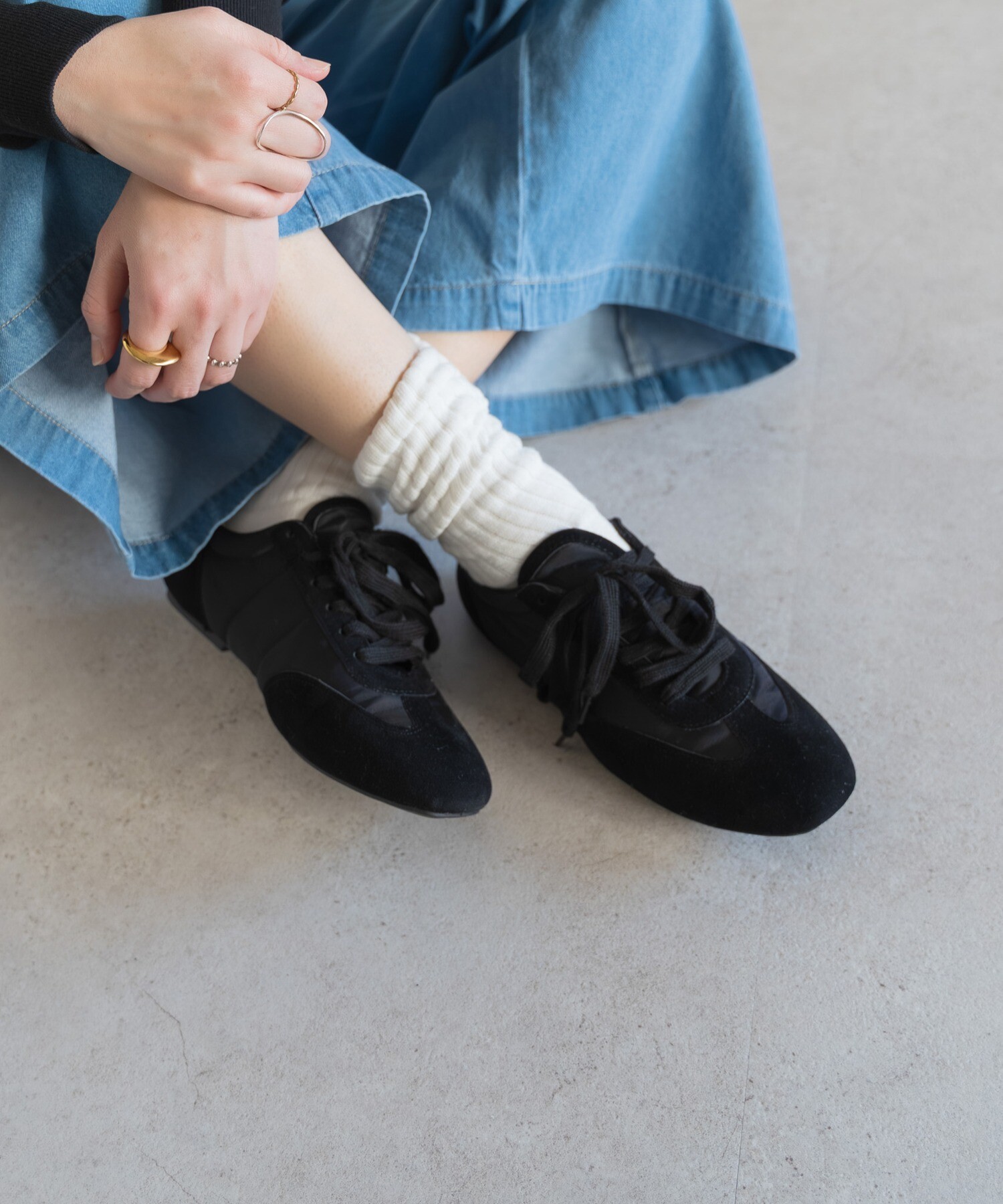 薄底ソールが軽やかなバランスを生み、旬のシルエットに。