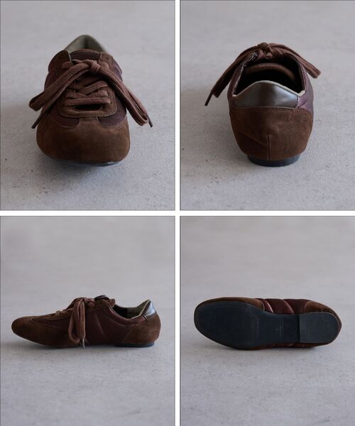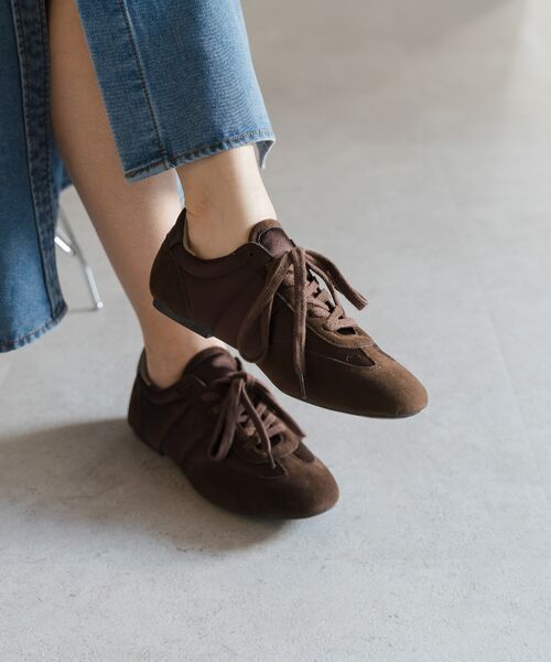 スエード調素材とファブリックの切り替えが、奥行きのある表情を添えます。