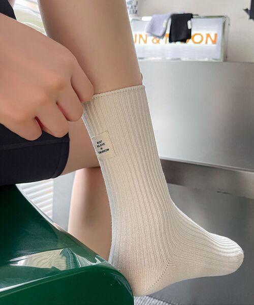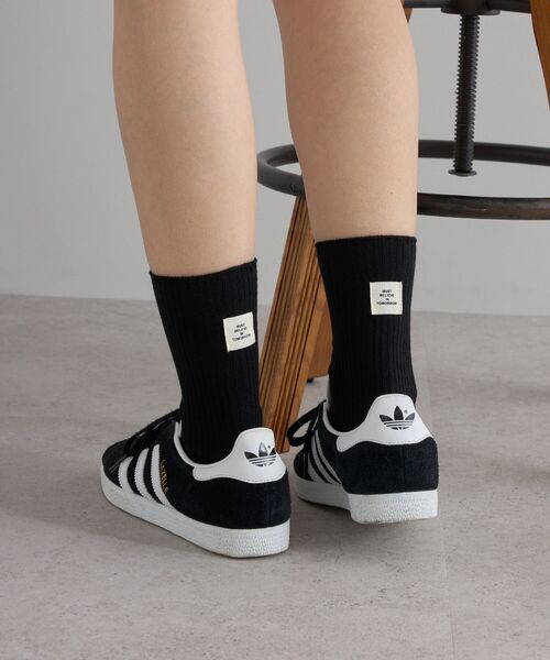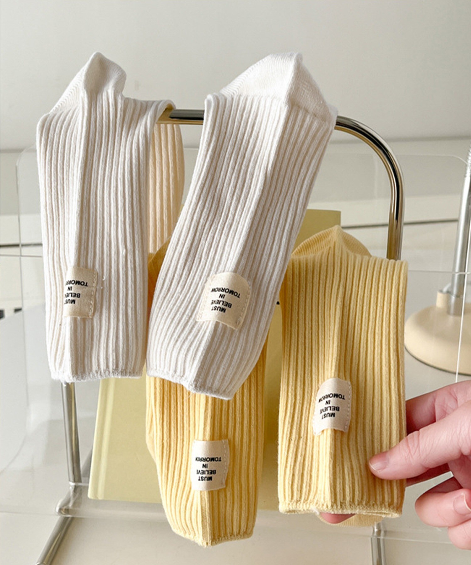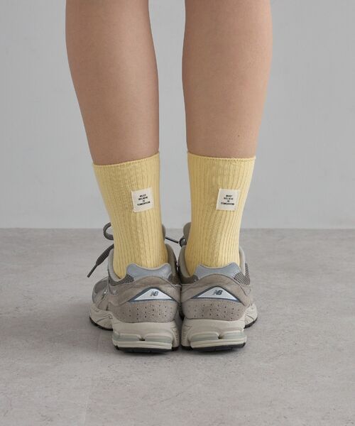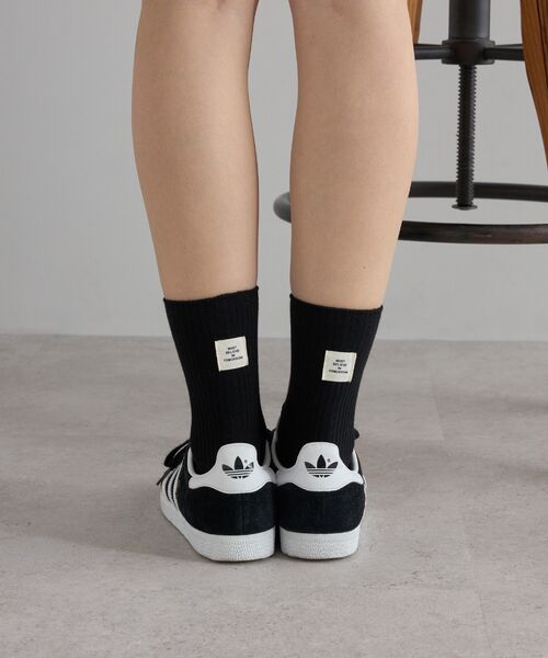 シンプルな中に個性が光る、ホワイト・ブラック・イエローのタグ風ラベルデザインのセット靴下。