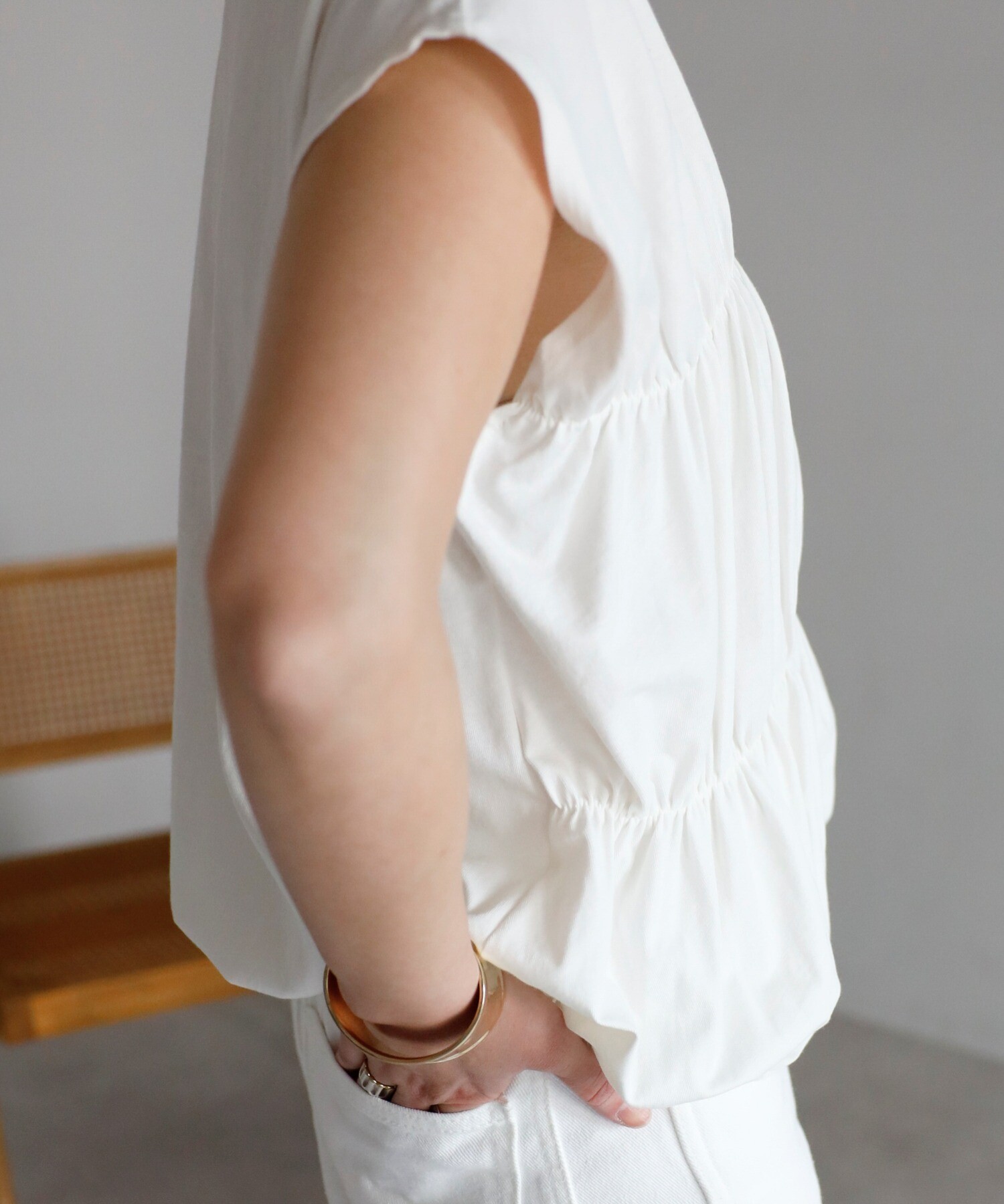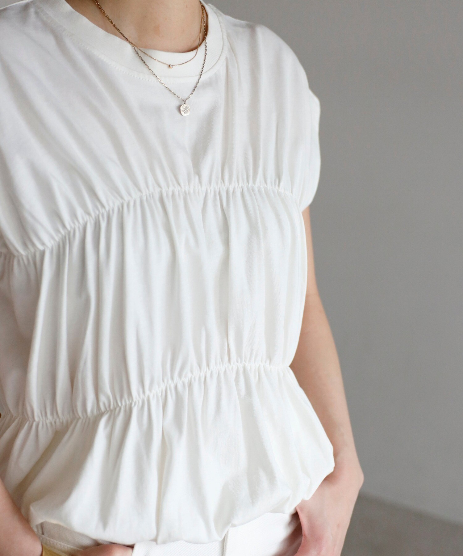 一枚で決まるギャザー切替フレンチスリーブトップス