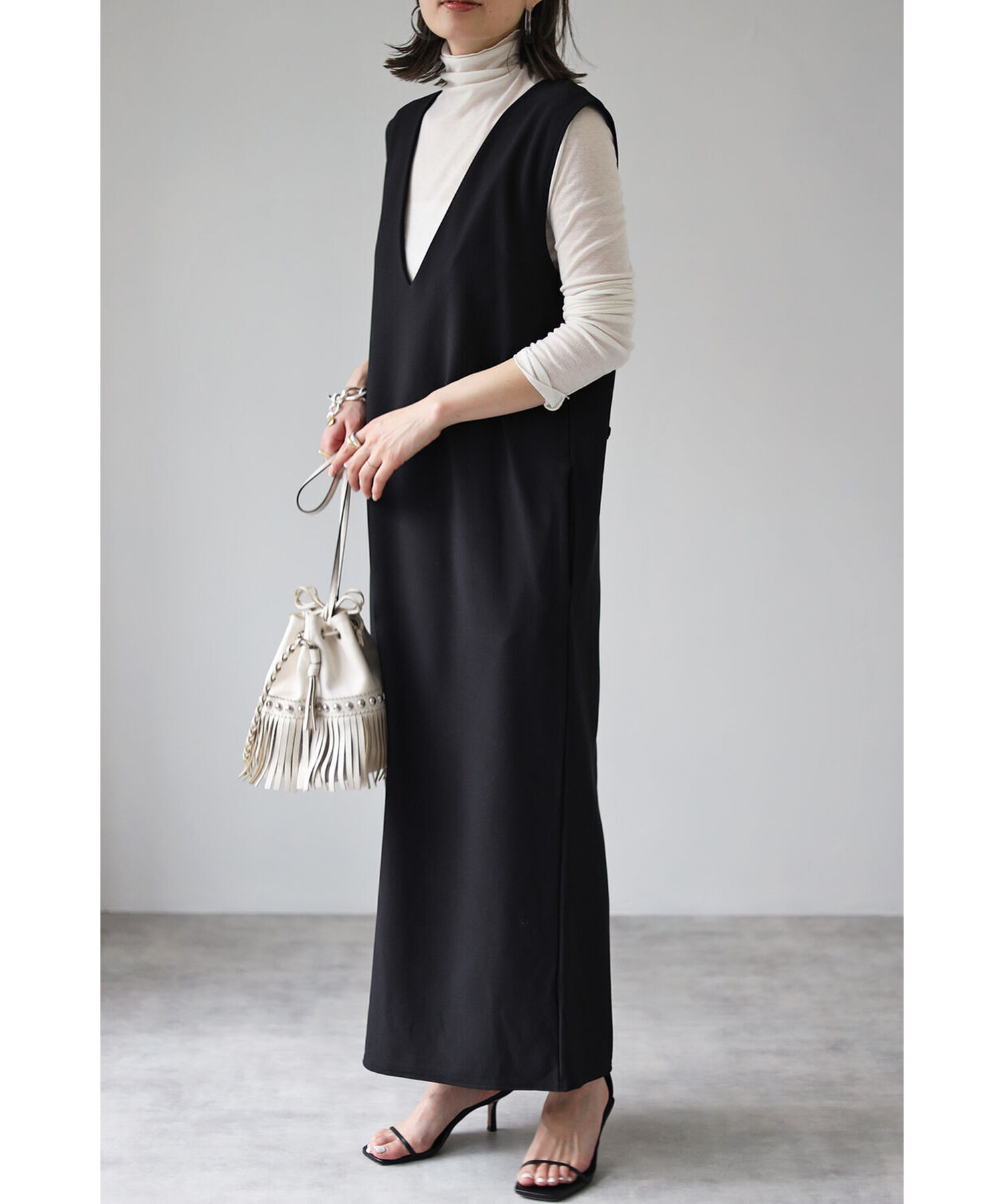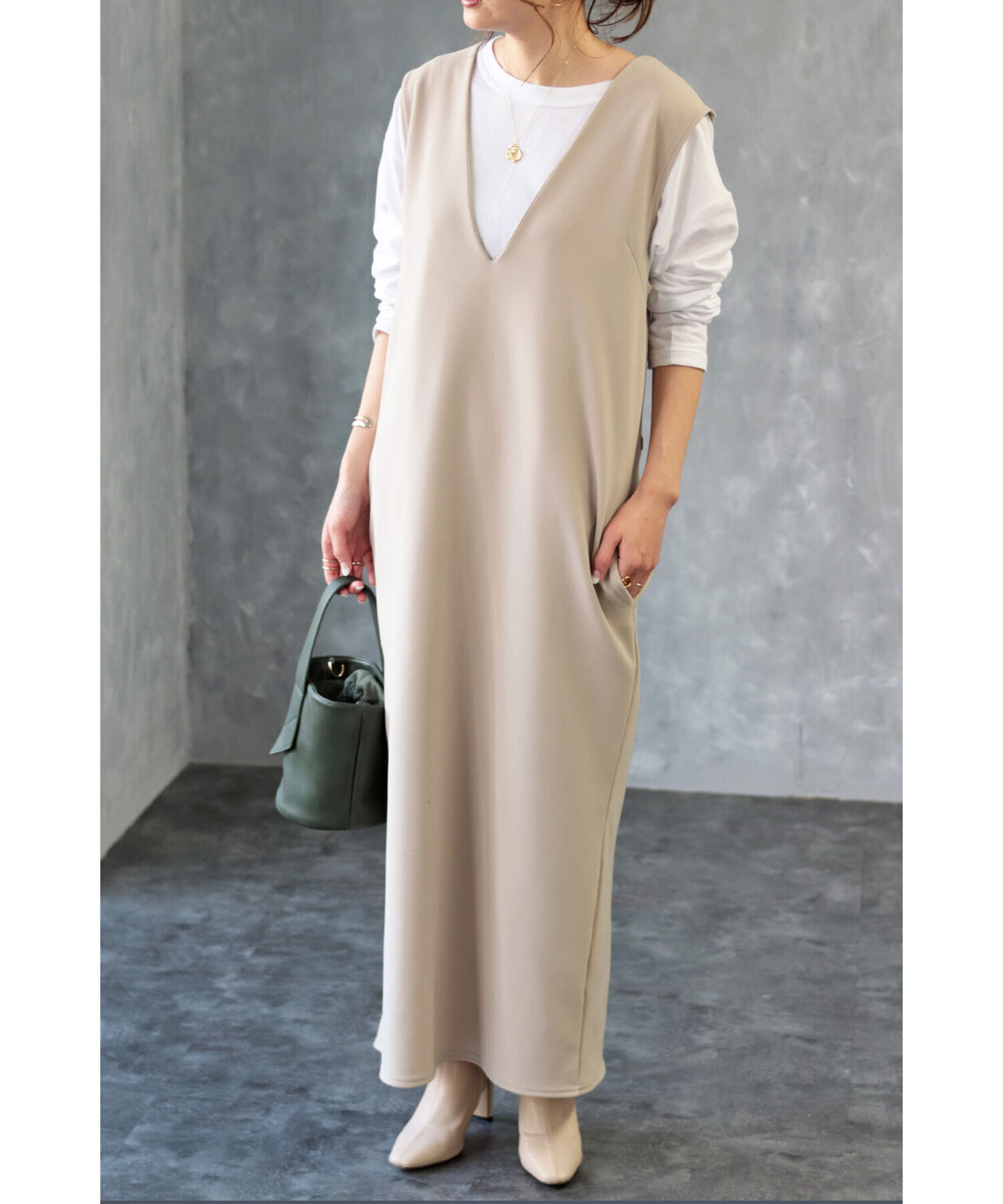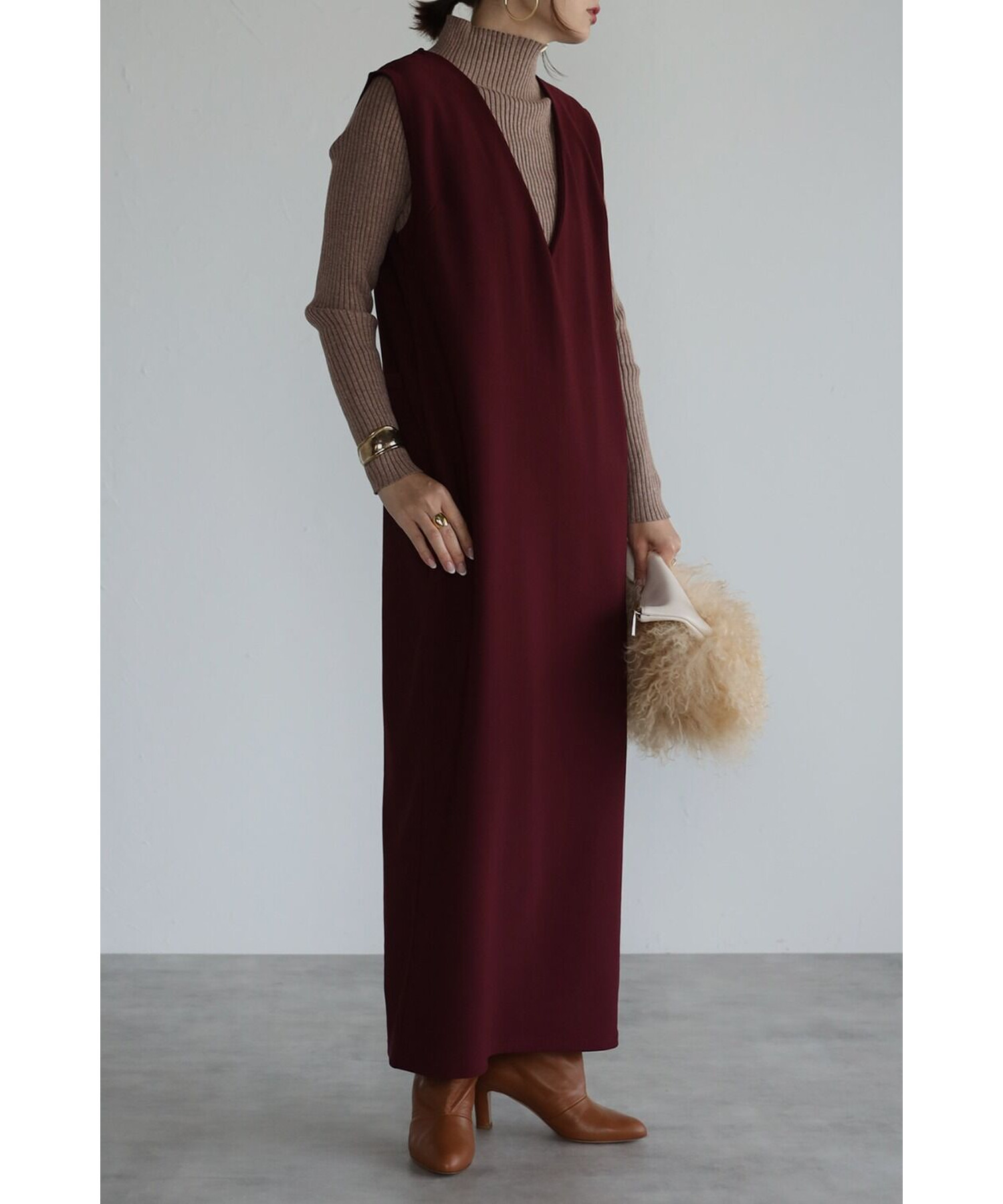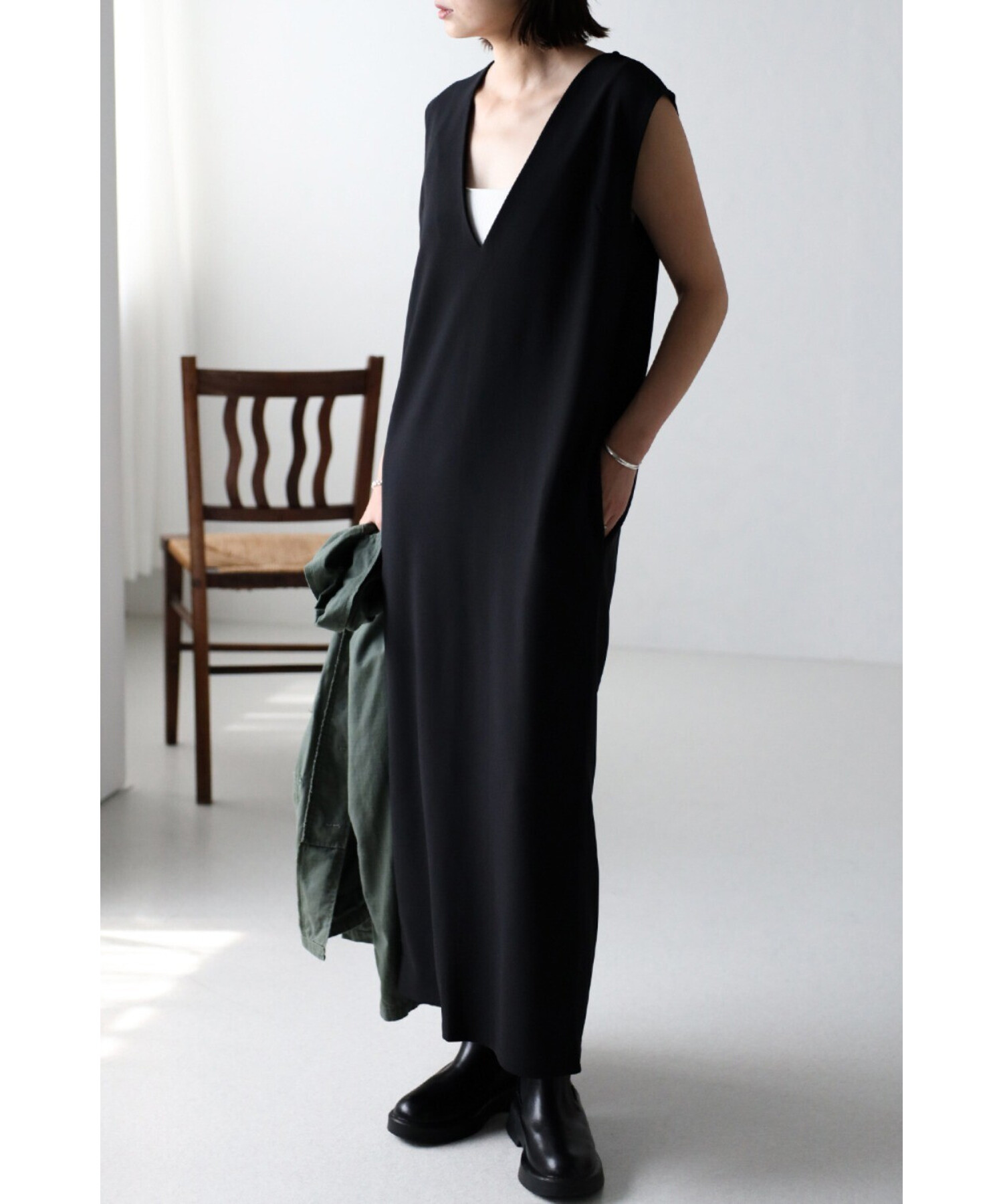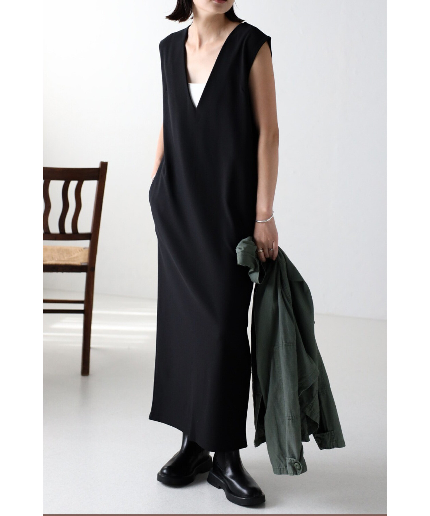 深めのVネックでレイヤードスタイルを楽しめるノースリーブワンピース。