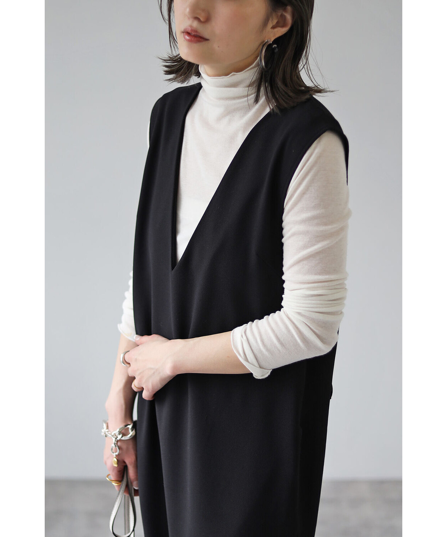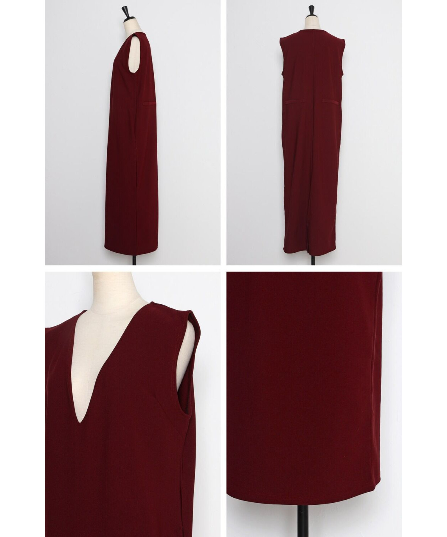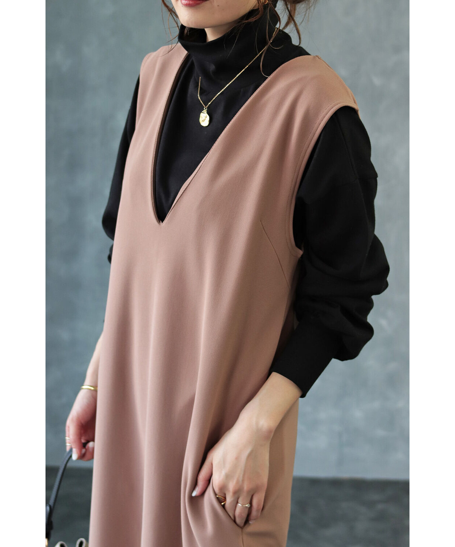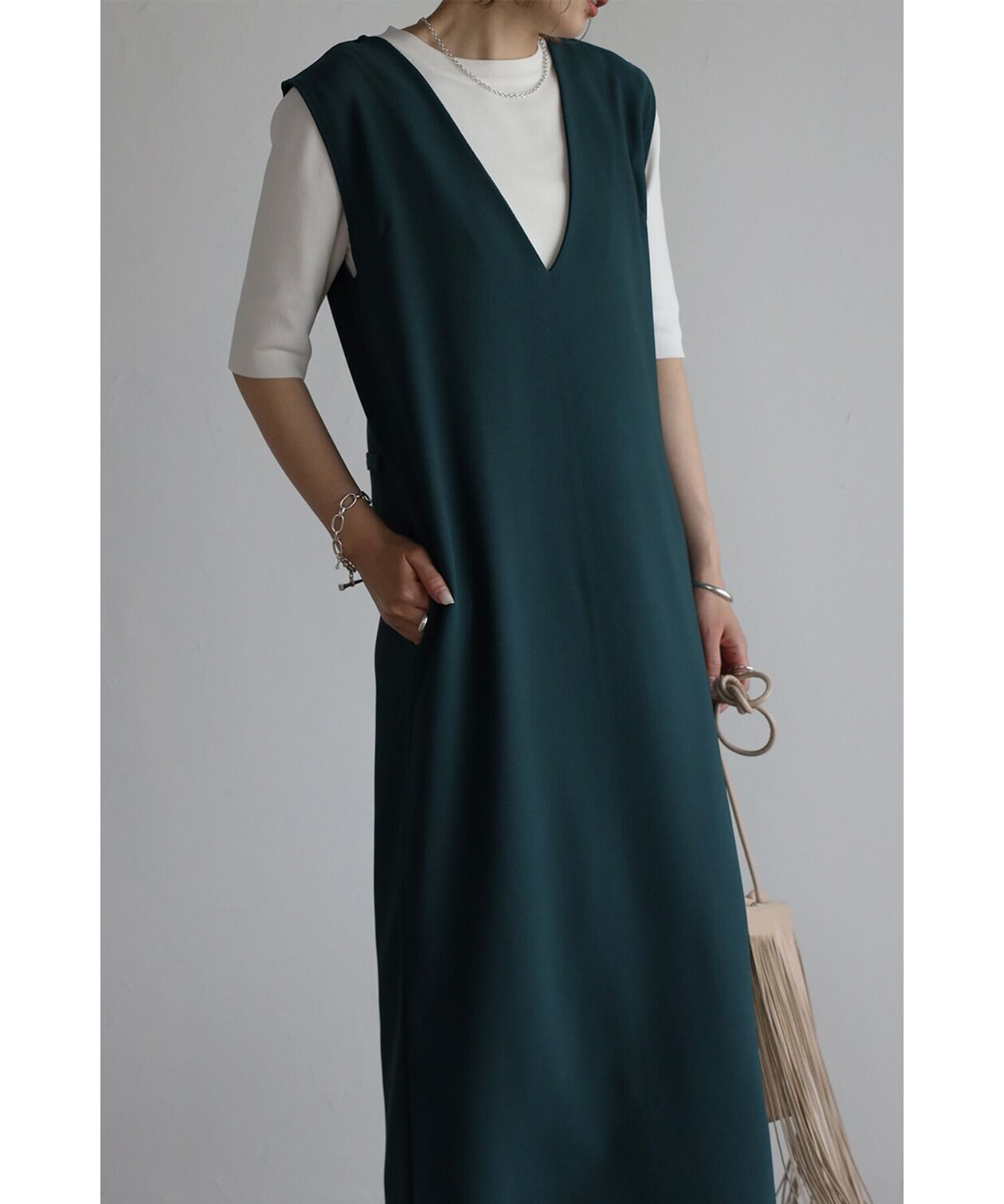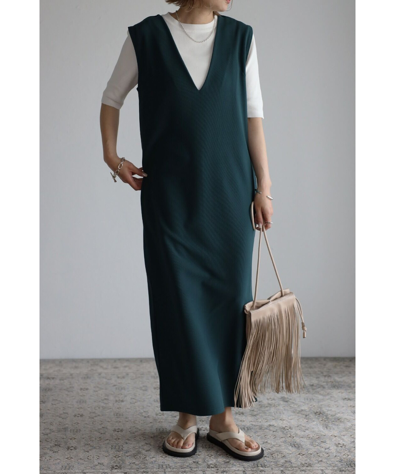 深めのVネックでレイヤードスタイルを楽しめるノースリーブワンピース。