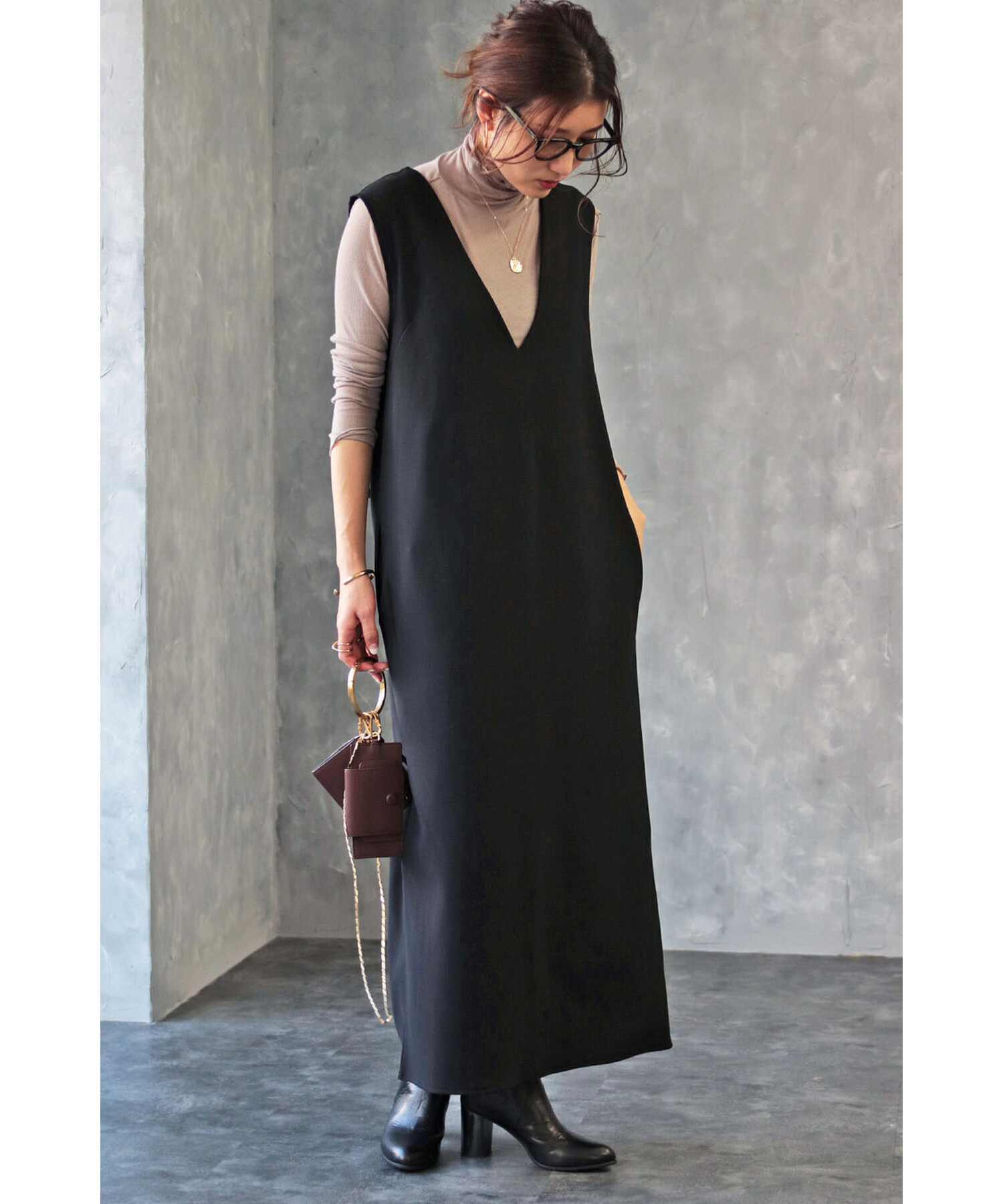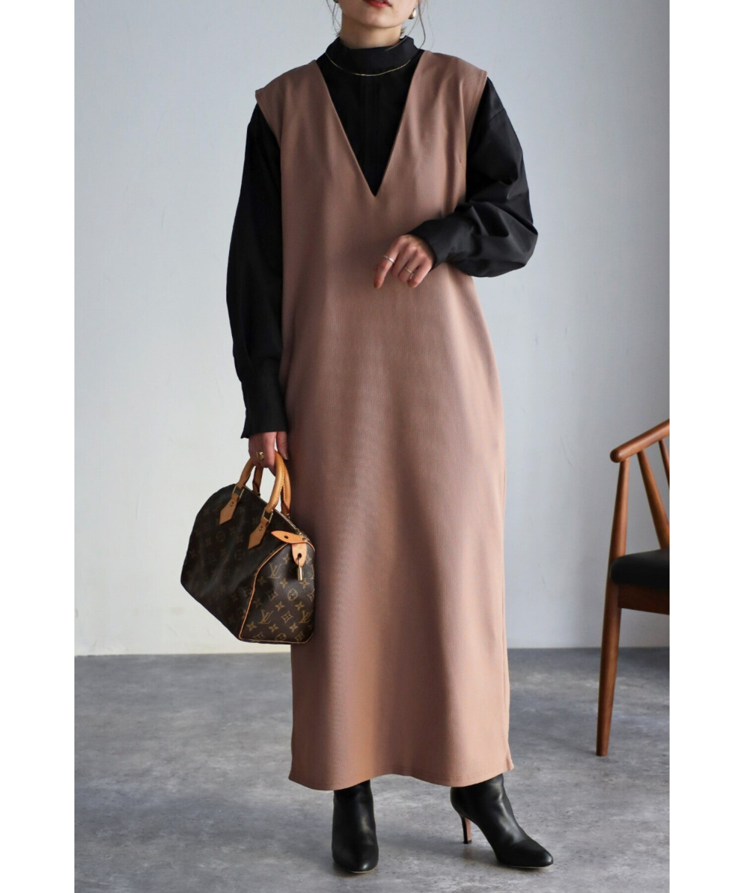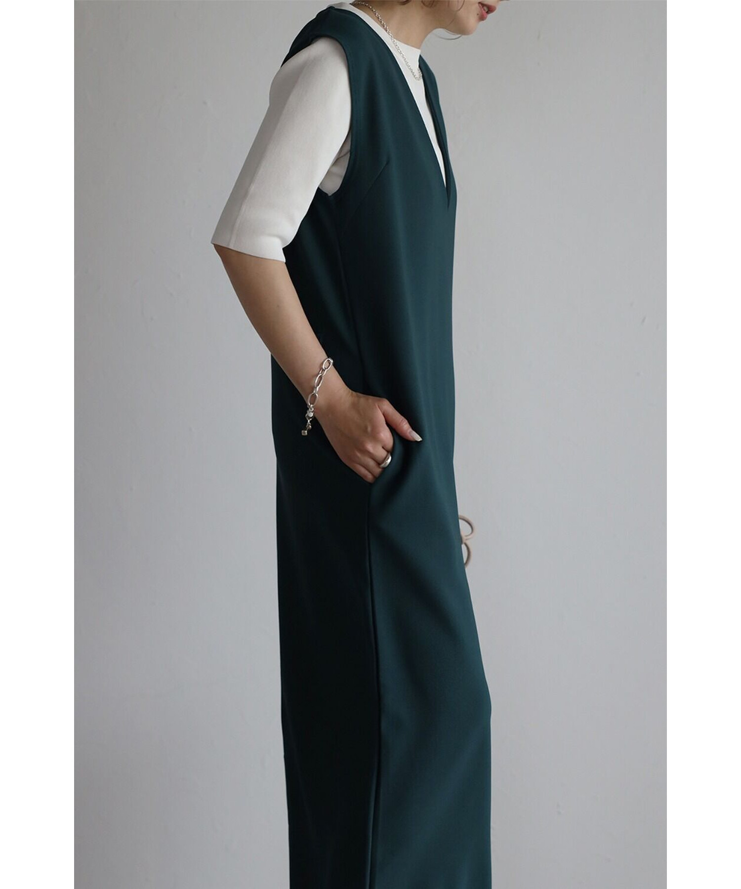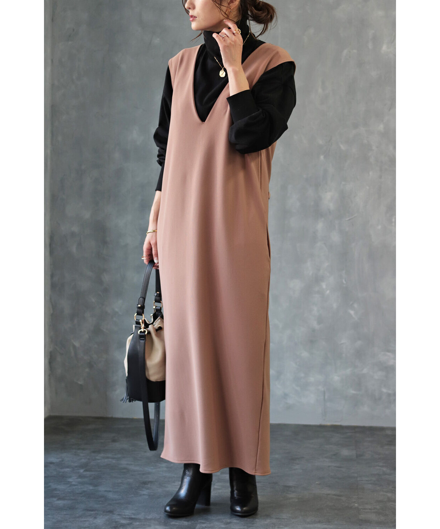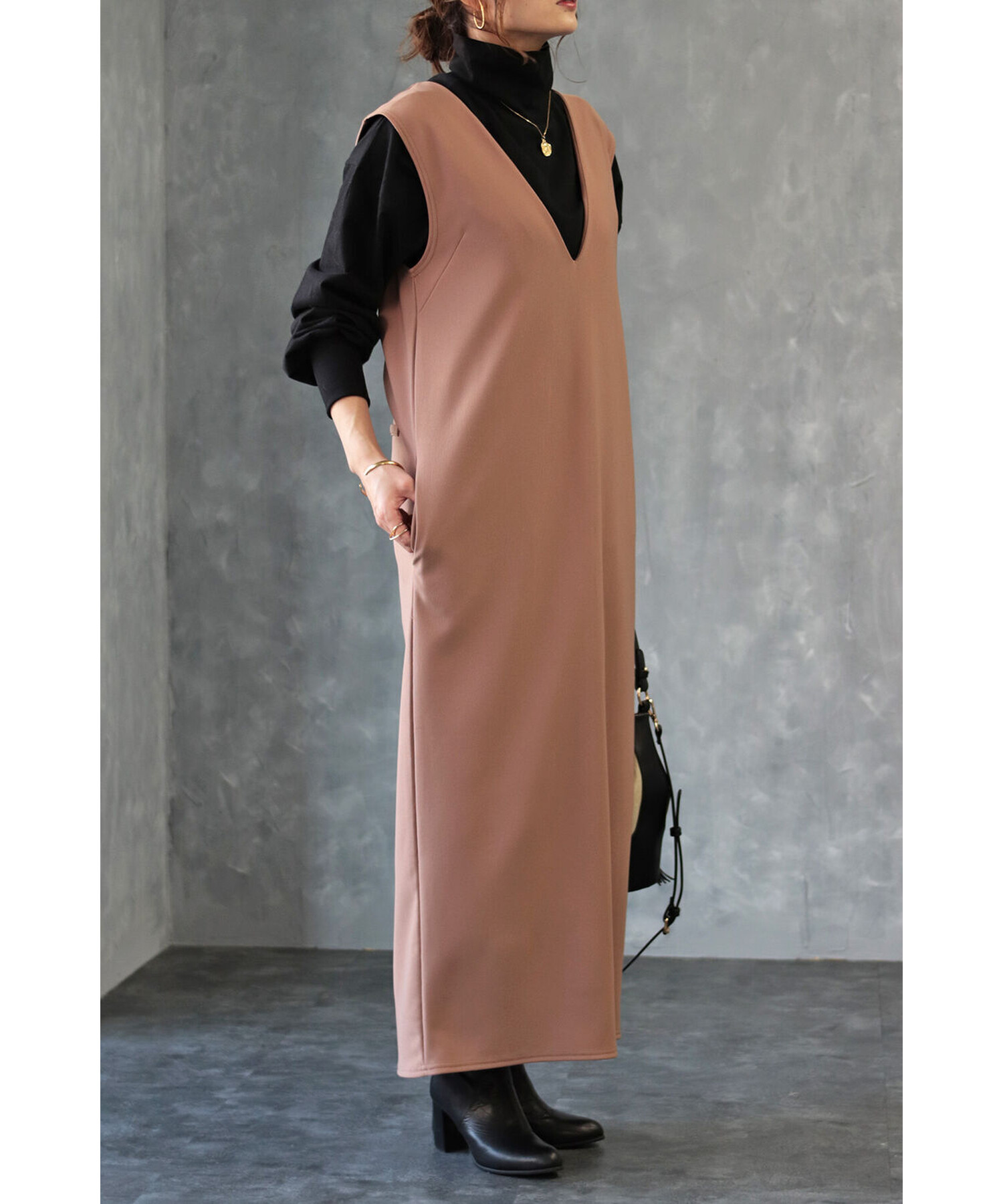 深めのVネックでレイヤードスタイルを楽しめるノースリーブワンピース。
