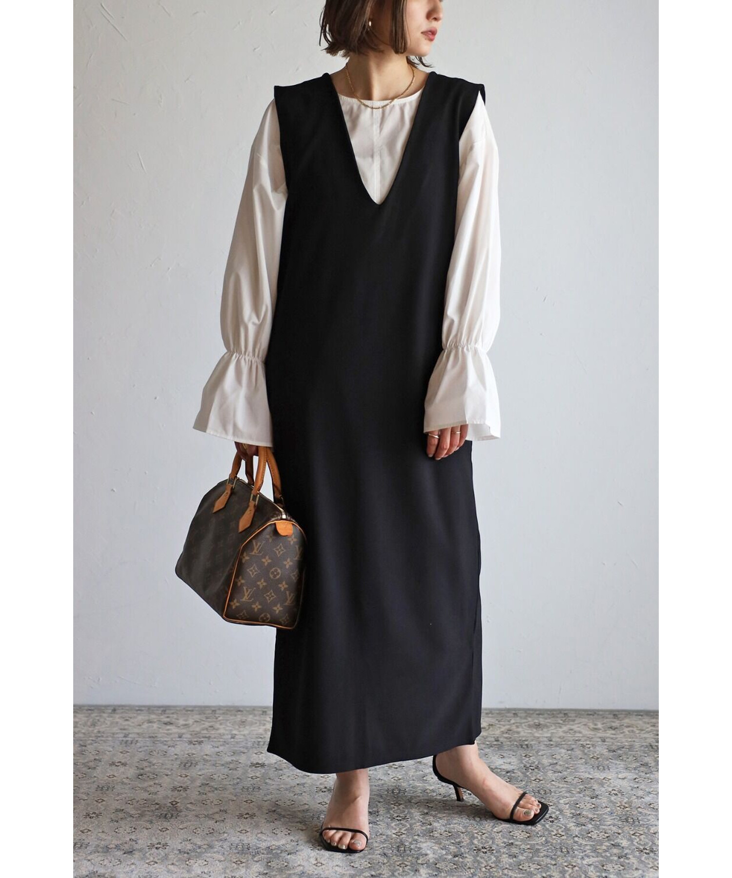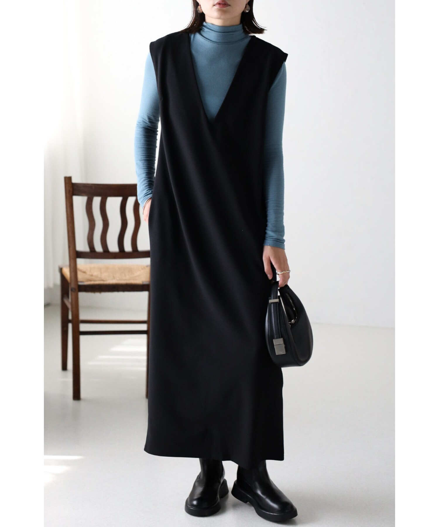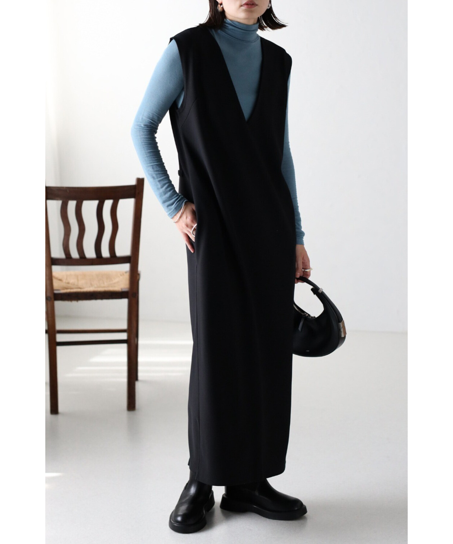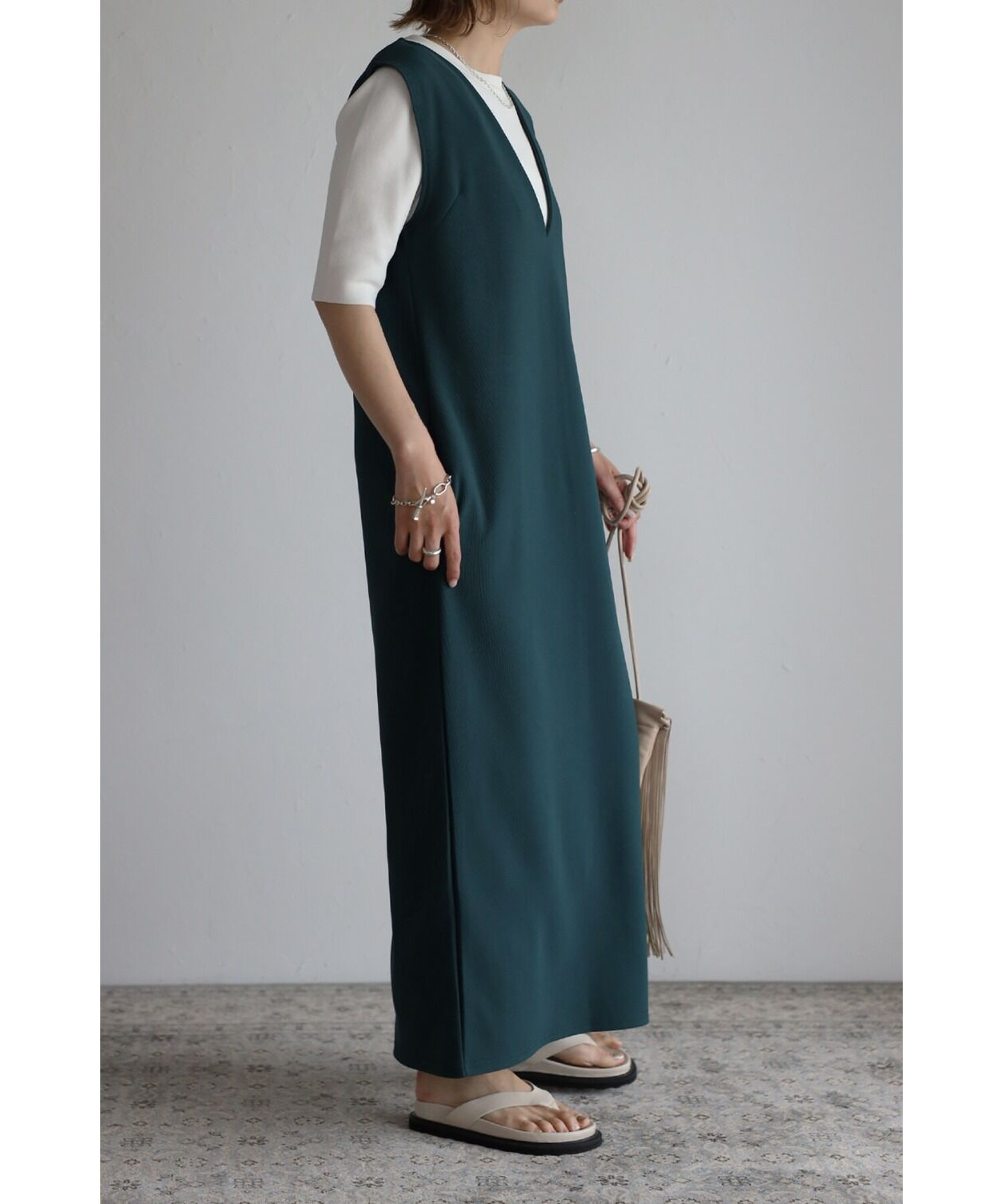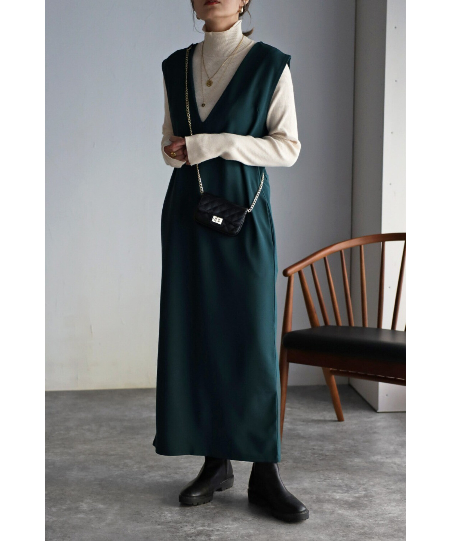 深めのVネックでレイヤードスタイルを楽しめるノースリーブワンピース。