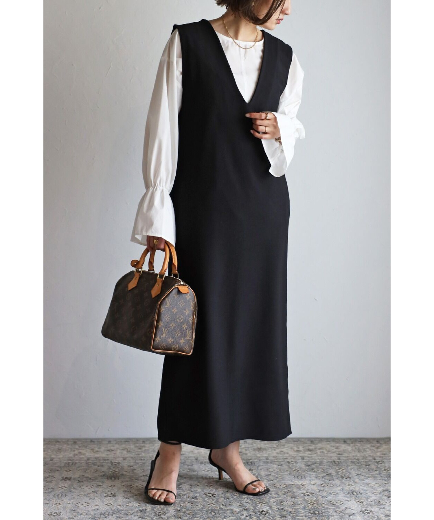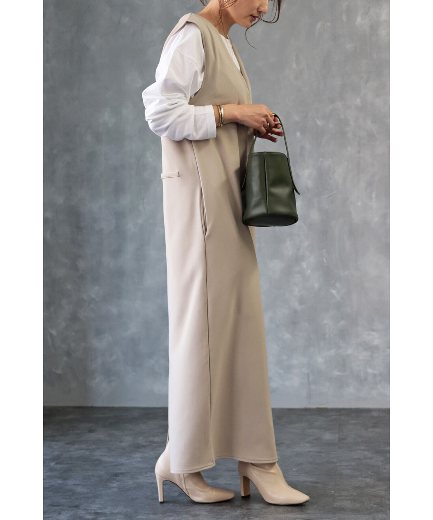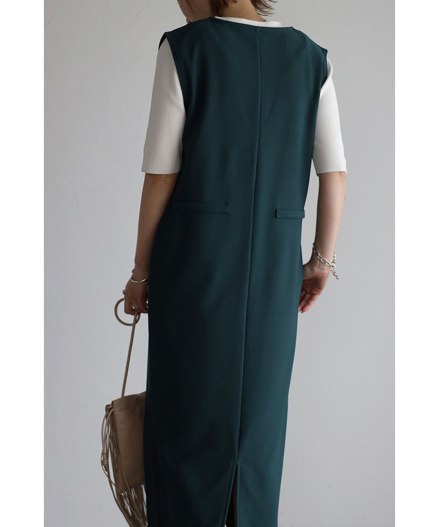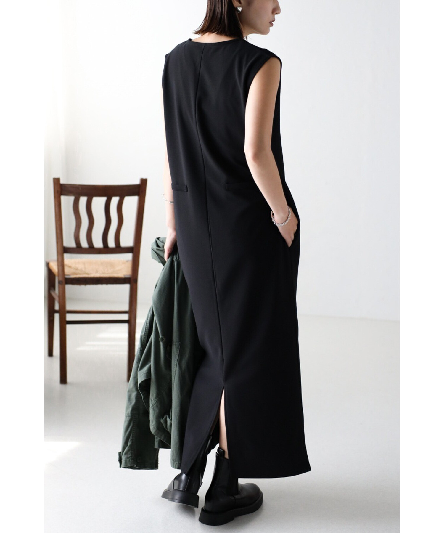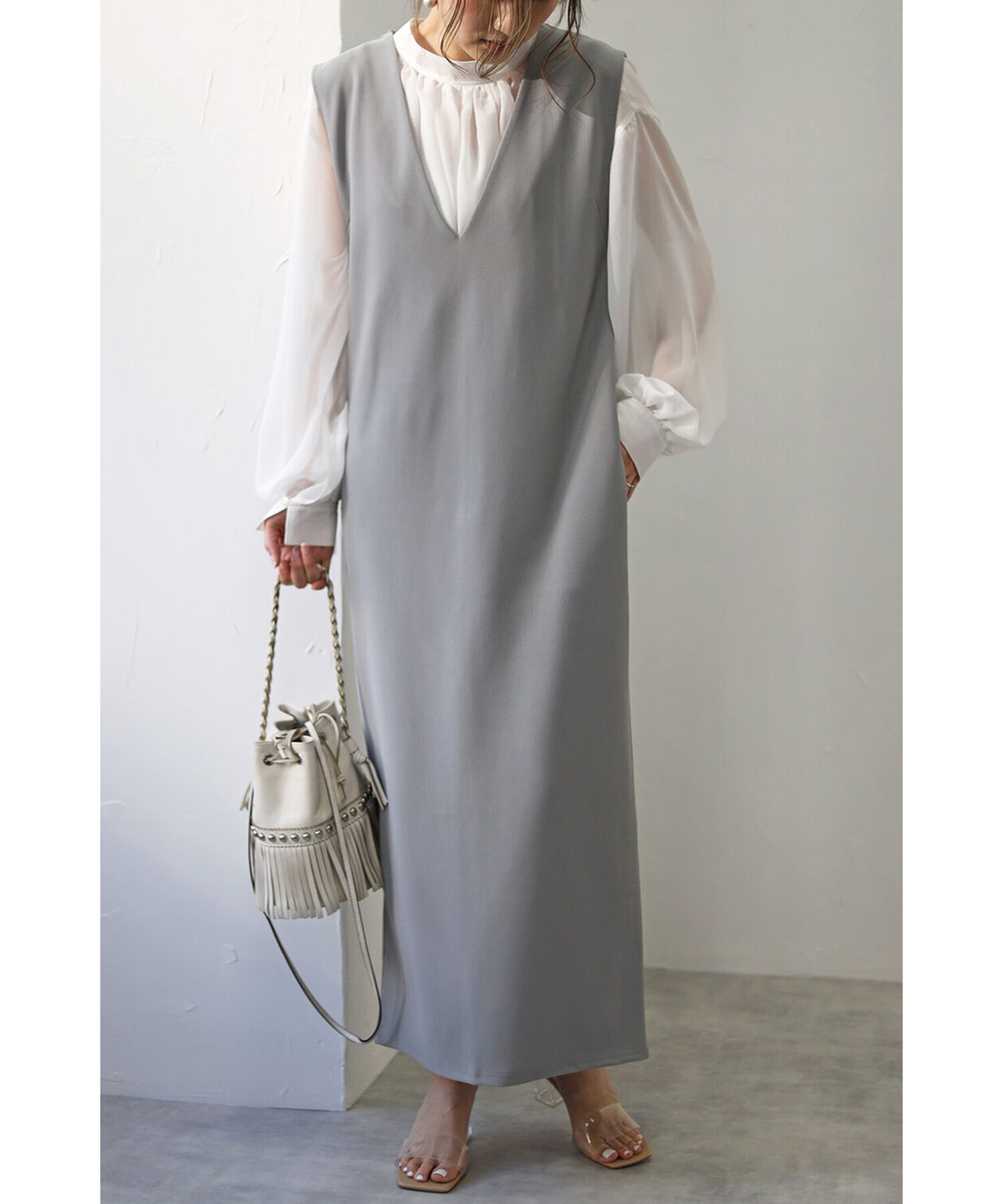 深めのVネックでレイヤードスタイルを楽しめるノースリーブワンピース。