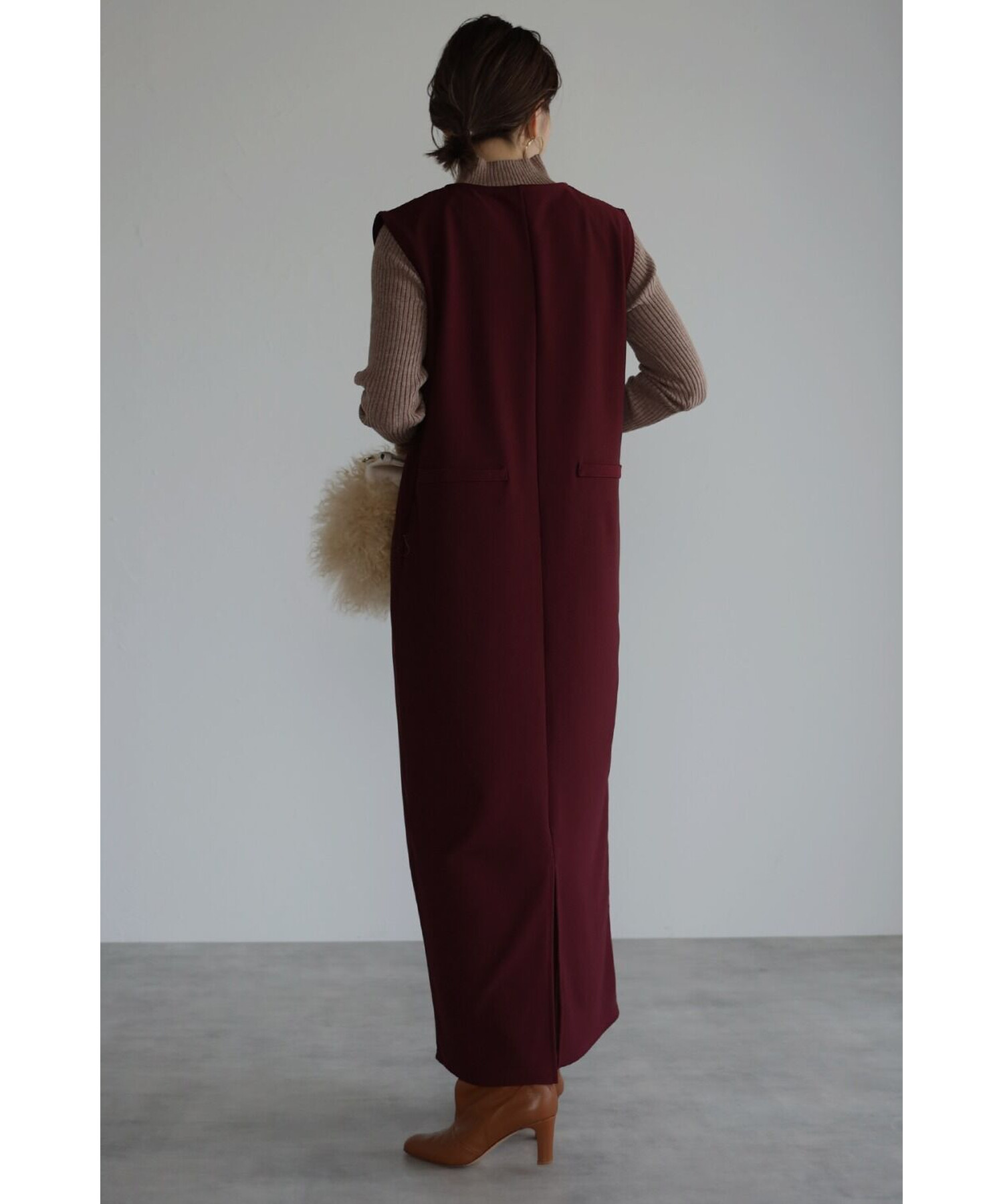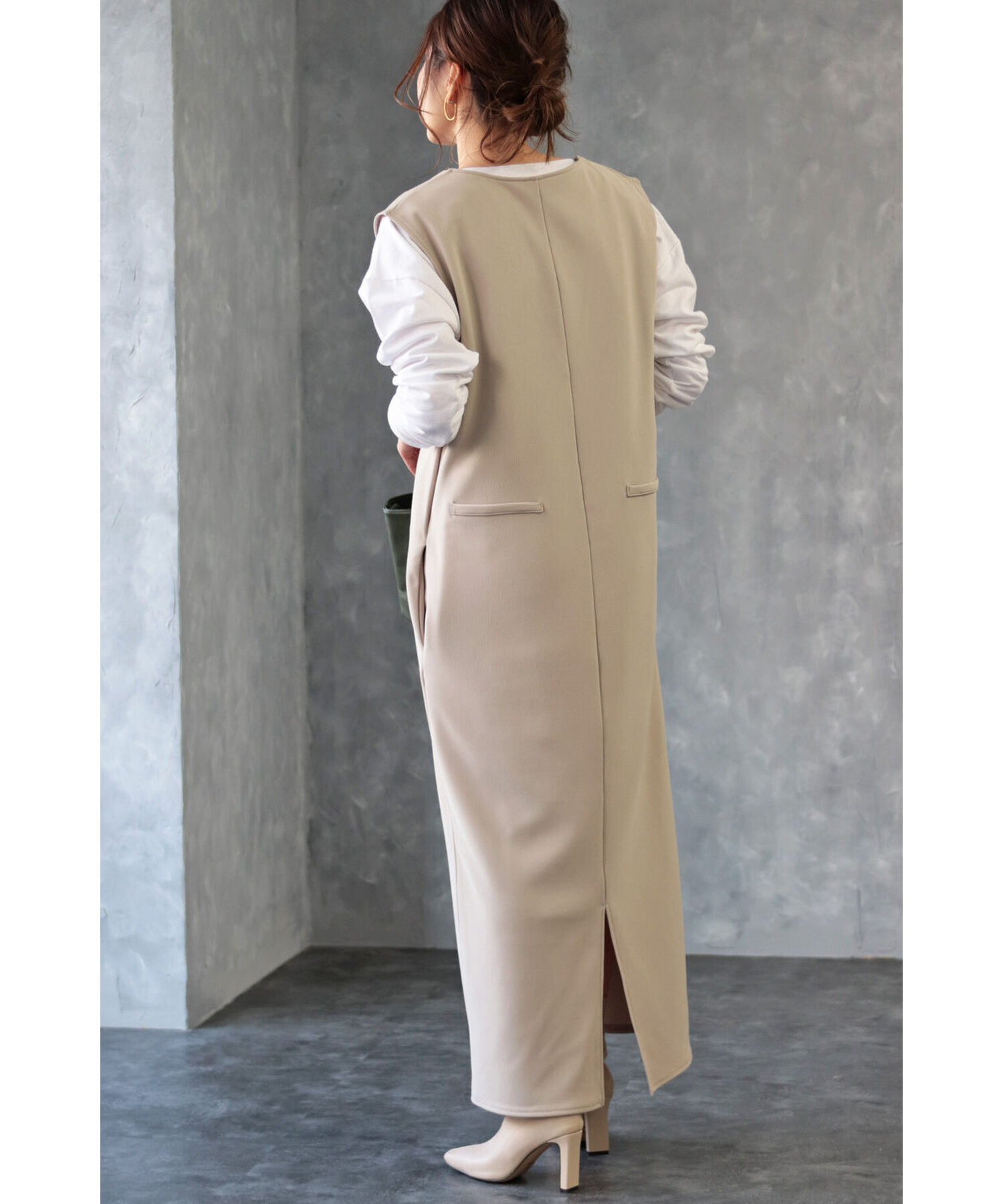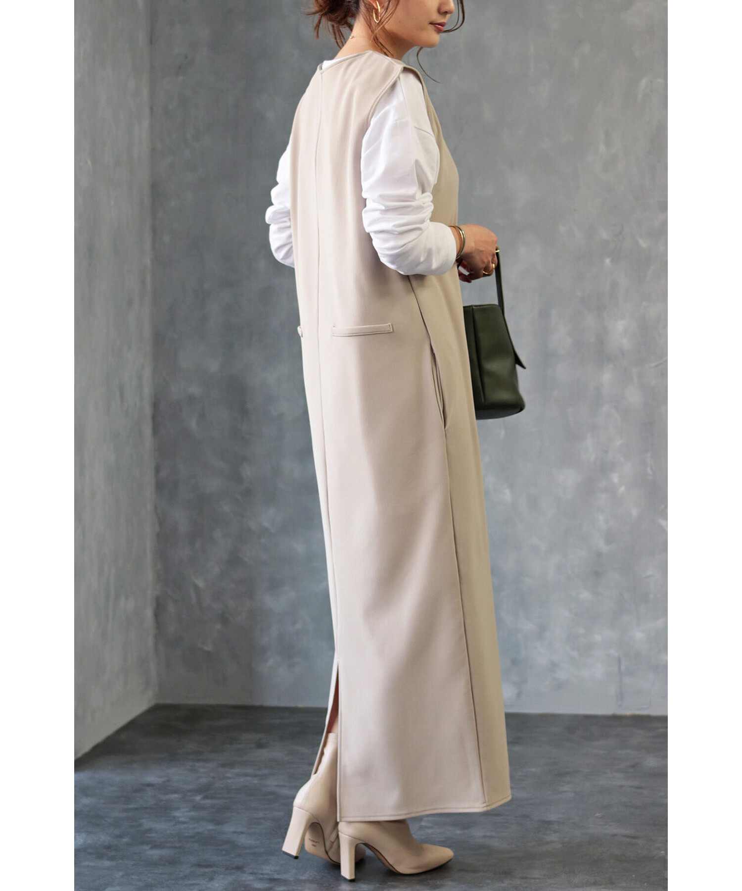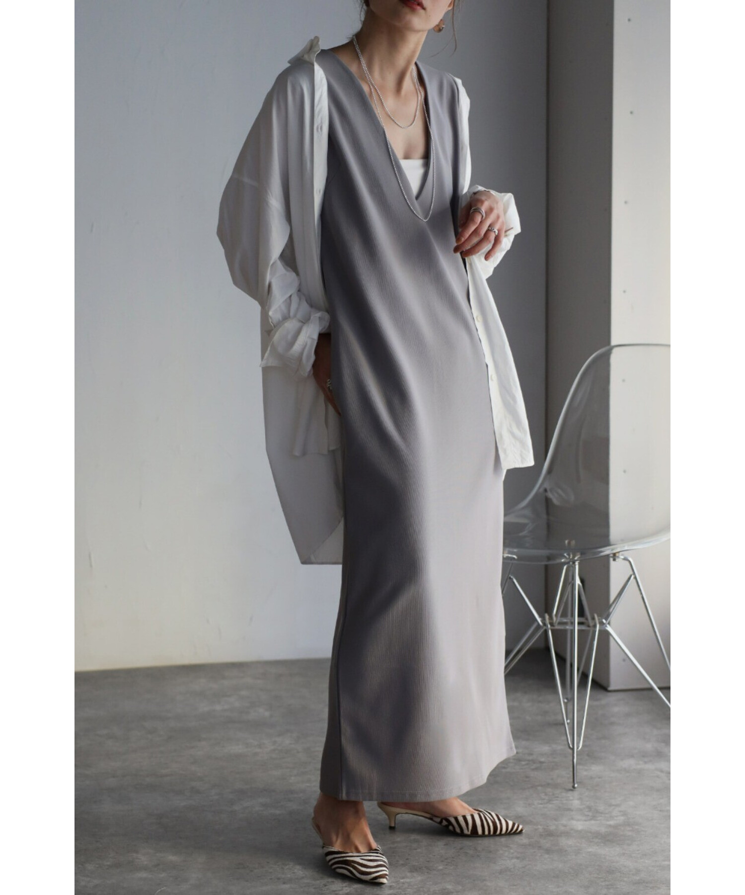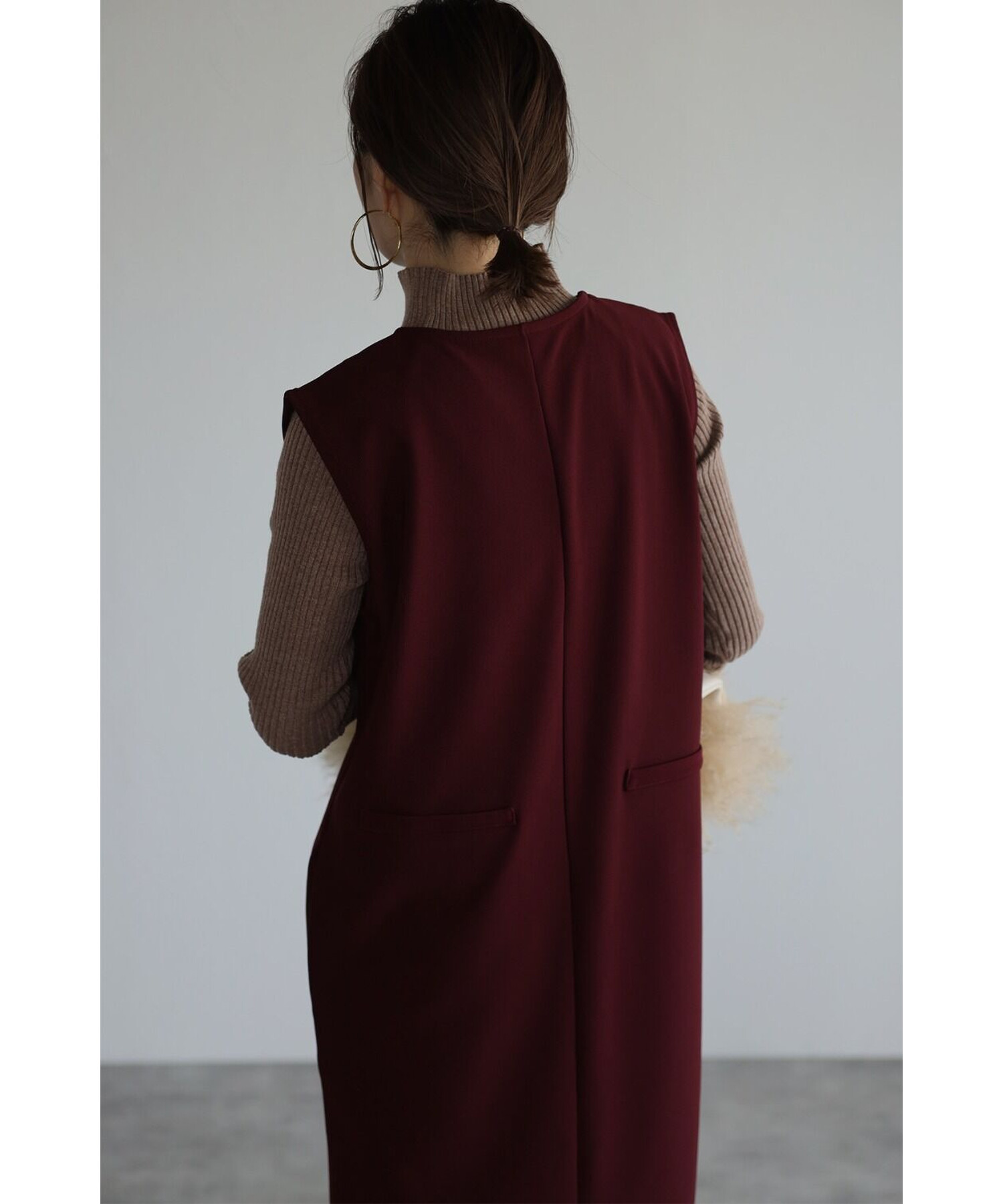 深めのVネックでレイヤードスタイルを楽しめるノースリーブワンピース。