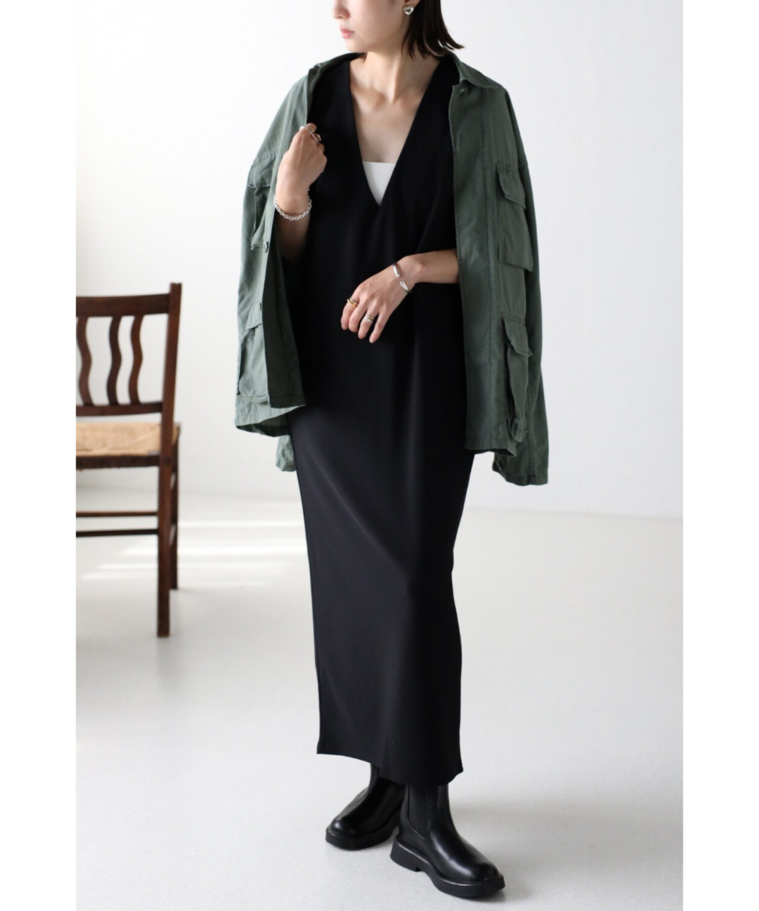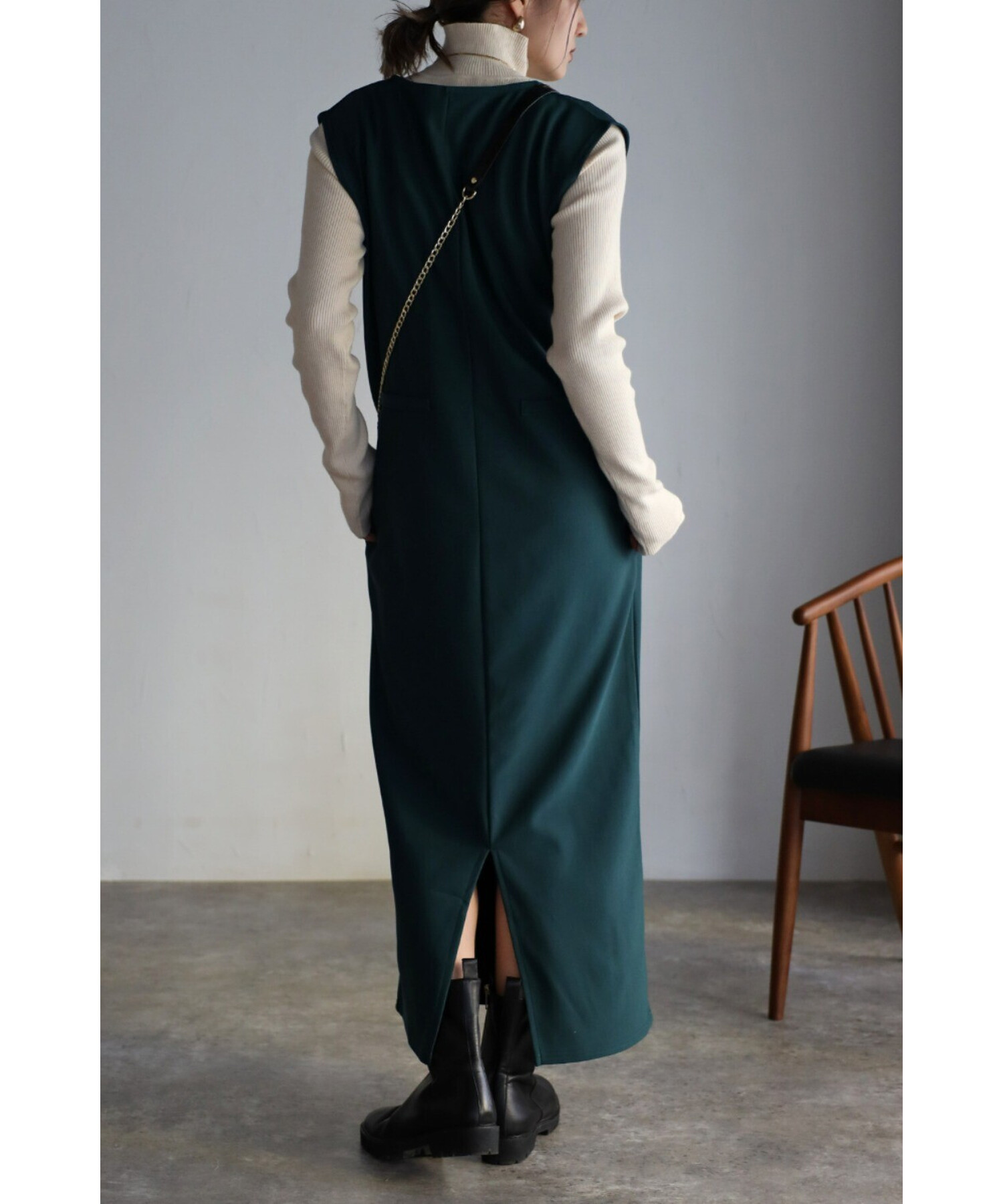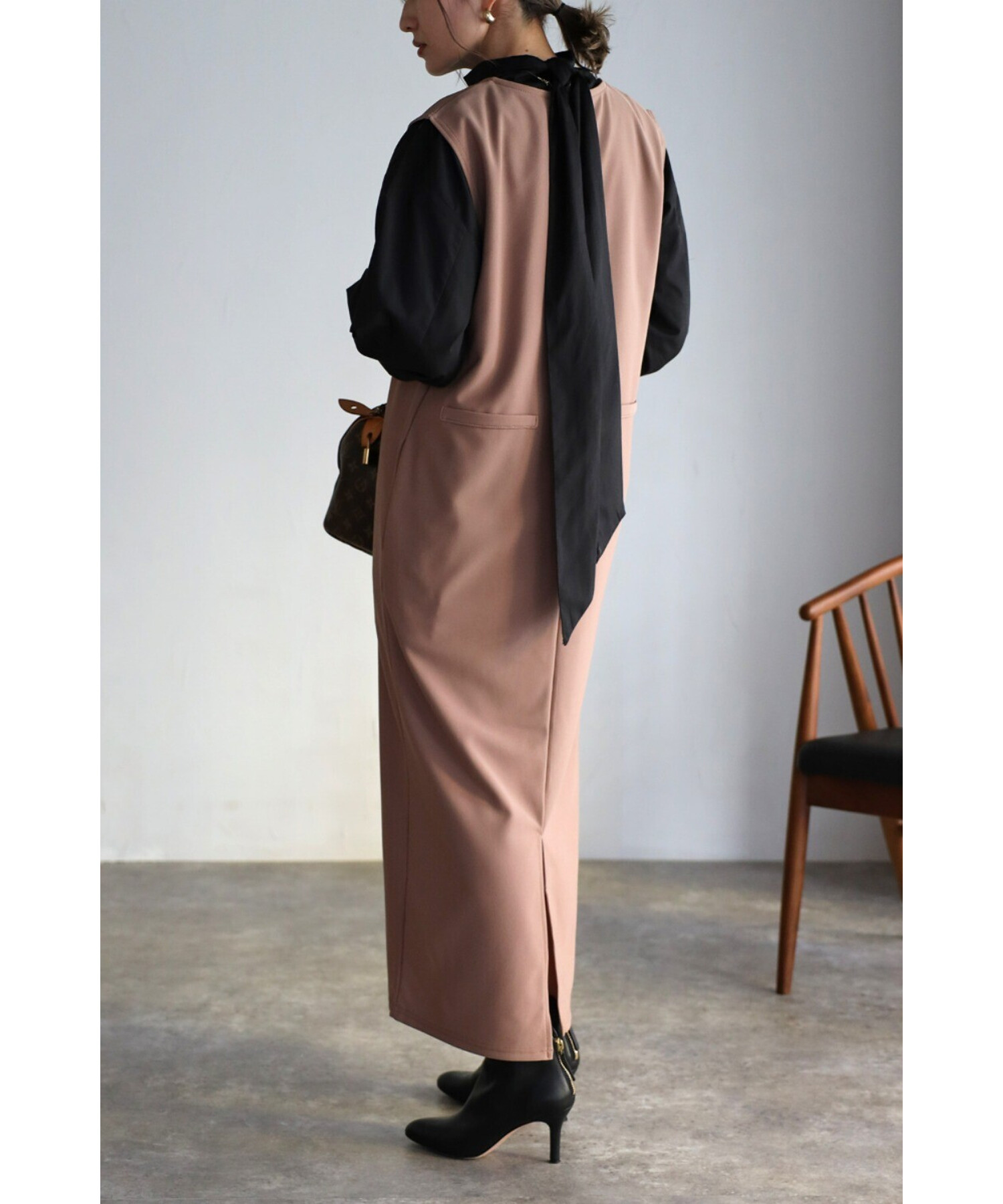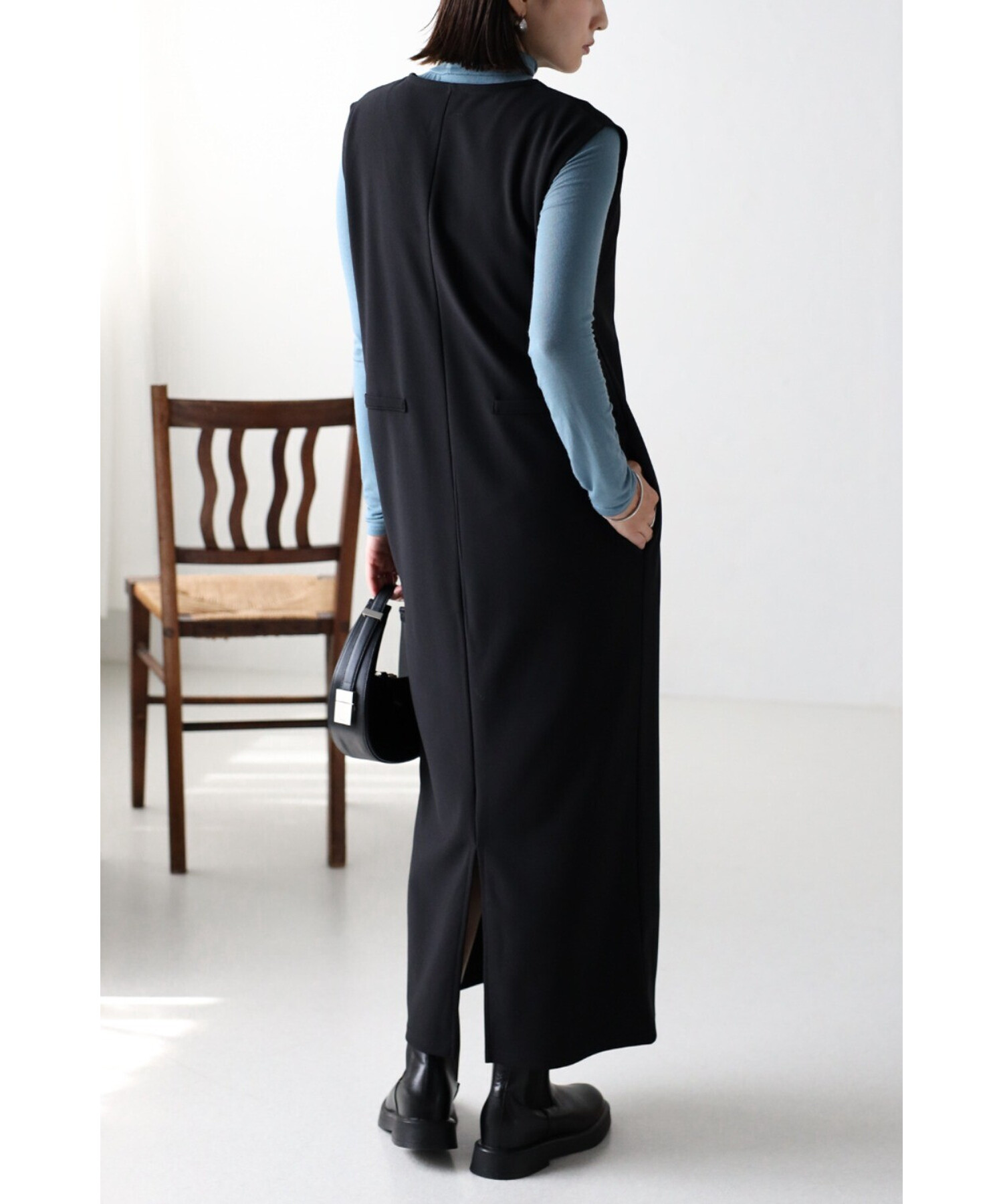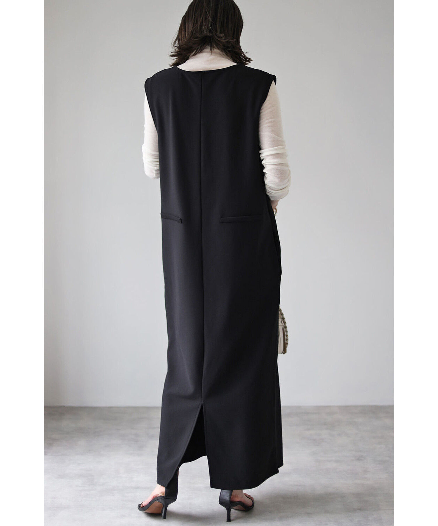 深めのVネックでレイヤードスタイルを楽しめるノースリーブワンピース。