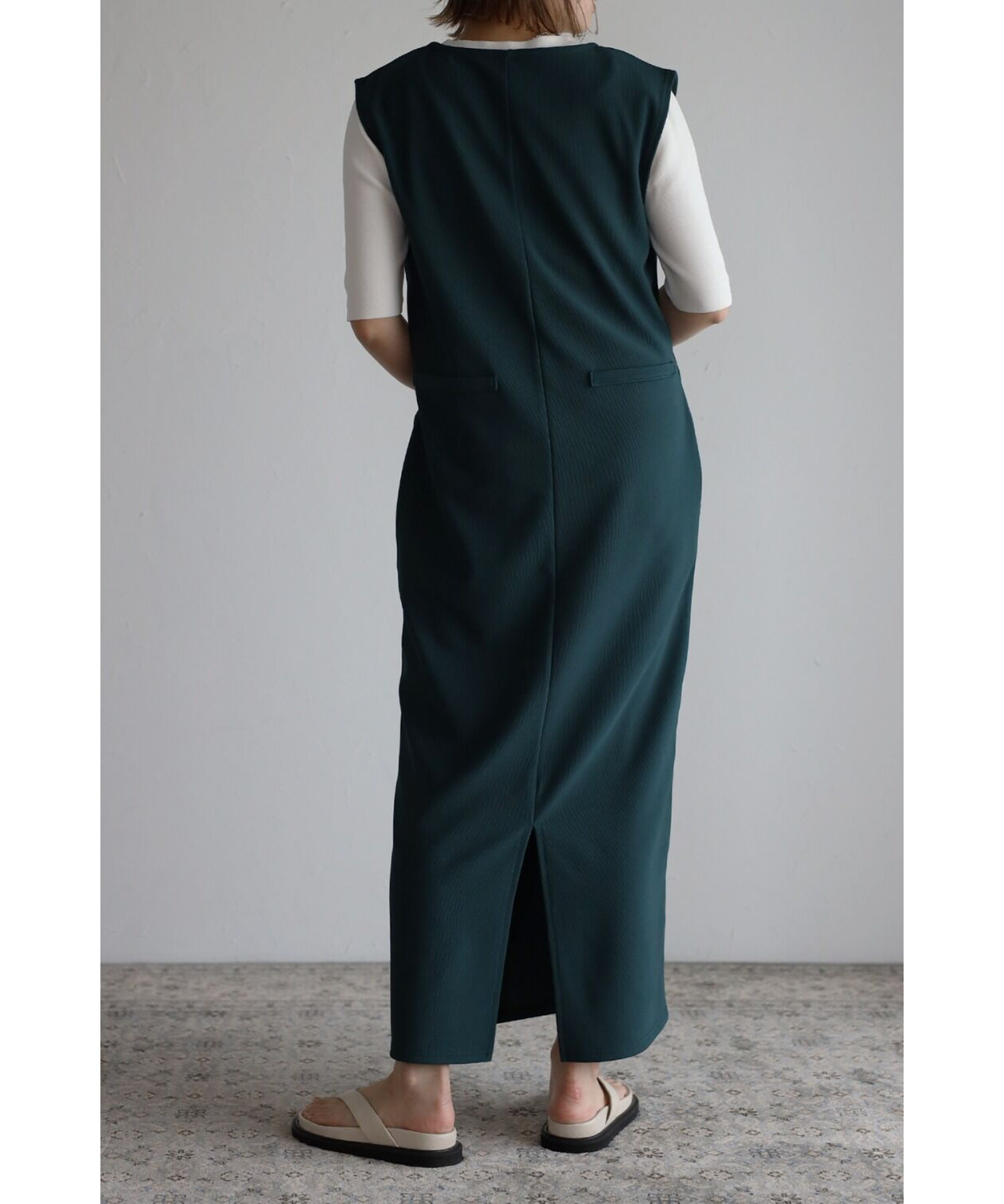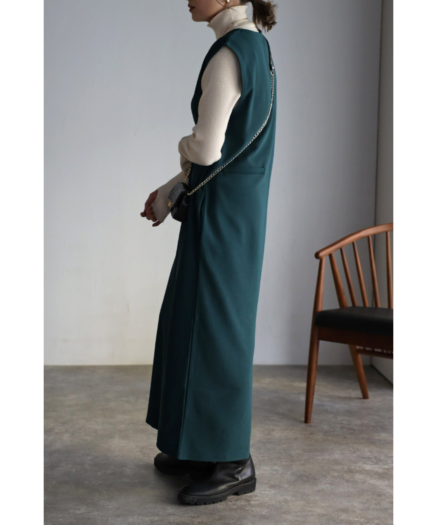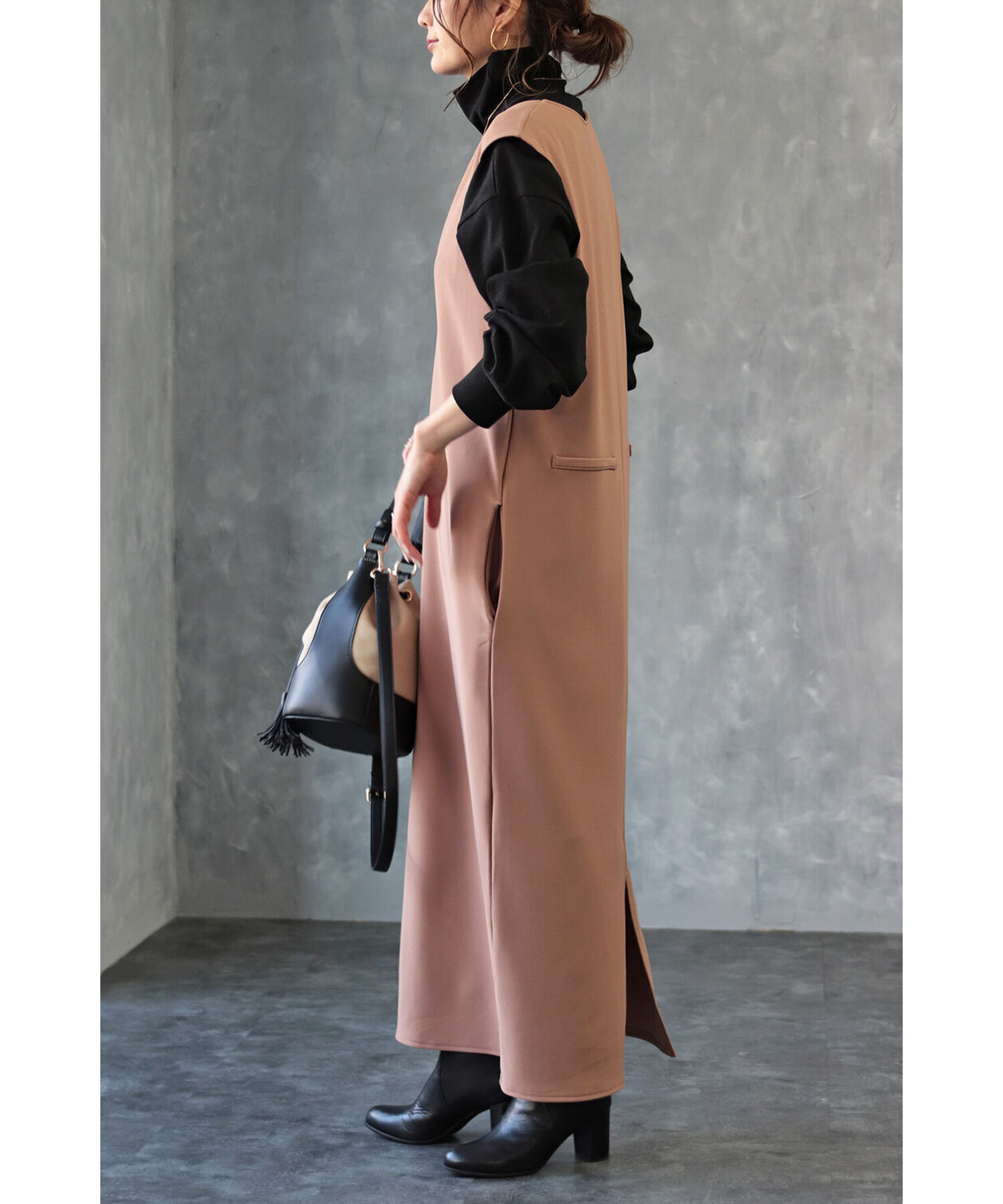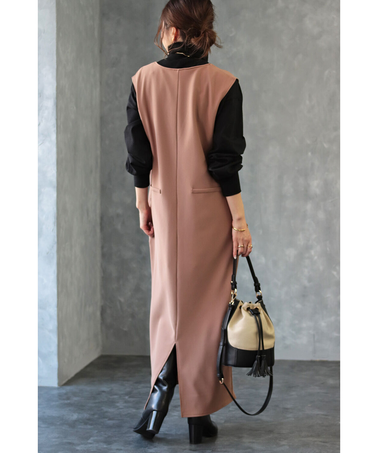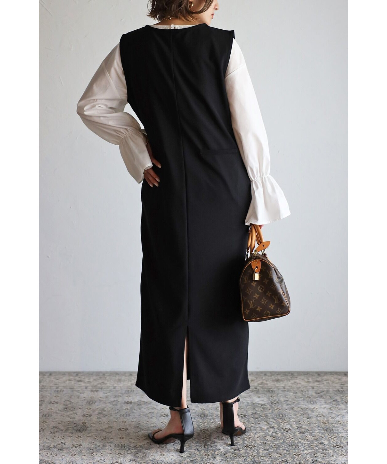 深めのVネックでレイヤードスタイルを楽しめるノースリーブワンピース。