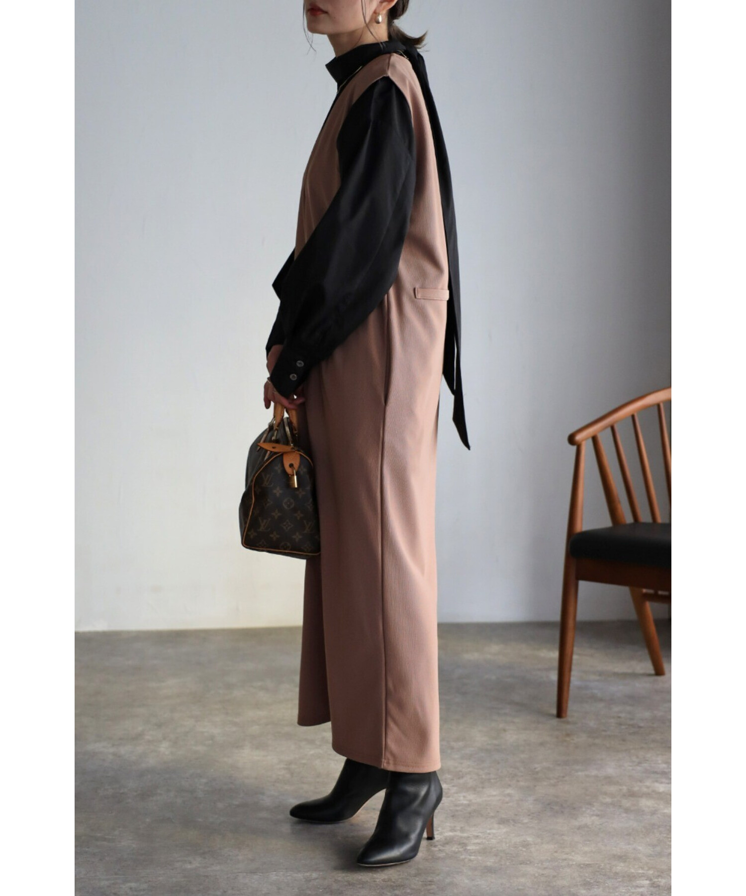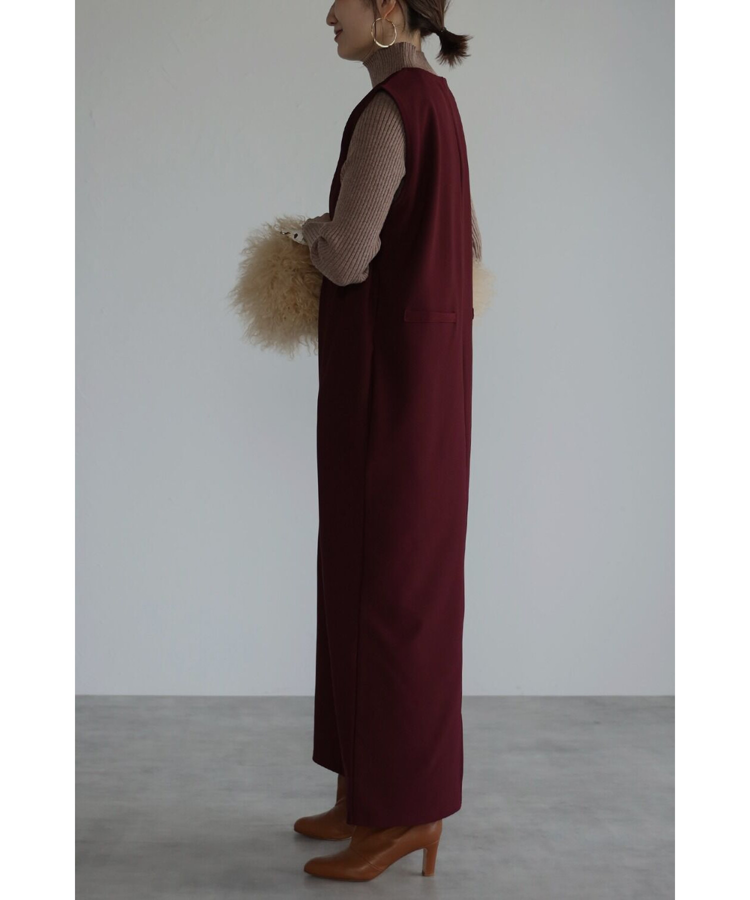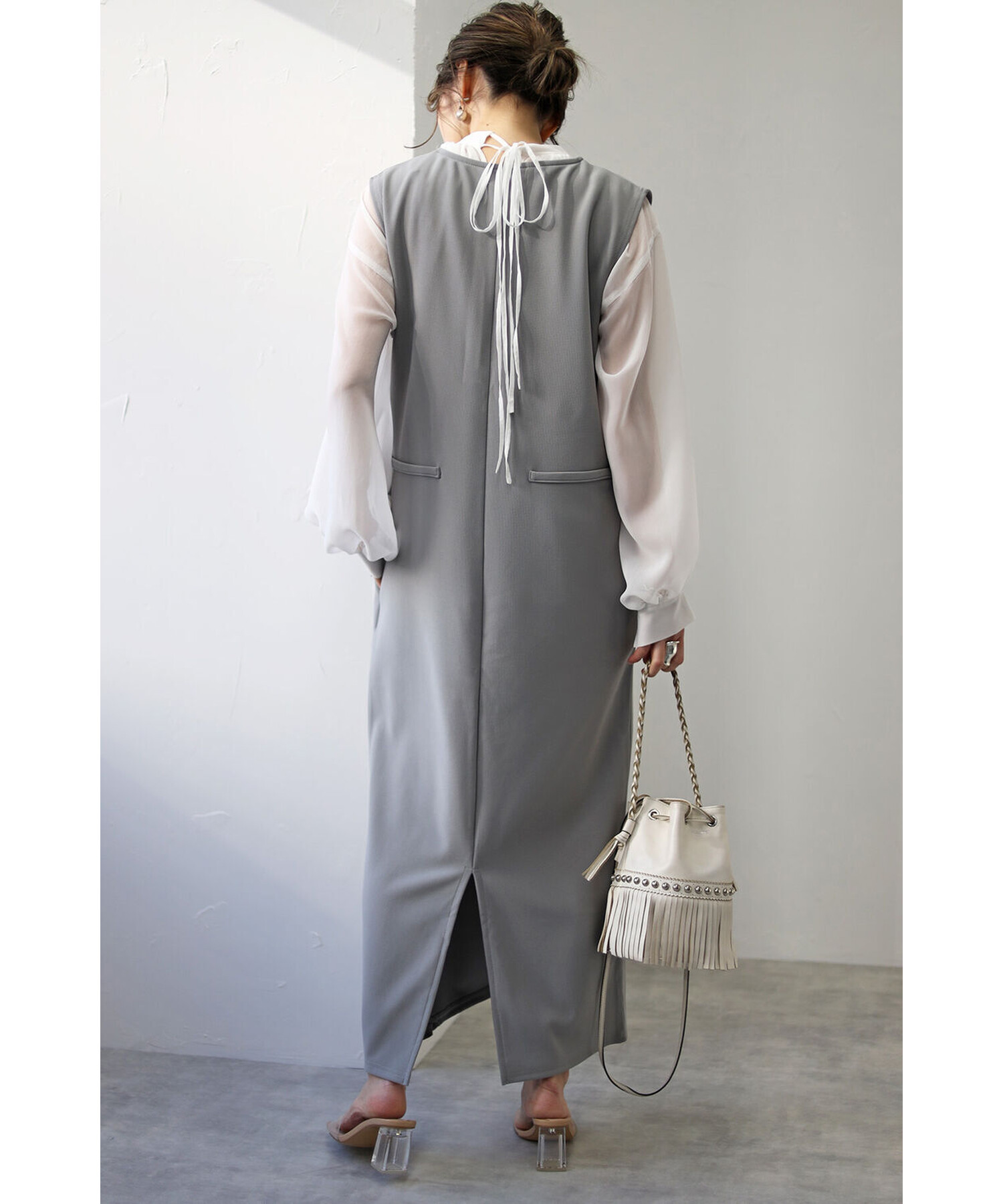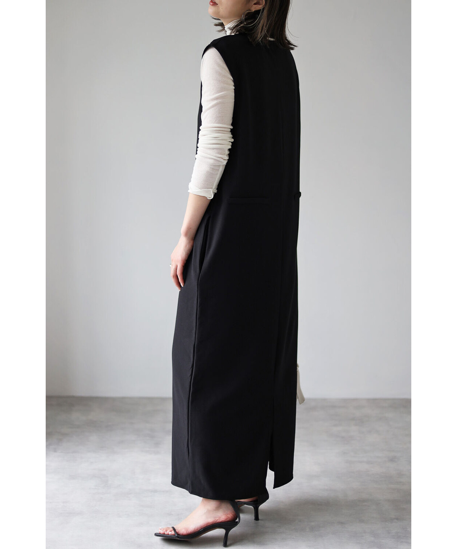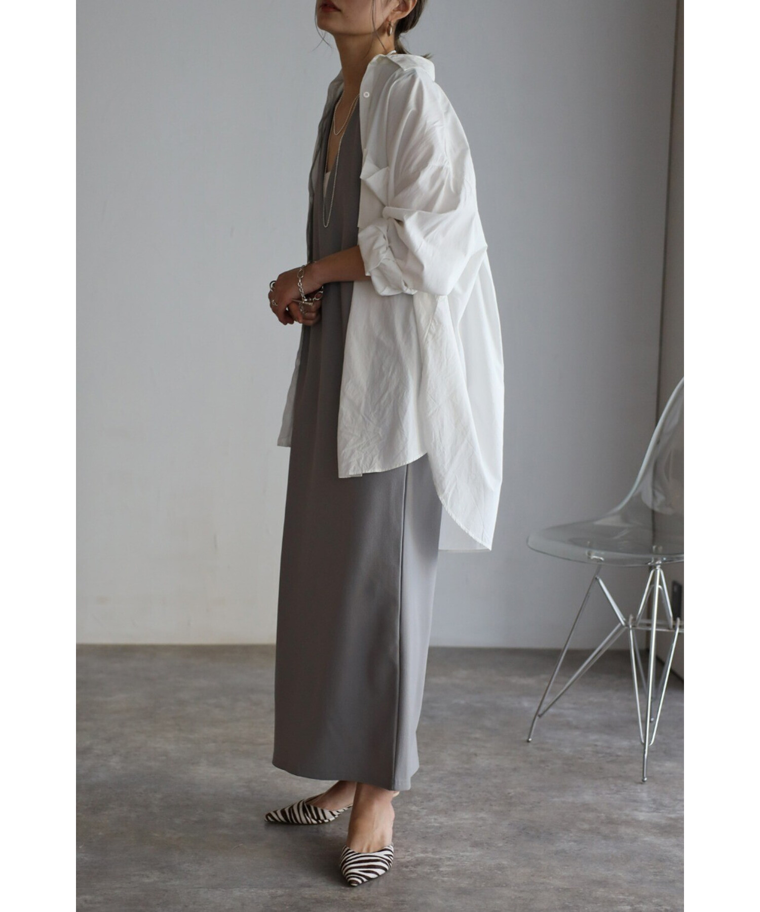 深めのVネックでレイヤードスタイルを楽しめるノースリーブワンピース。