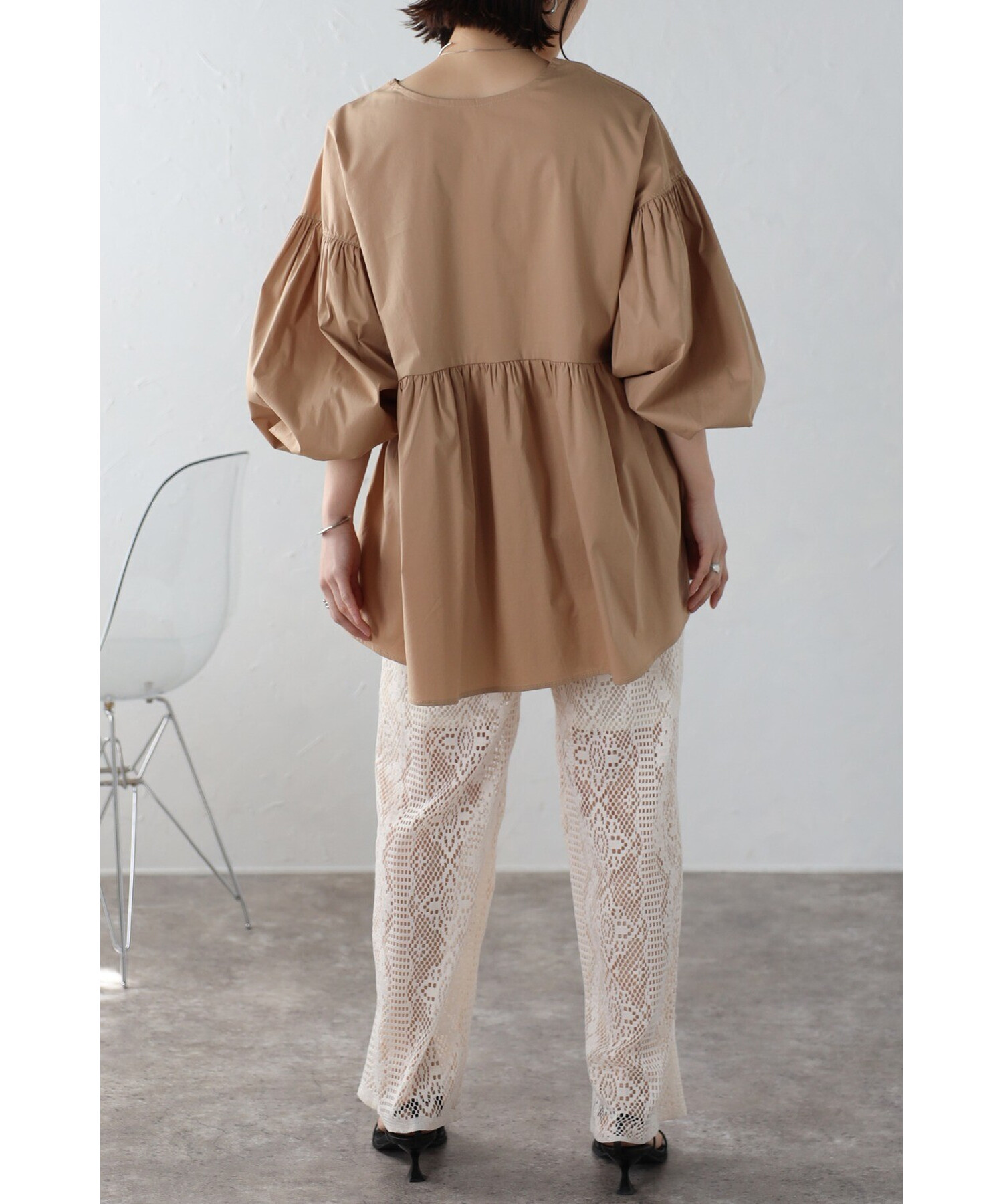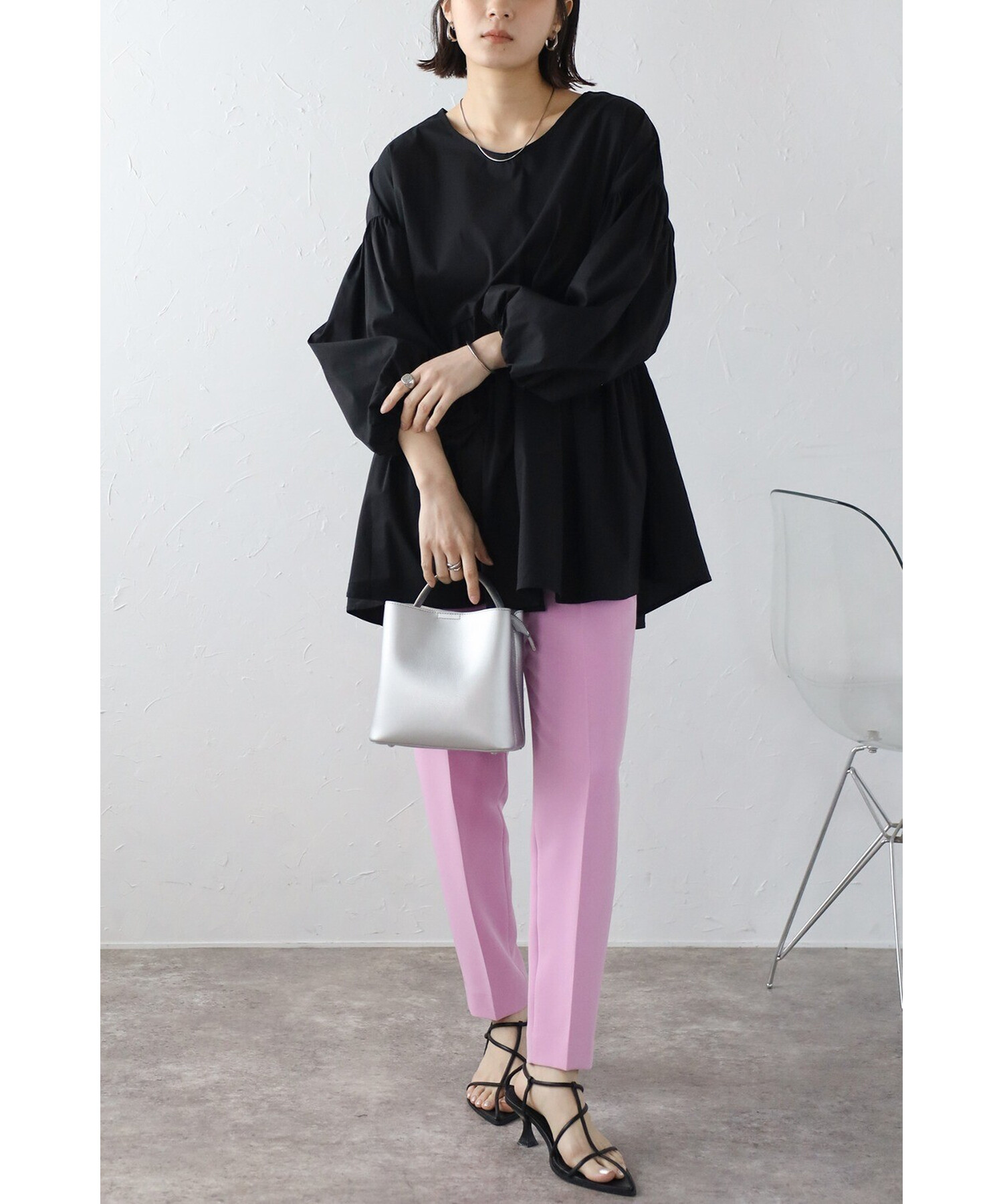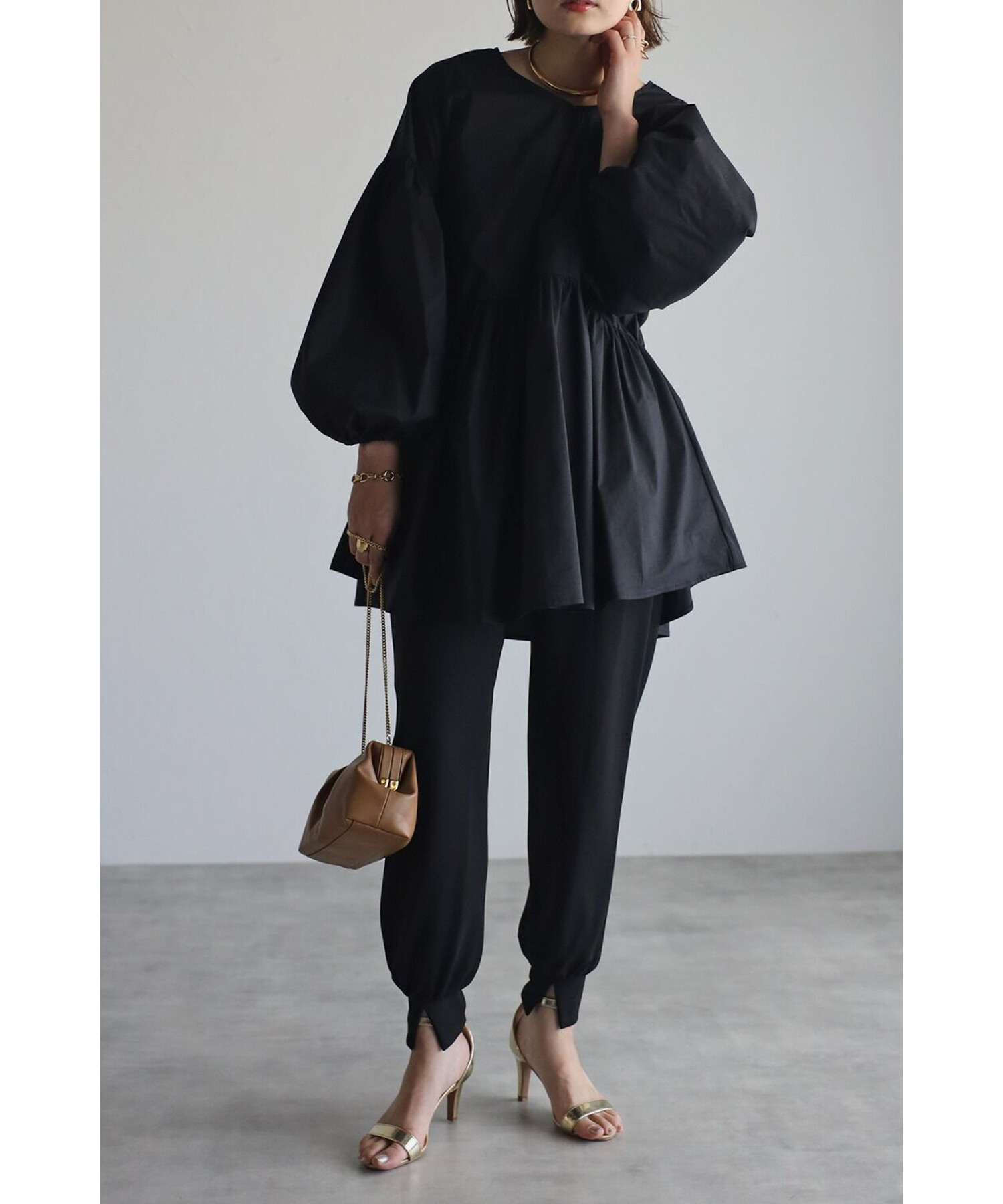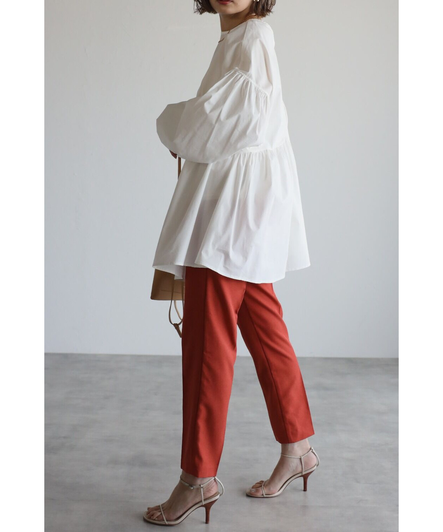 ボリューム感が可愛いブラウスはリブレギンスやテーパードパンツなどと相性抜群。