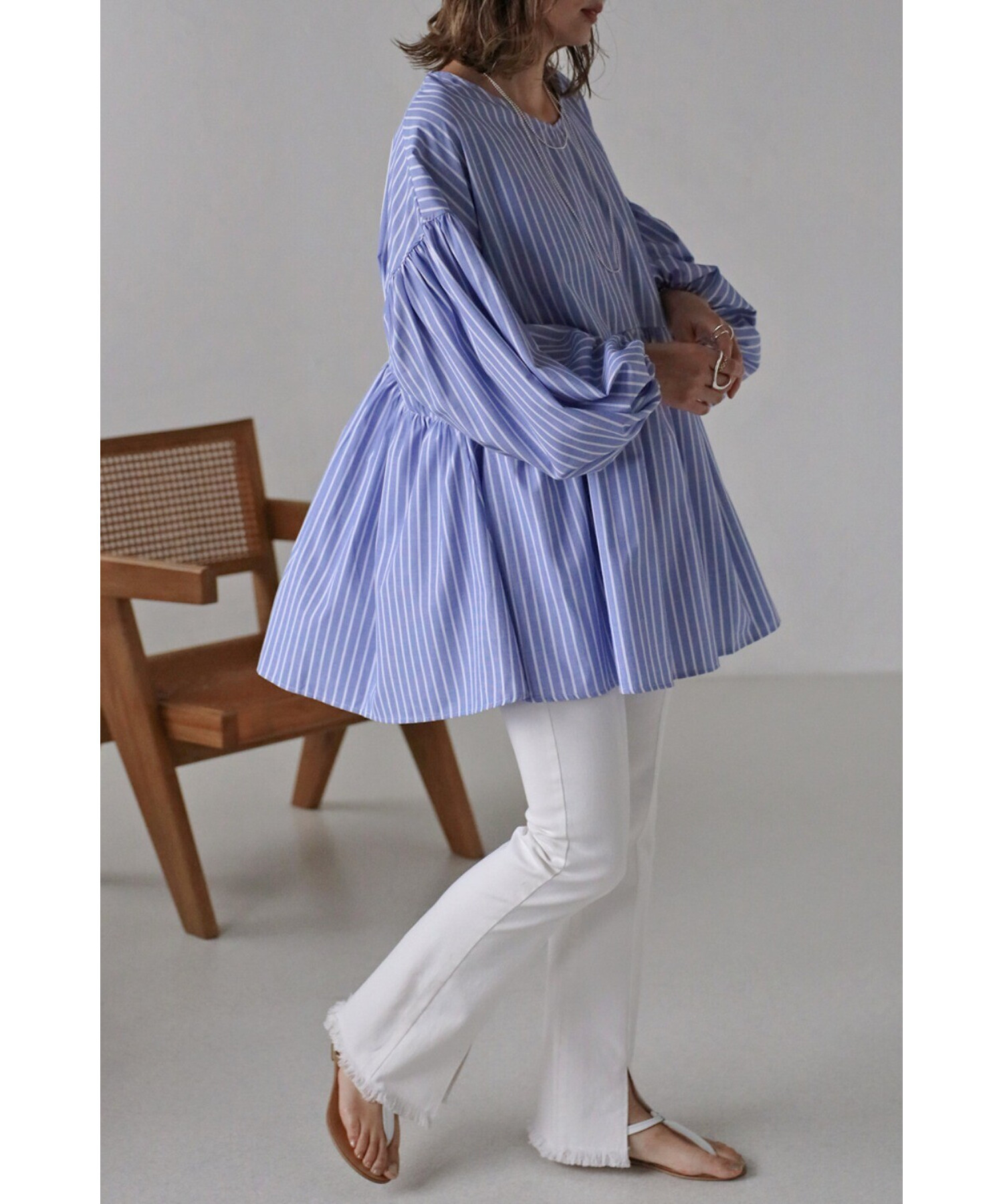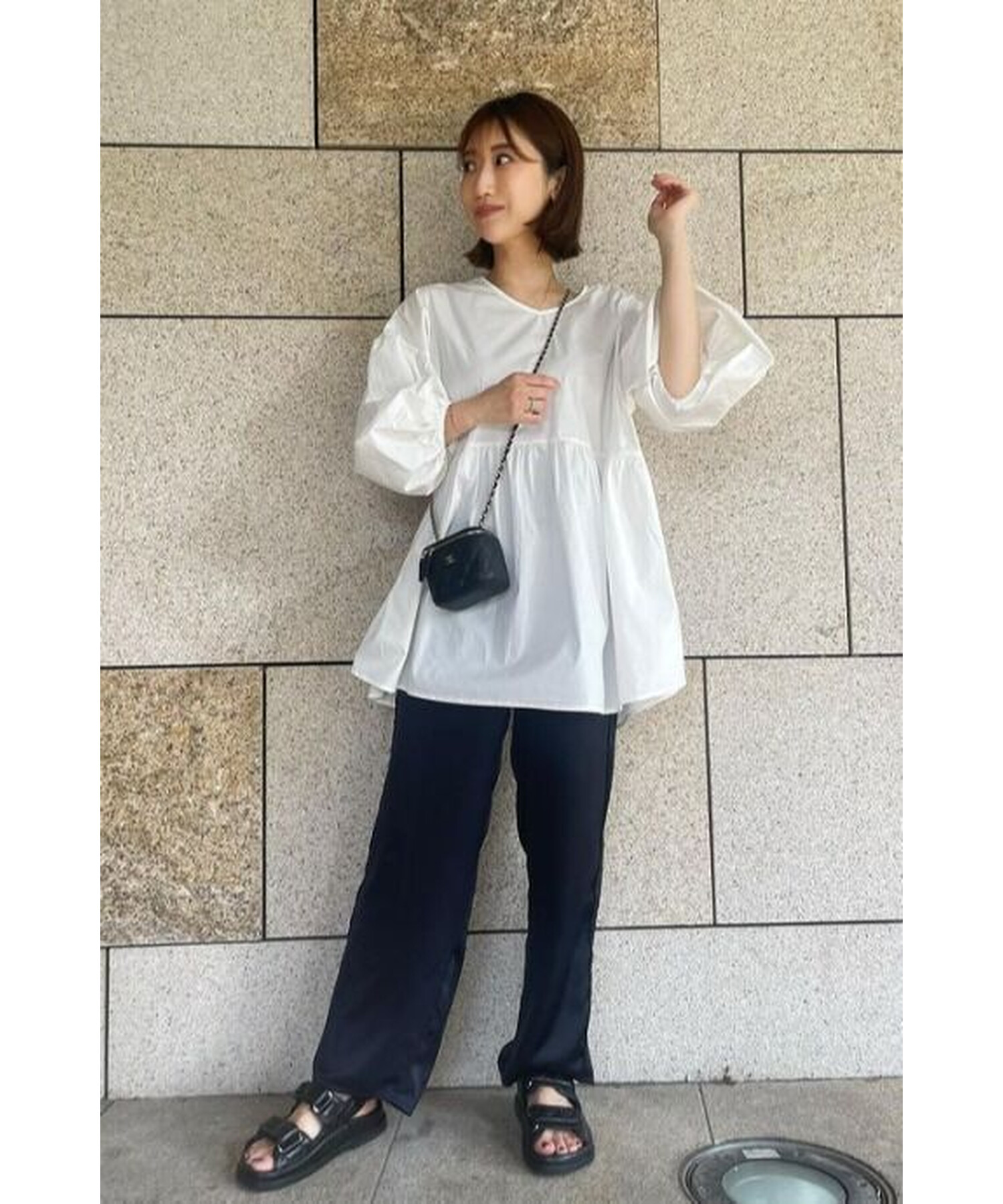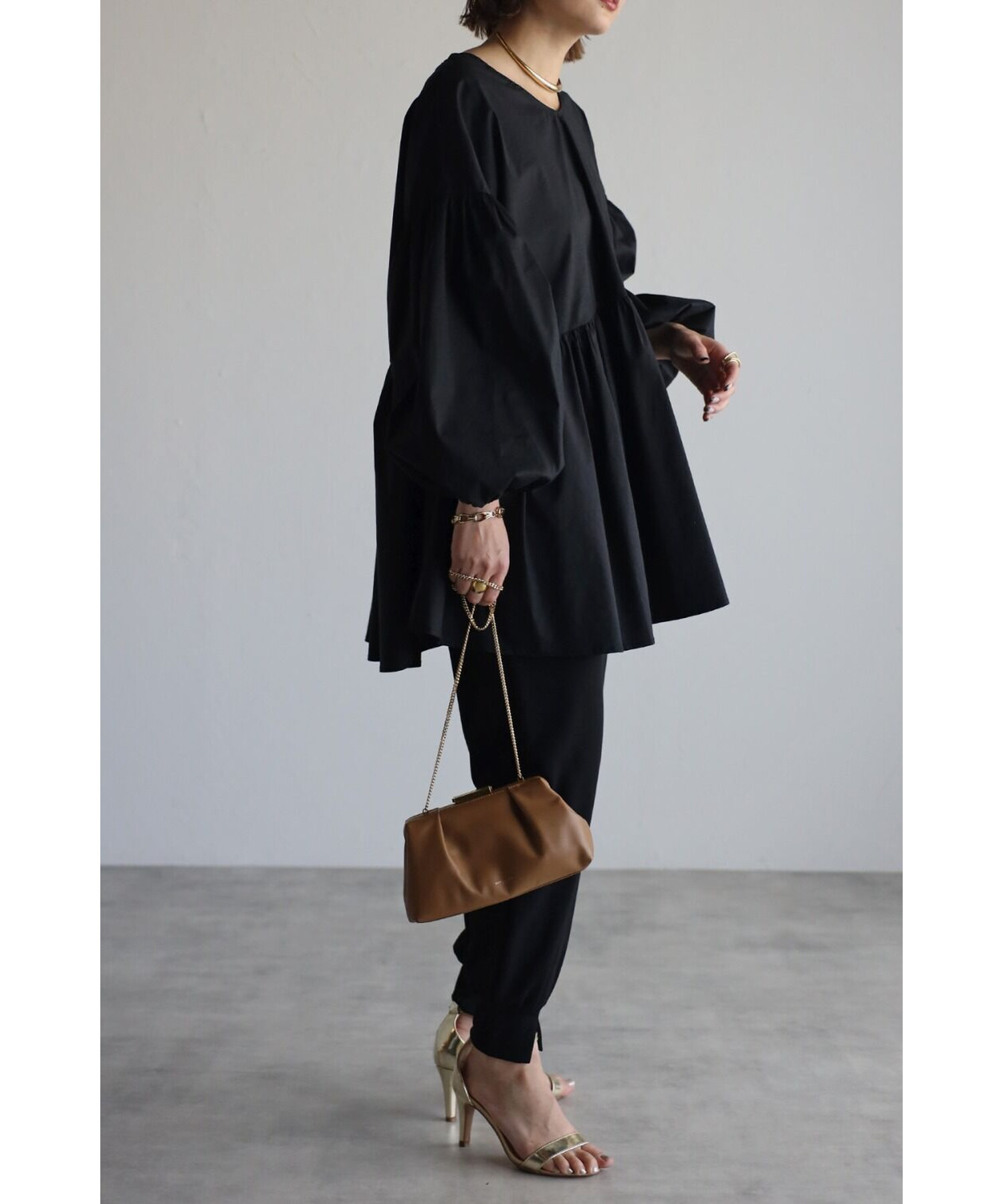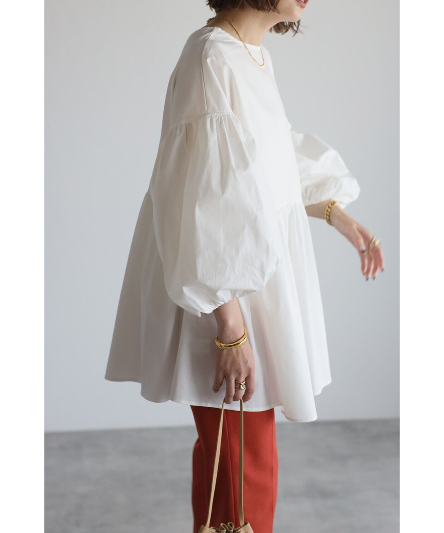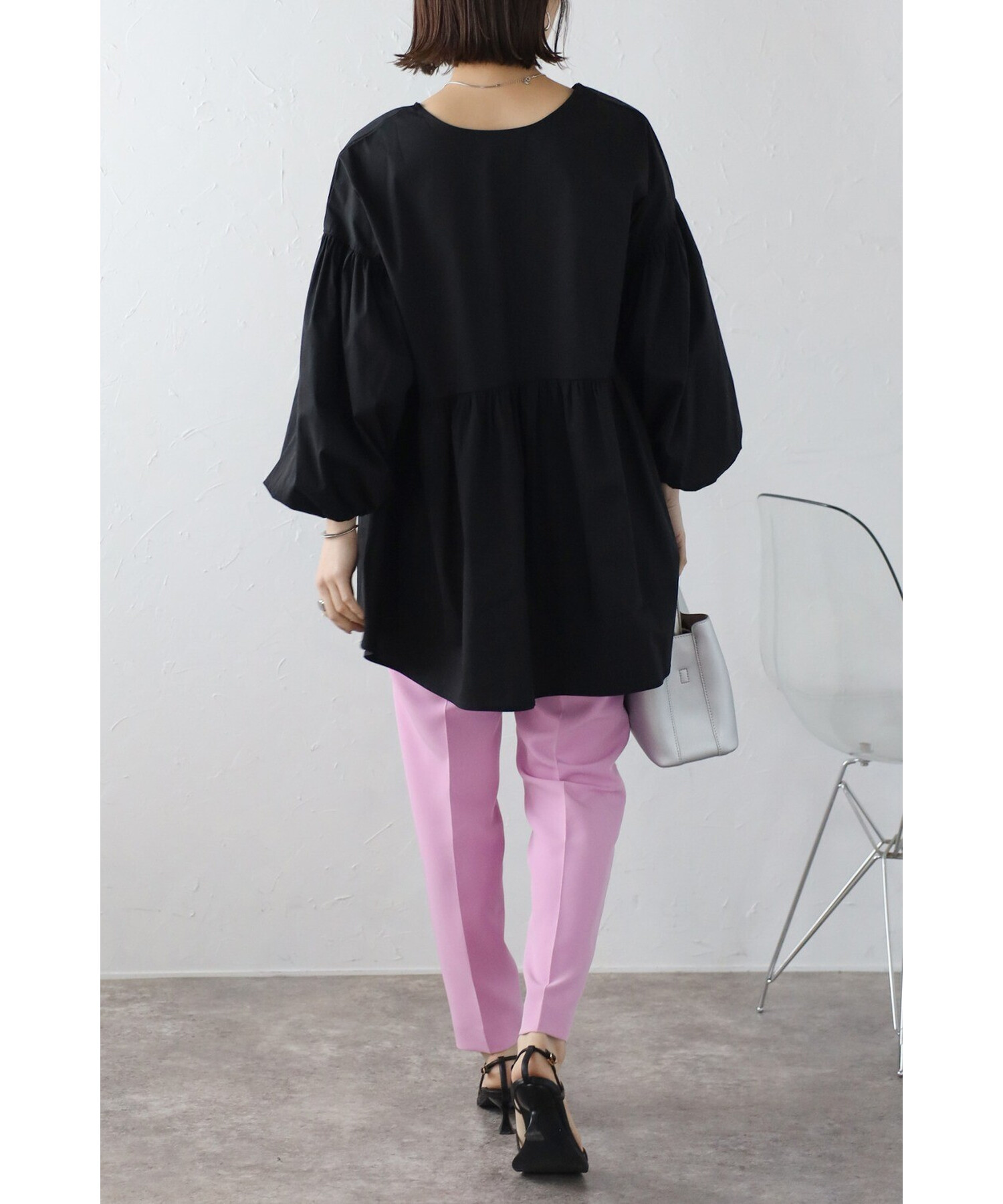 ボリューム感が可愛いブラウスはリブレギンスやテーパードパンツなどと相性抜群。