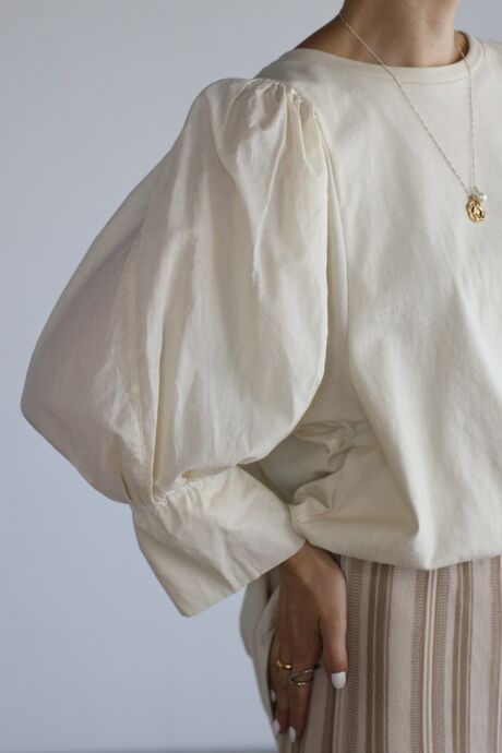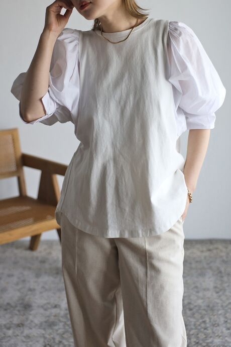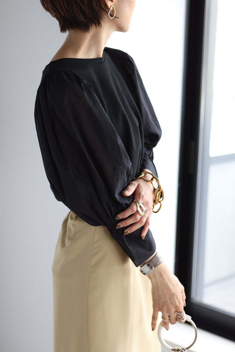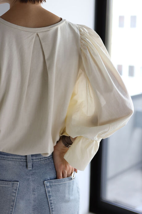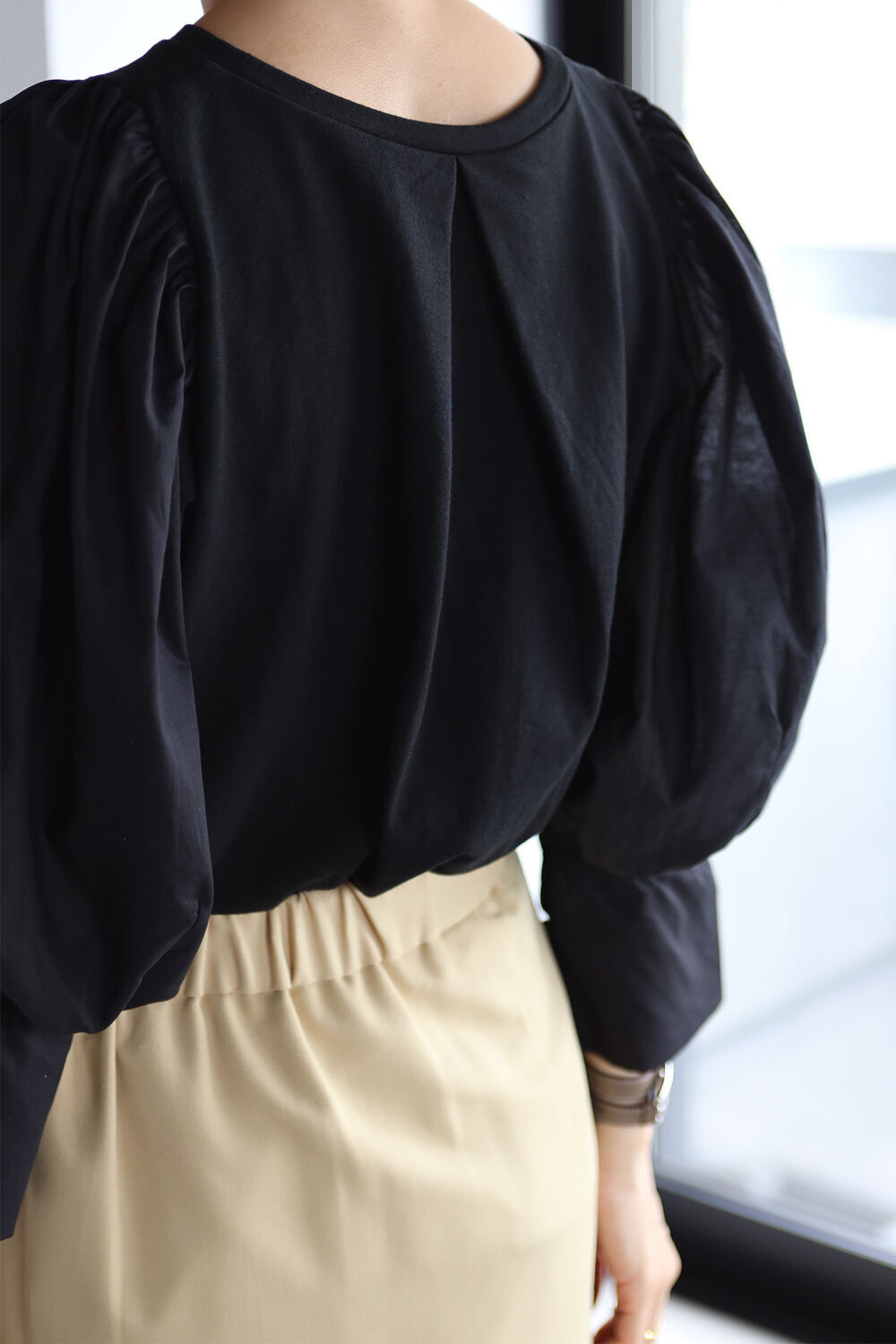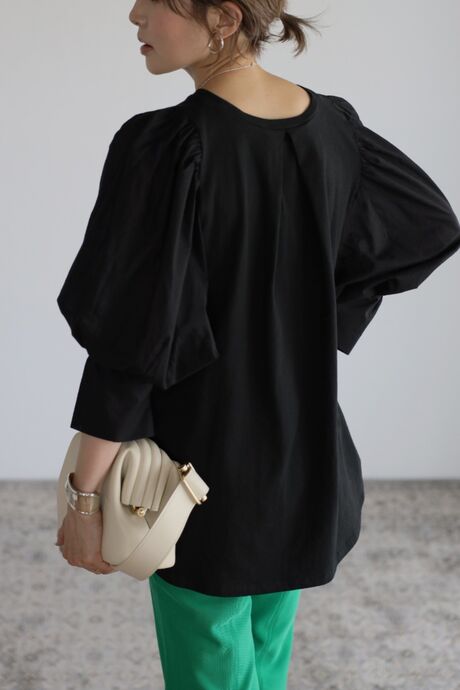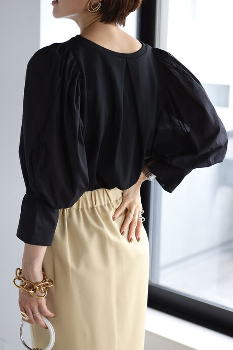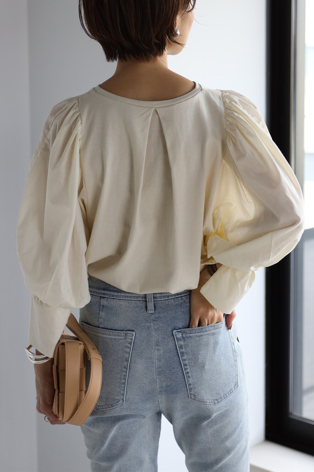 袖のふんわりとした異素材のディテールが目を惹くトップス。